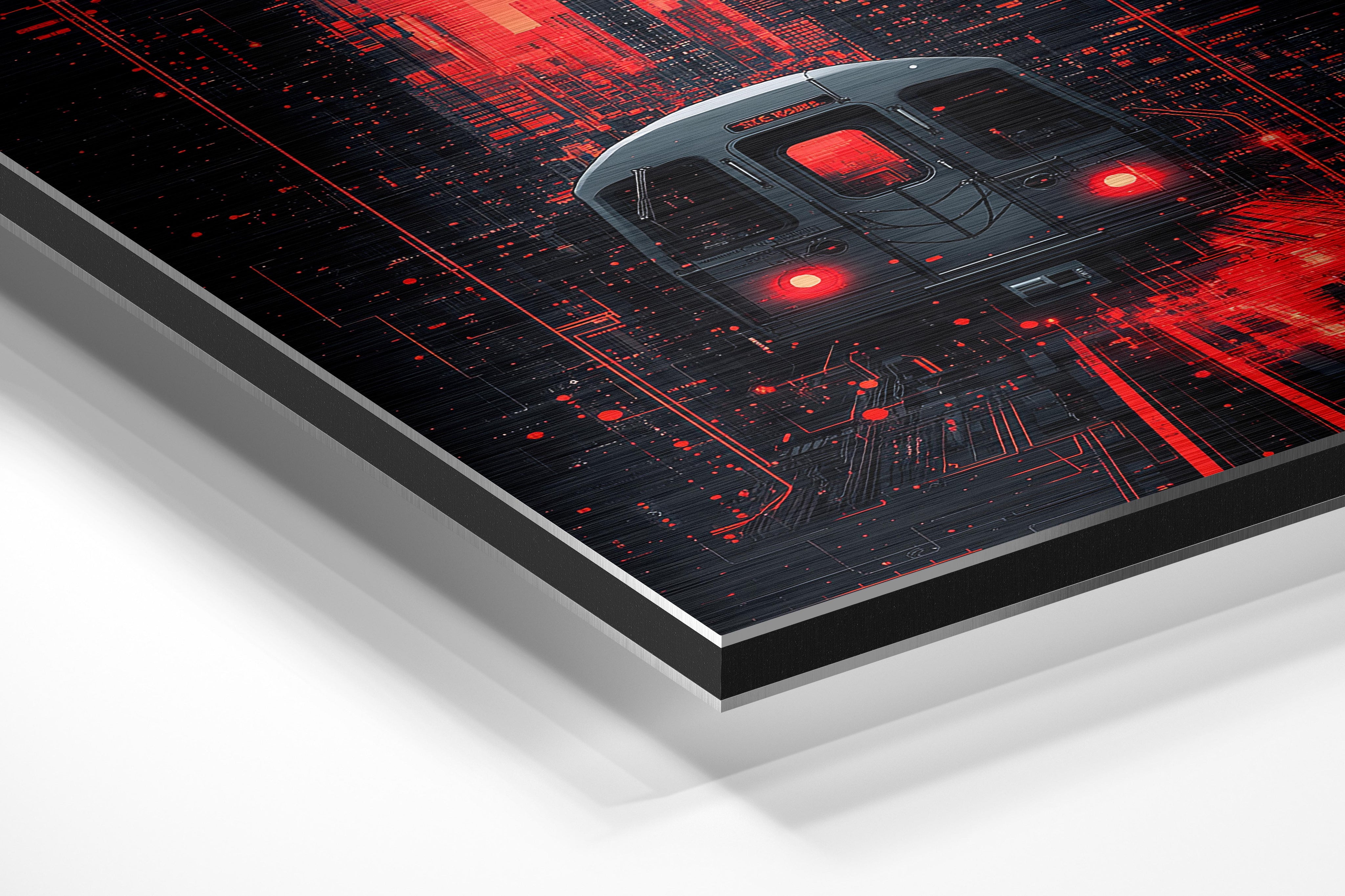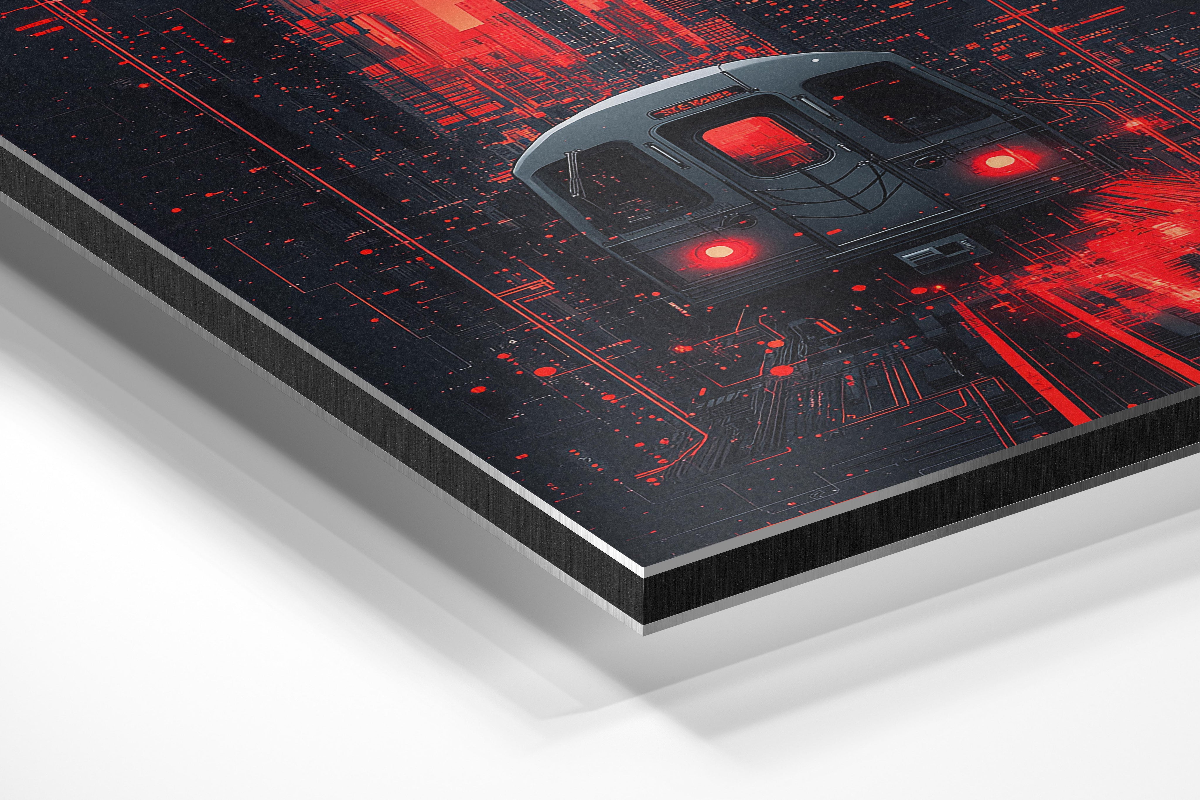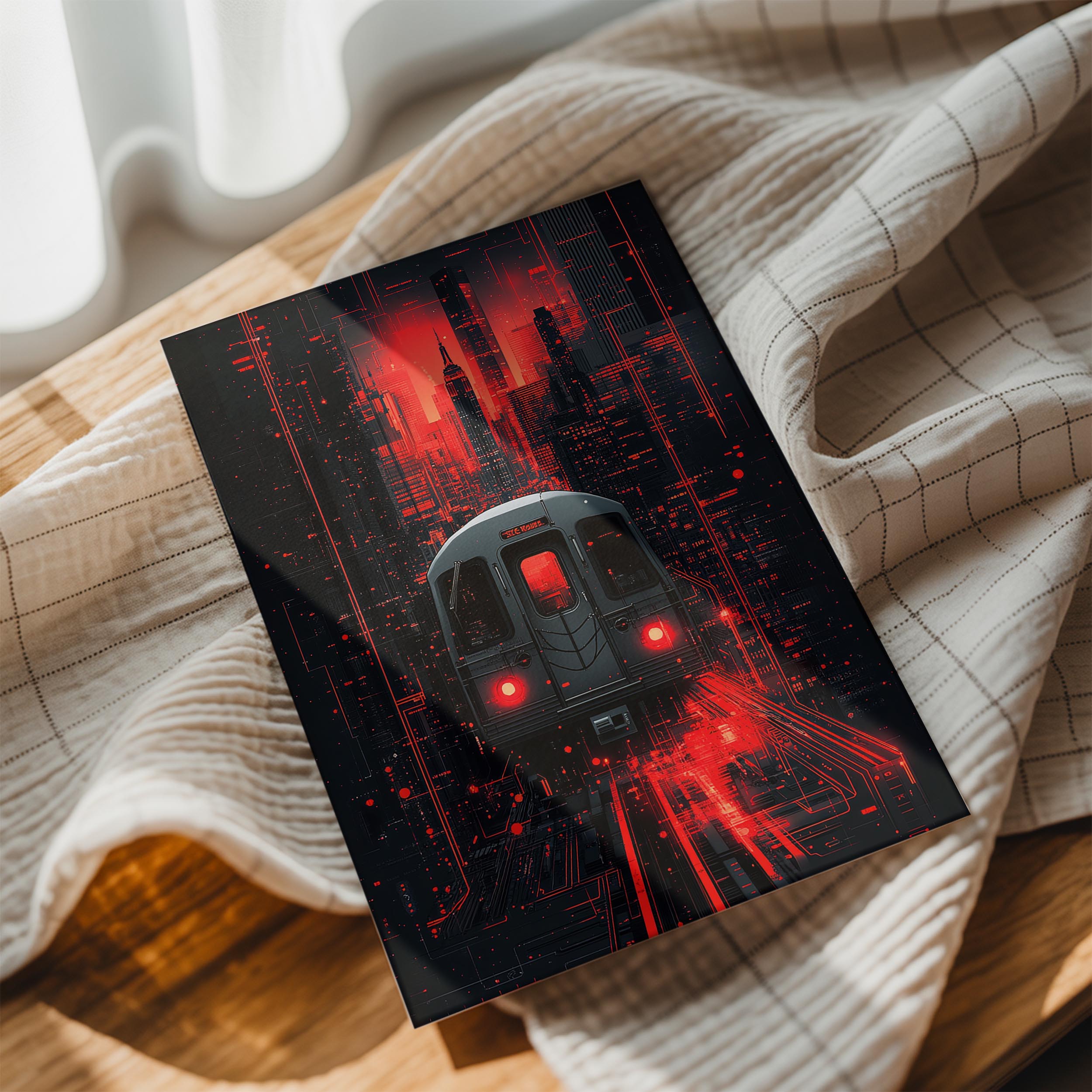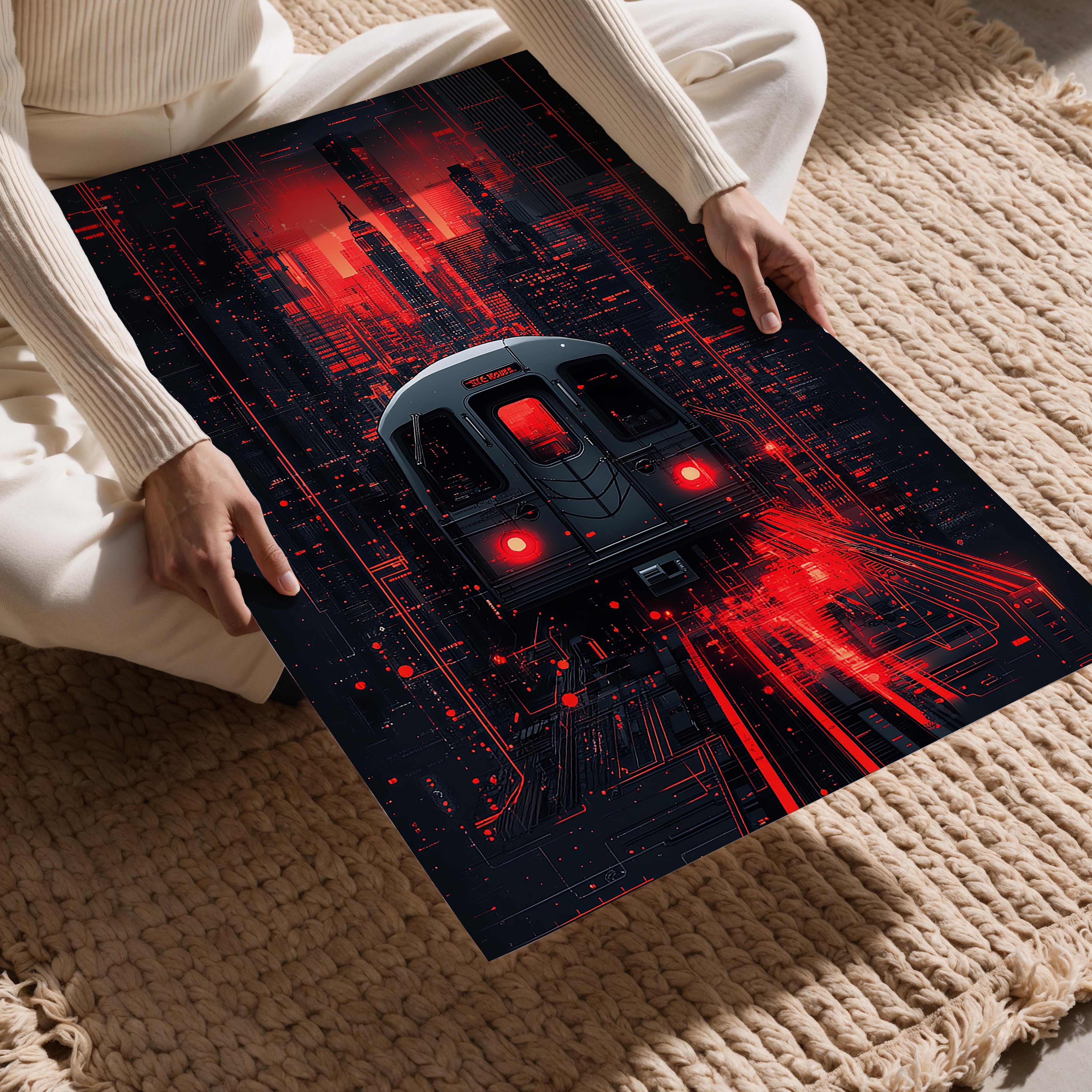 This dynamic artwork showcases a futuristic train illuminated in red, set against a glowing cyberpunk cityscape. The deep black background enhances the vibrant red details, creating a sense of speed, intensity, and modernity. Ideal for enthusiasts of sci-fi and high-tech themes, this piece would bring energy to gaming rooms, tech hubs, or urban lofts. Its bold colors and intricate design captivate the viewer, making it a statement piece that inspires imagination and creativity.