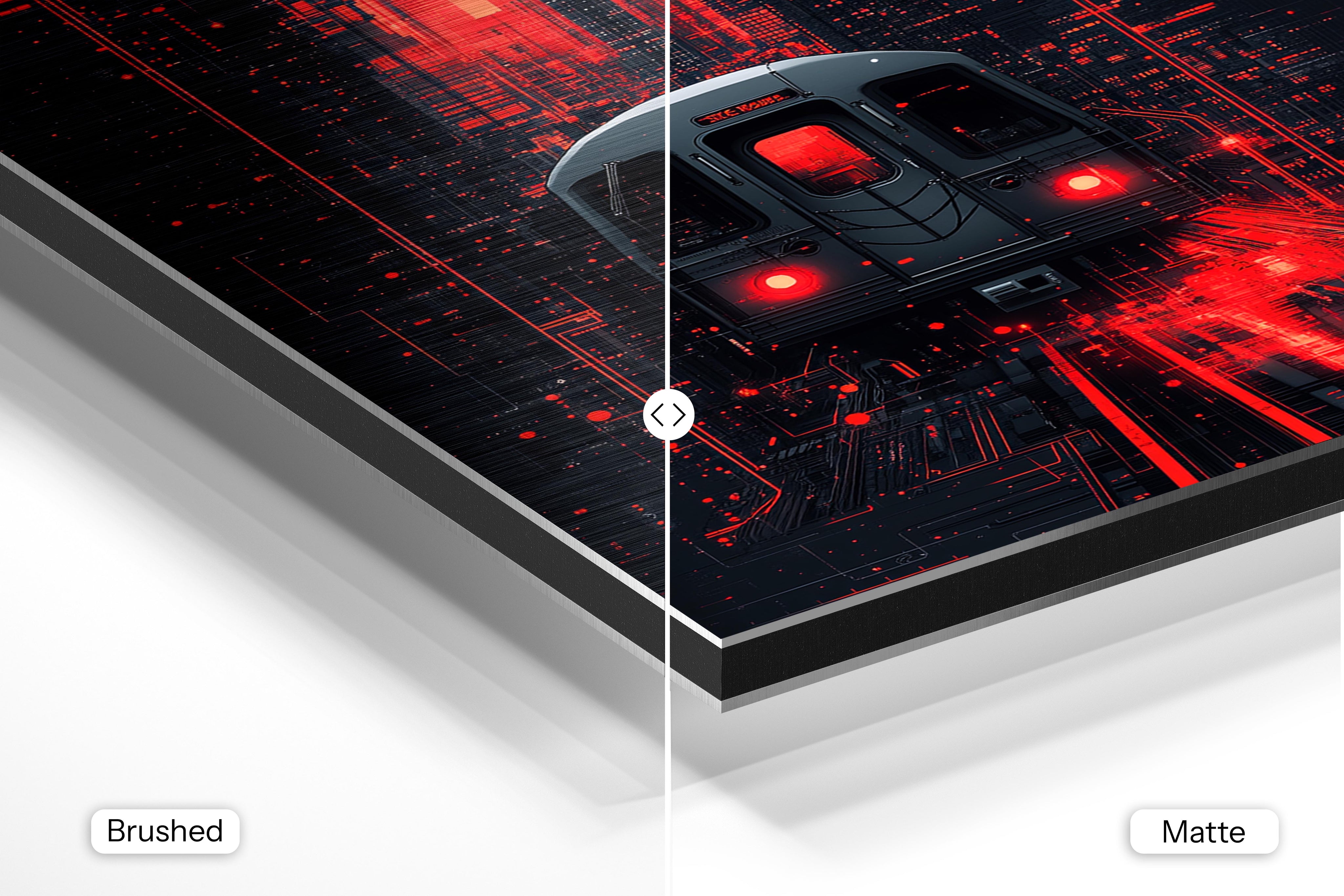 - Brushed Aluminum, on the other hand, features a raw metallic texture with visible brush strokes. Whites and highlights in your image let the silver surface show through, adding a dramatic, shimmering effect. Ideal for black-and-white images, minimalist designs, or abstract art, it creates a bold, industrial vibe with a modern edge.