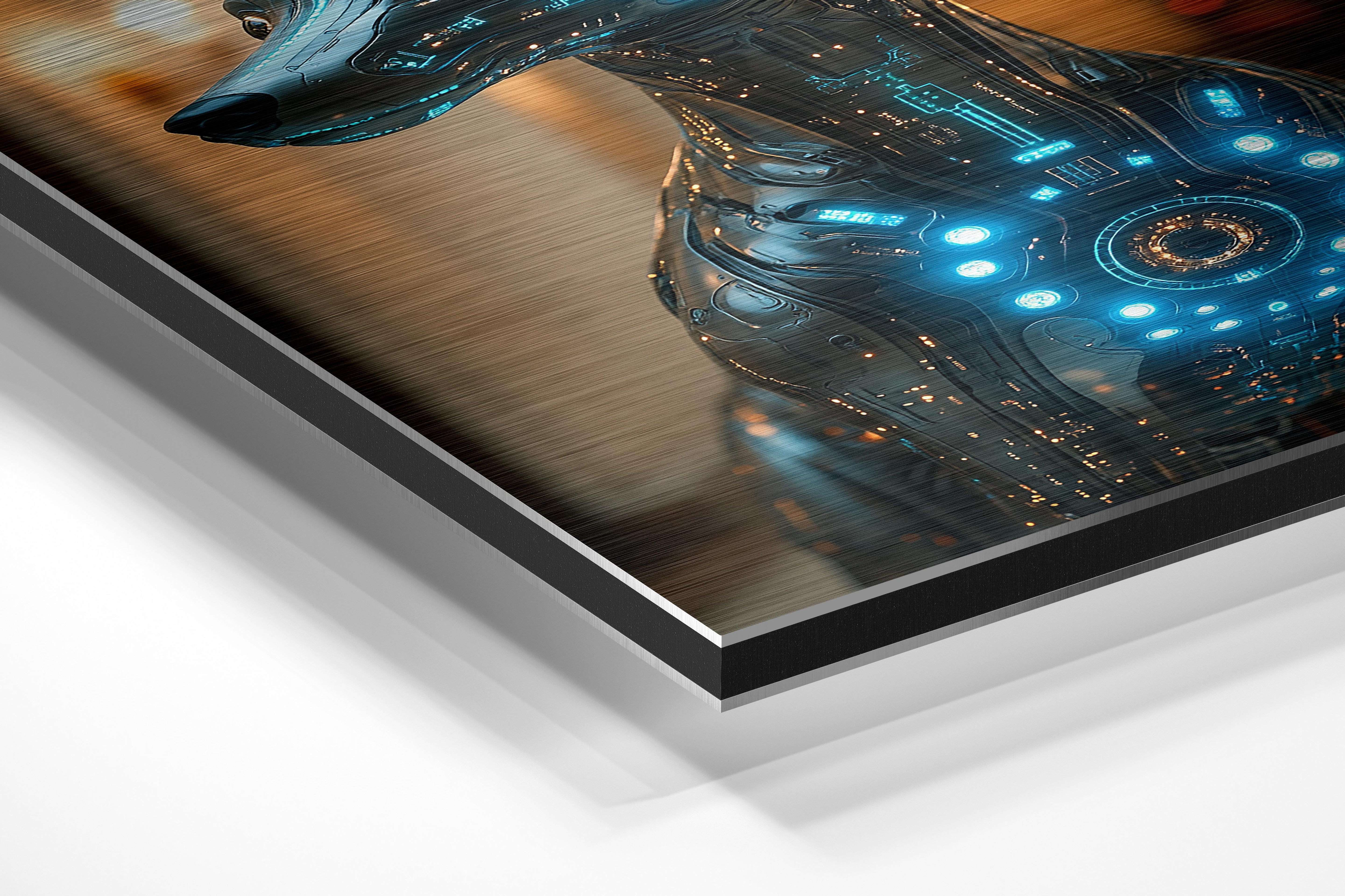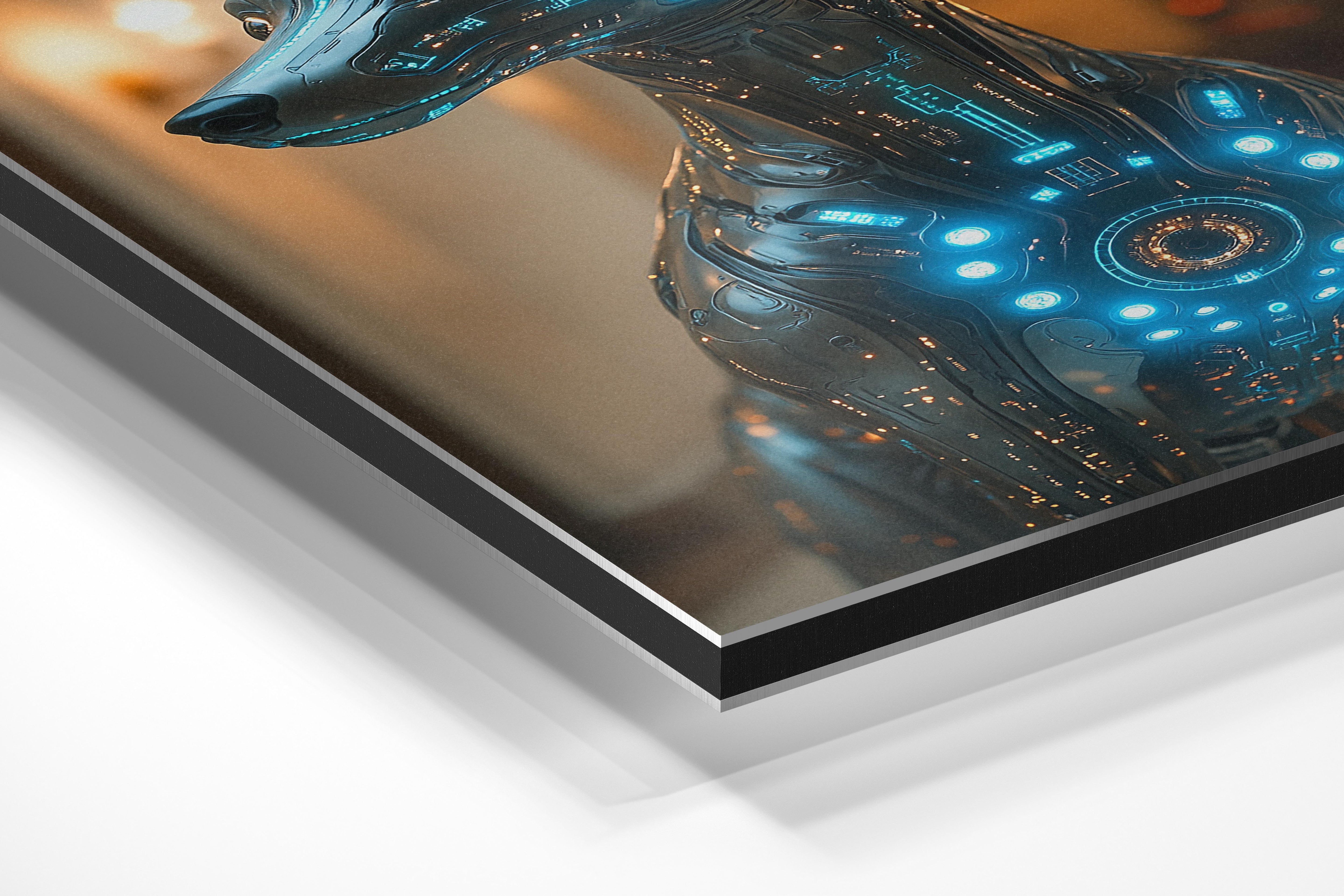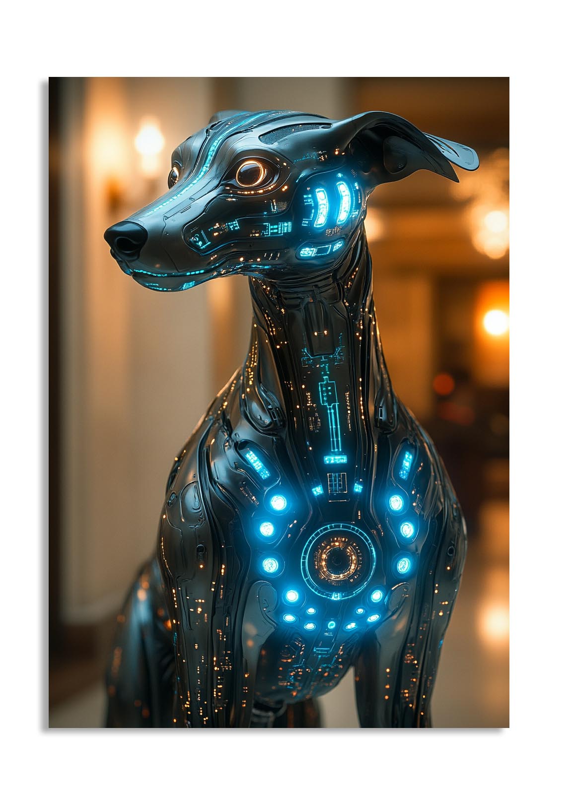 A highly detailed cybernetic dog with glowing blue circuits, blending sleek futuristic design with lifelike features. The metallic finish and intricate circuitry evoke both intelligence and loyalty. This artwork is perfect for sci-fi enthusiasts, tech-themed offices, or gaming lounges.
