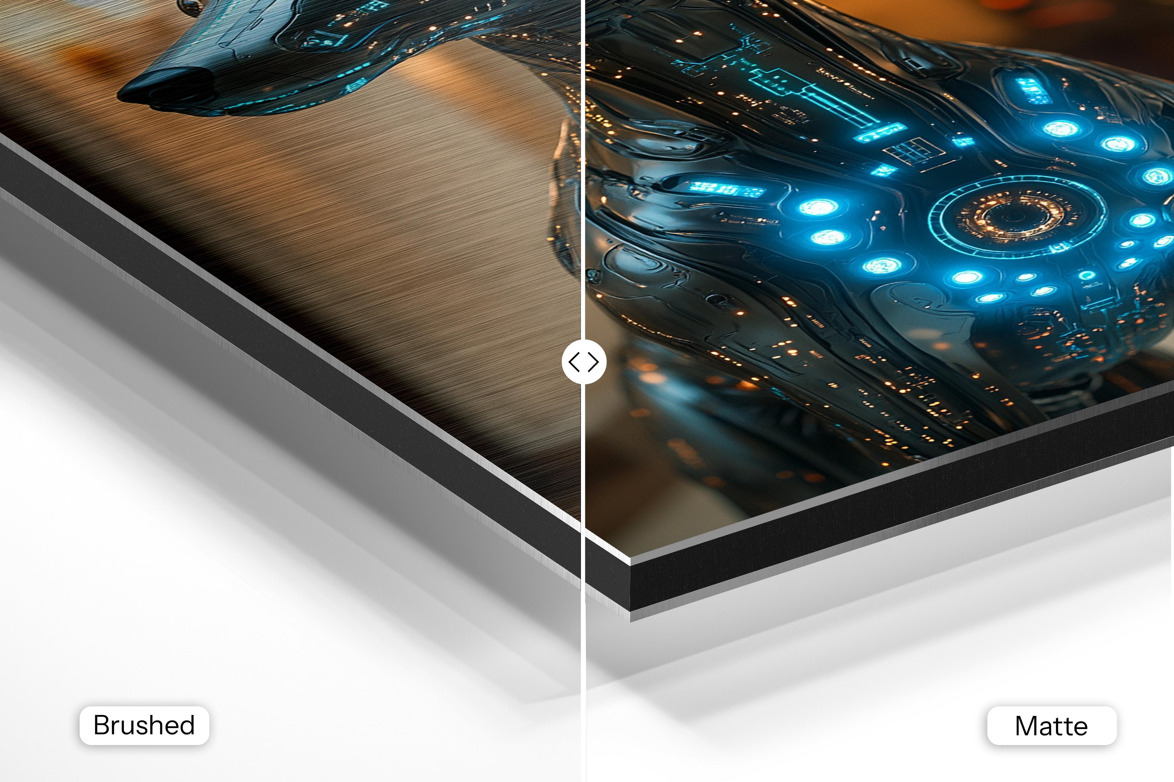 - Brushed Aluminum, on the other hand, features a raw metallic texture with visible brush strokes. Whites and highlights in your image let the silver surface show through, adding a dramatic, shimmering effect. Ideal for black-and-white images, minimalist designs, or abstract art, it creates a bold, industrial vibe with a modern edge.