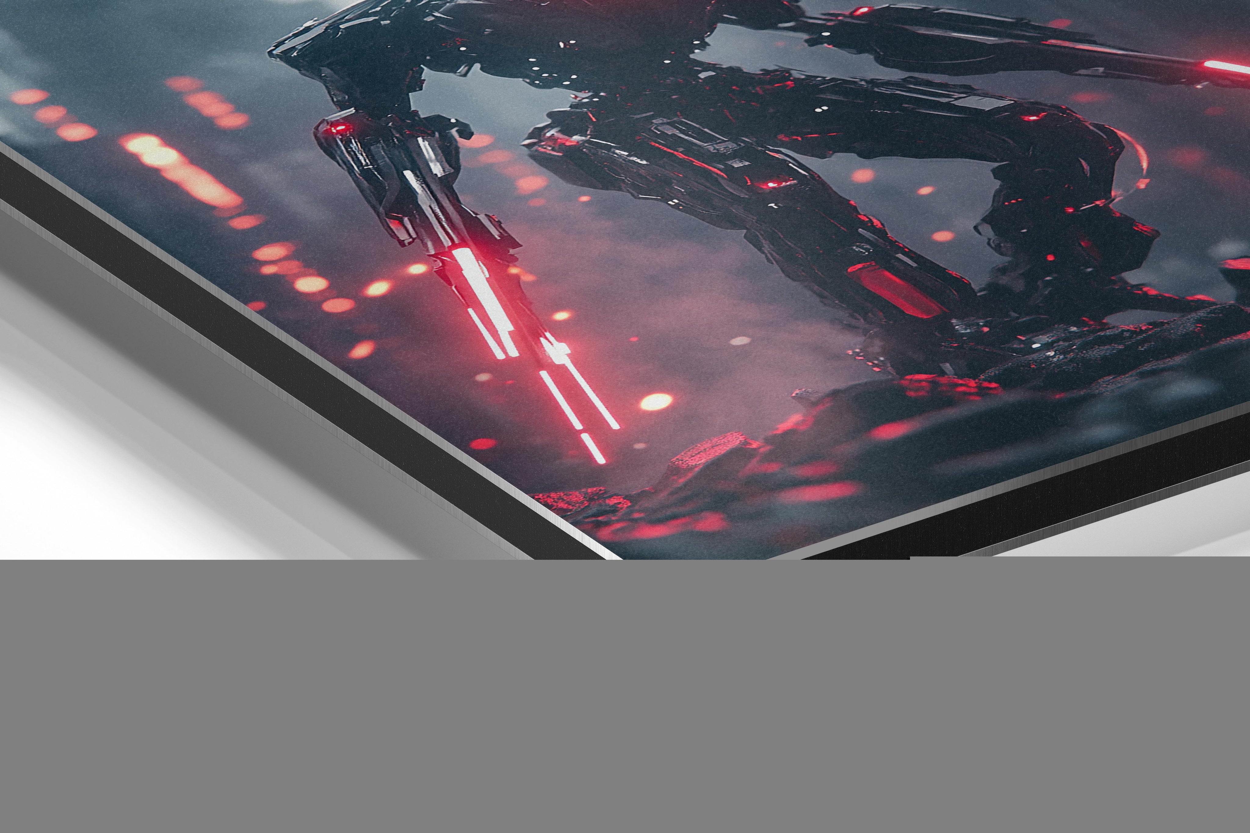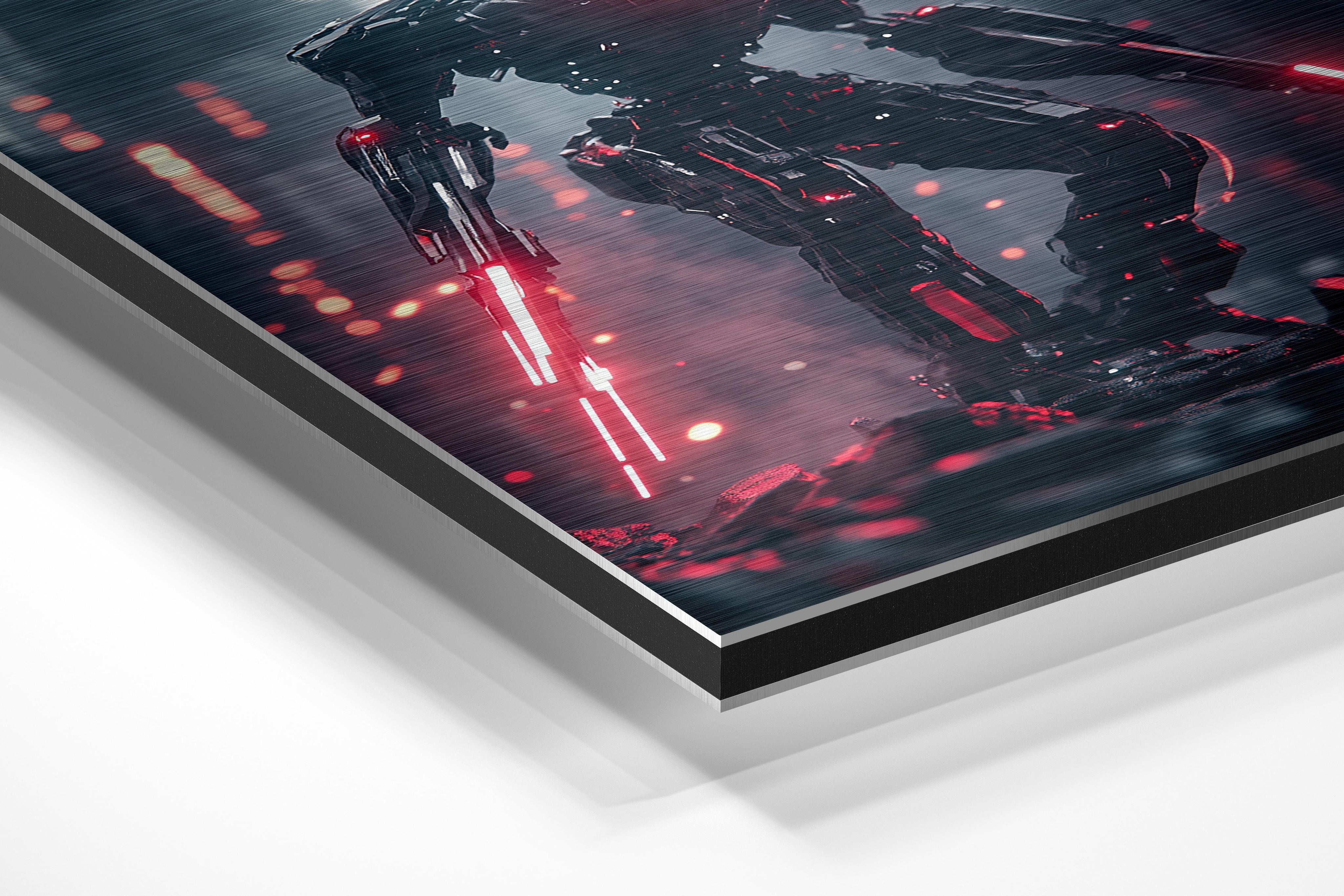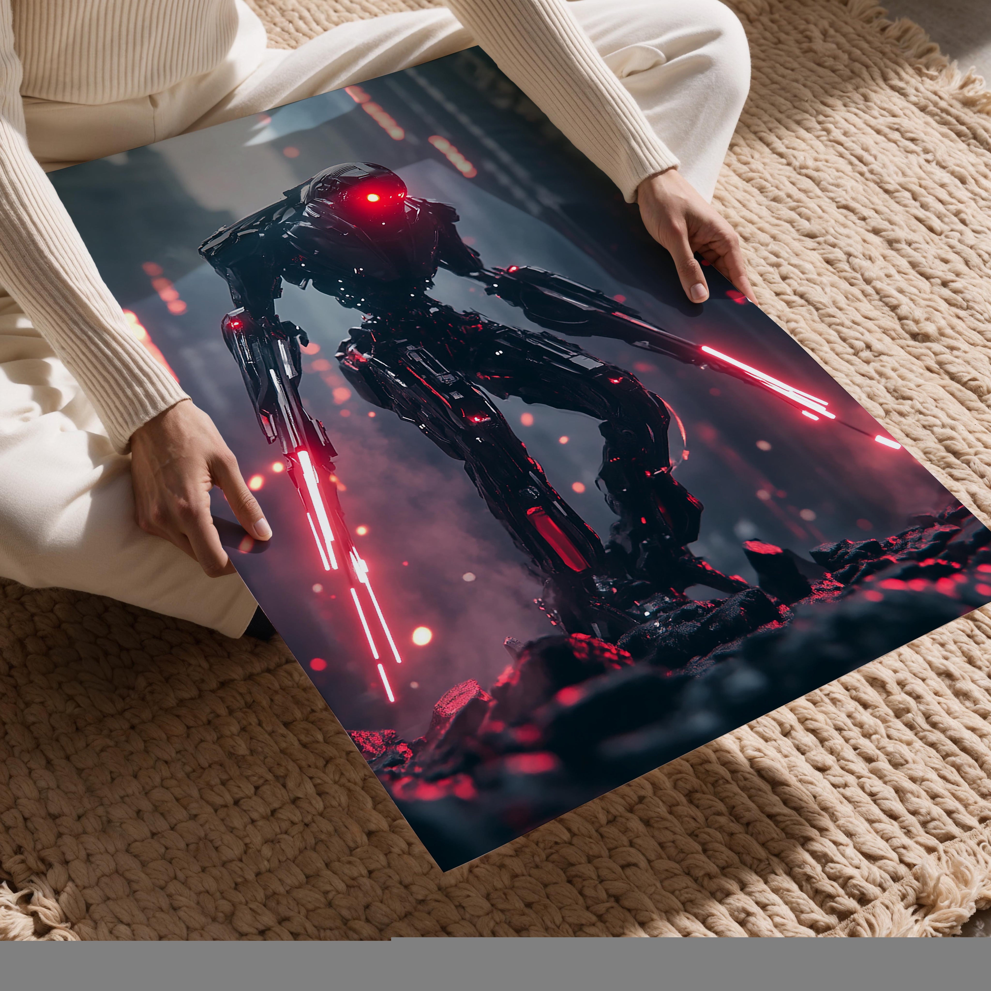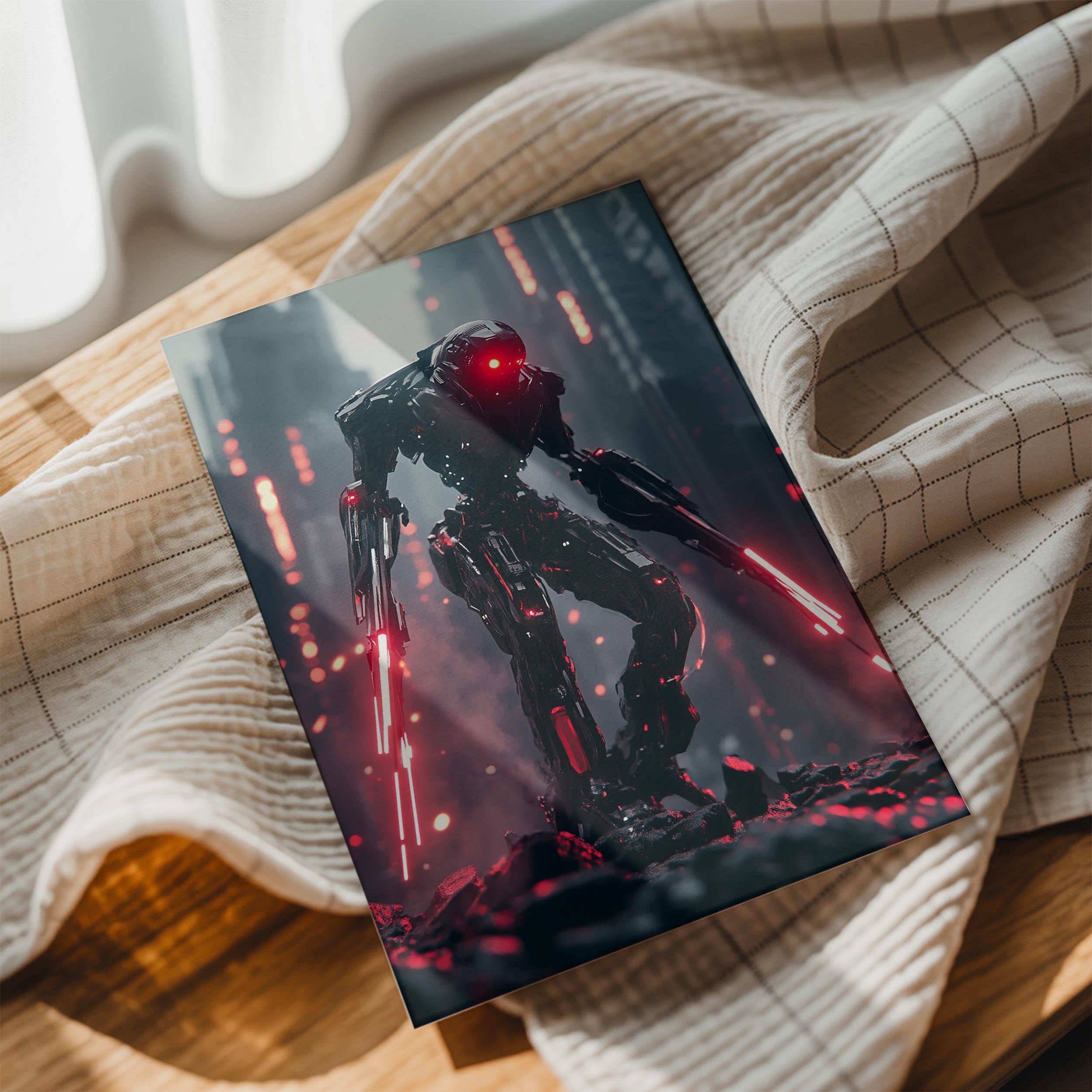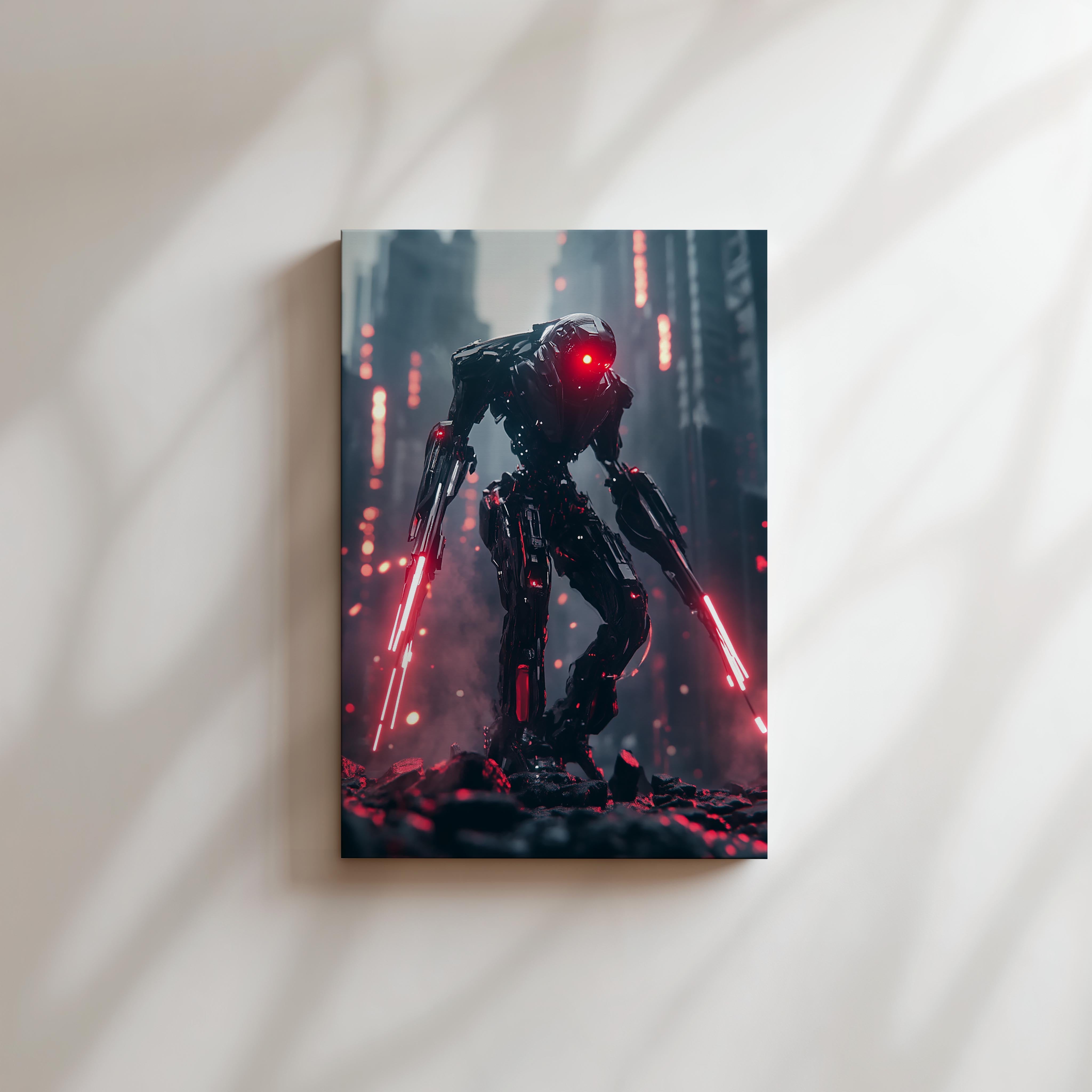 A menacing cybernetic figure armed with glowing red weapons stands amidst a dystopian cityscape. The intense contrast of red and dark metallic tones highlights the high-tech, high-stakes atmosphere. This image is perfect for fans of cyberpunk and futuristic art, fitting seamlessly in gaming rooms or sci-fi-themed spaces. Its dramatic tension and bold composition make it an unforgettable visual experience.