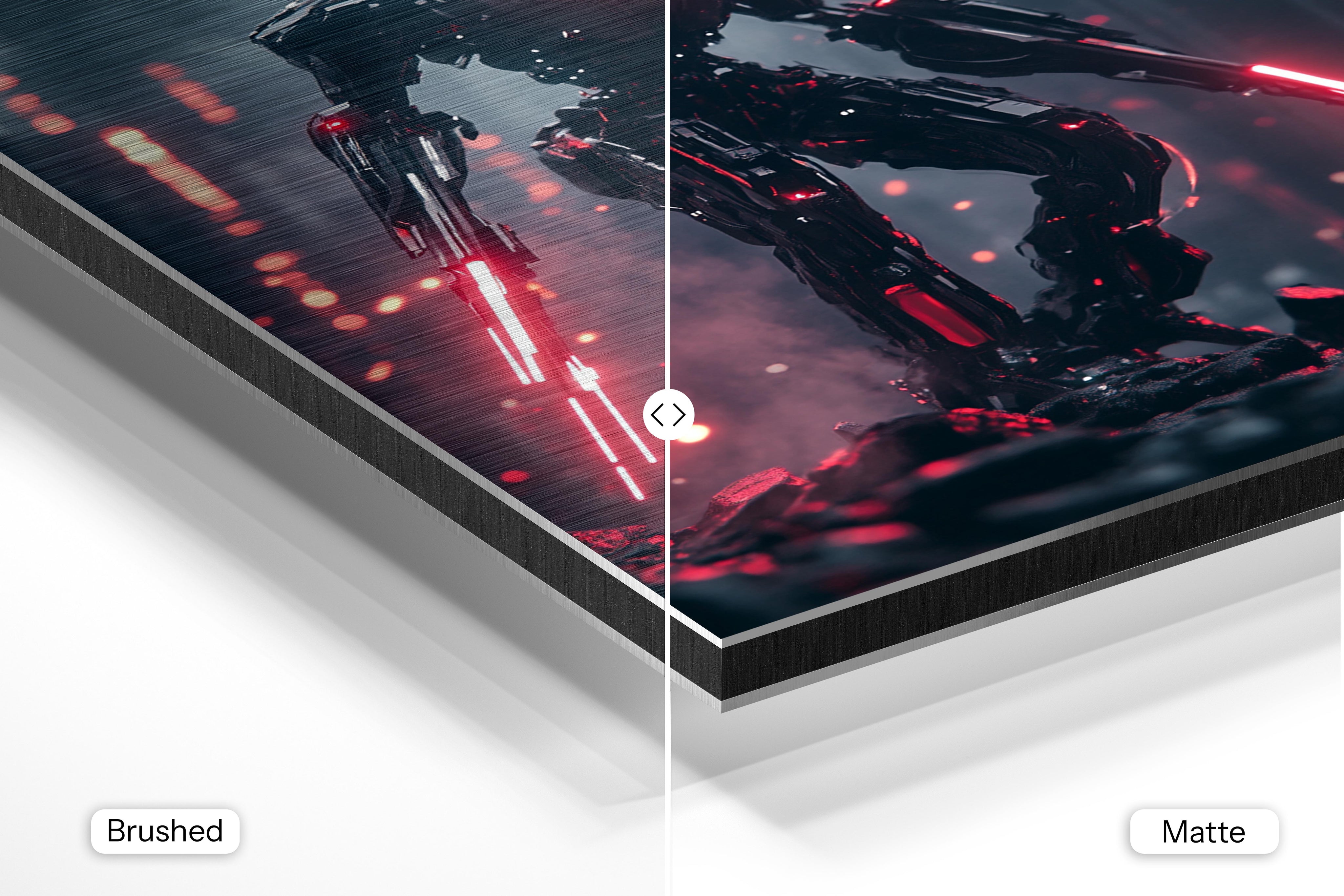 - Brushed Aluminum, on the other hand, features a raw metallic texture with visible brush strokes. Whites and highlights in your image let the silver surface show through, adding a dramatic, shimmering effect. Ideal for black-and-white images, minimalist designs, or abstract art, it creates a bold, industrial vibe with a modern edge.