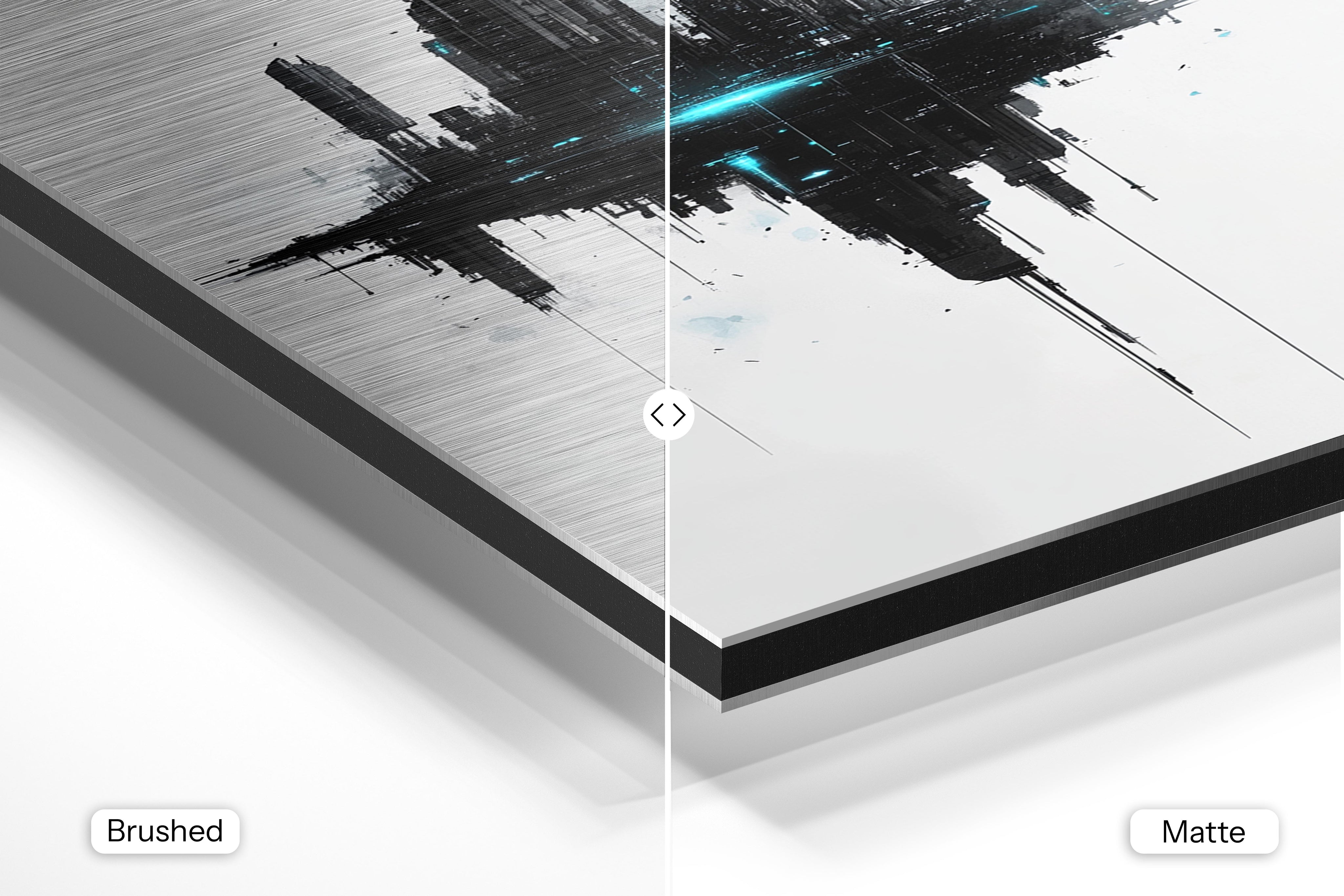 - Brushed Aluminum, on the other hand, features a raw metallic texture with visible brush strokes. Whites and highlights in your image let the silver surface show through, adding a dramatic, shimmering effect. Ideal for black-and-white images, minimalist designs, or abstract art, it creates a bold, industrial vibe with a modern edge.