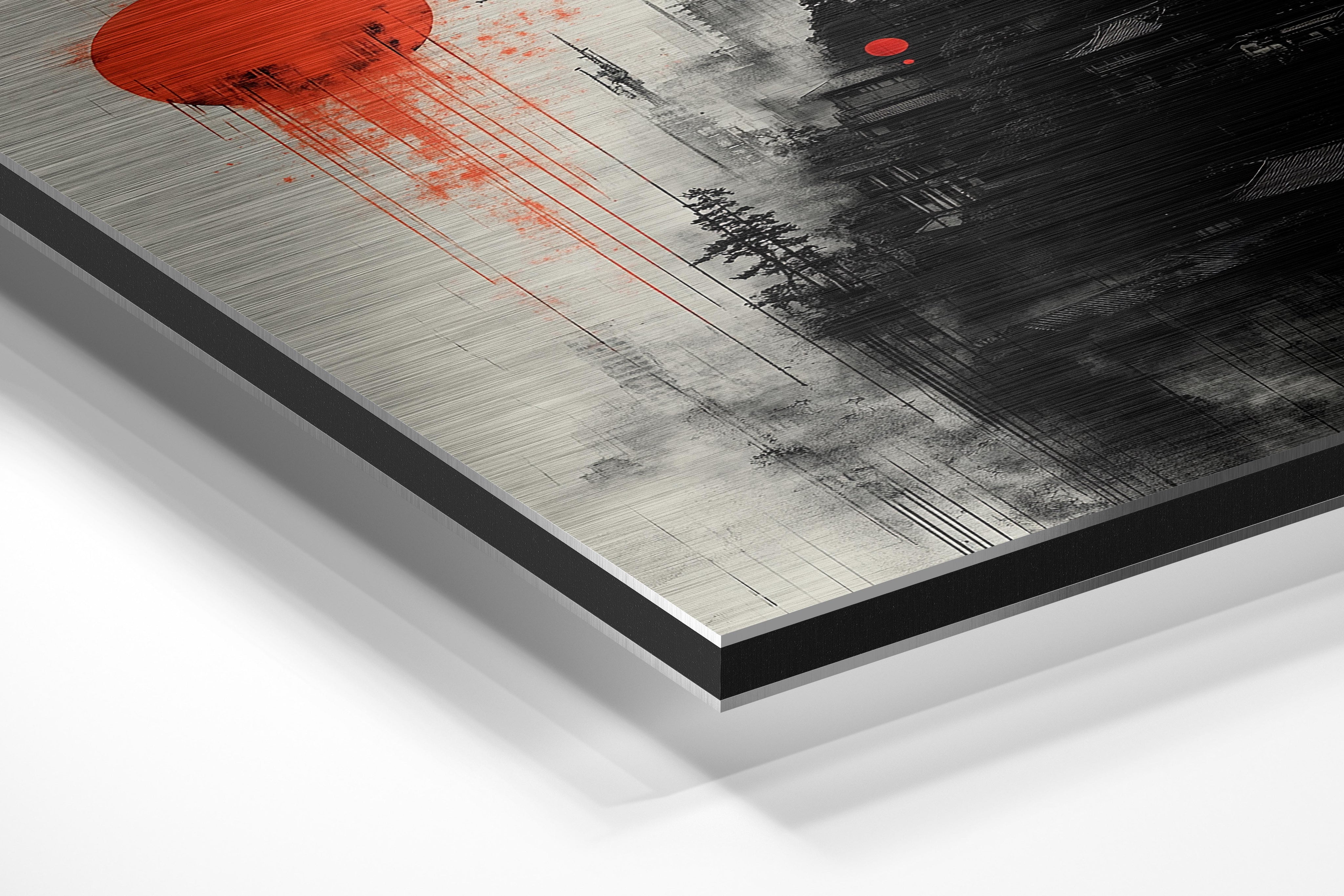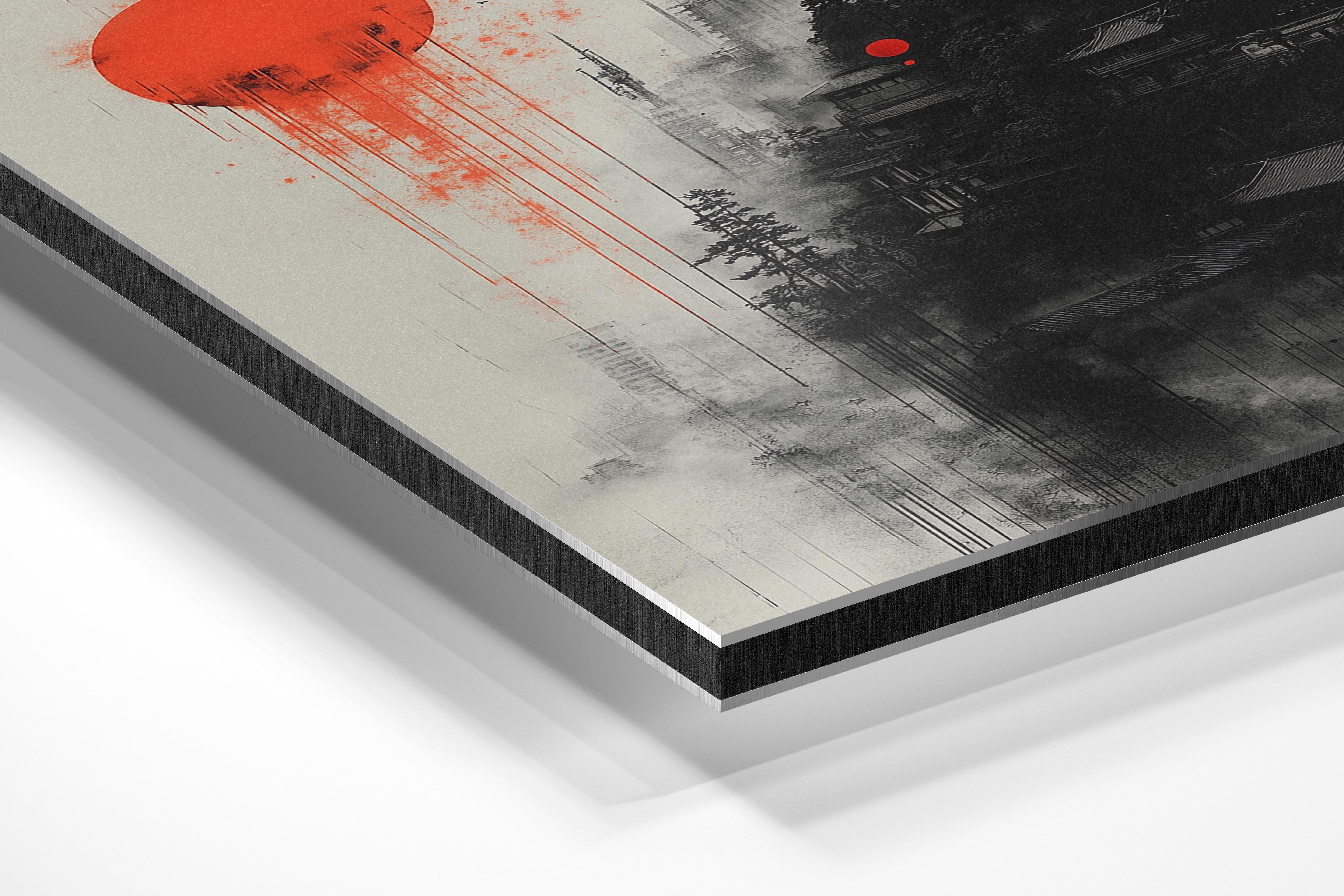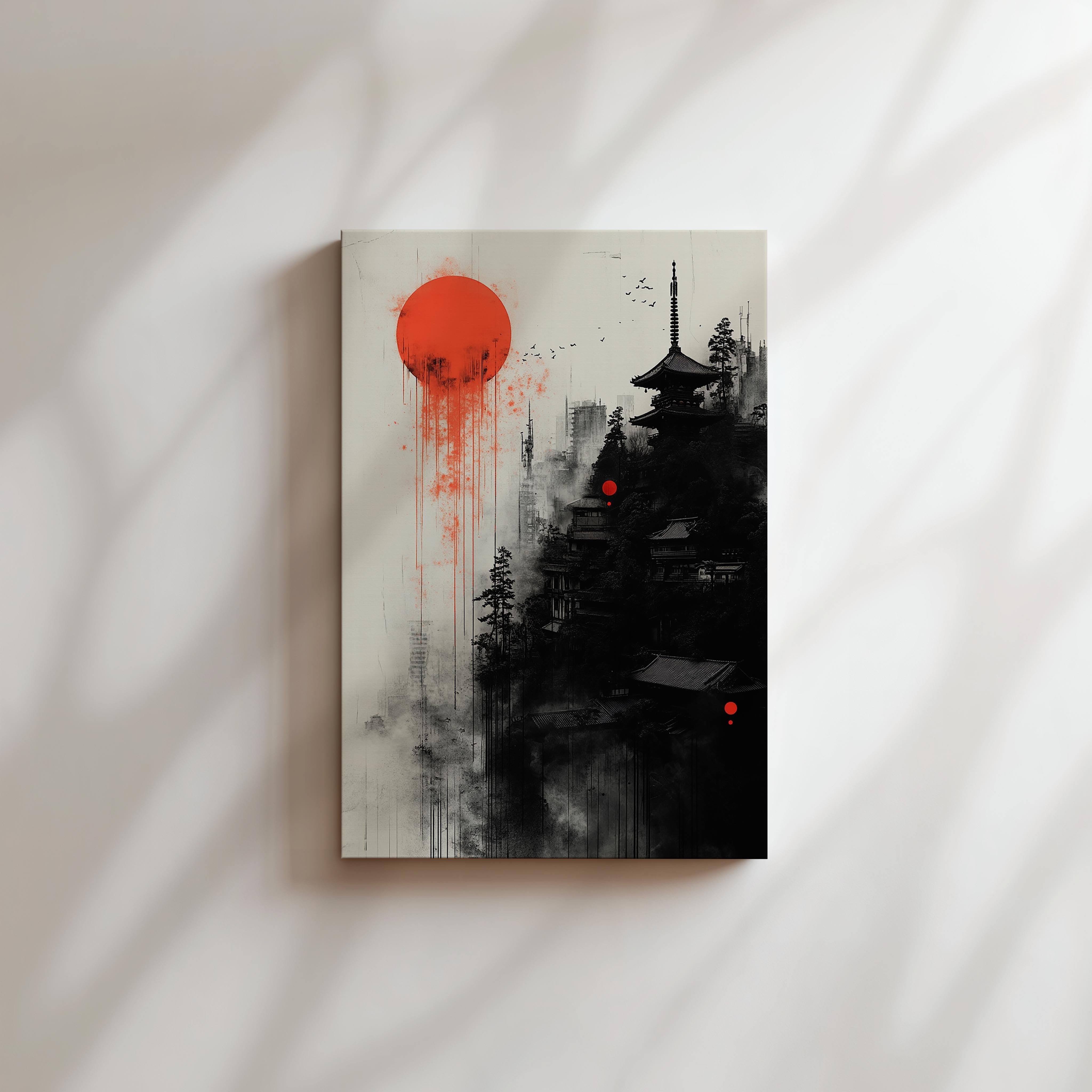 This hauntingly beautiful artwork showcases a cyberpunk-infused Japanese landscape, where traditional pagodas meet modern high-tech structures under a blood-red sun. The misty, shadowy elements add a layer of mystery, while the bold dripping red accents create an intense visual impact. This piece blends futuristic dystopian themes with ancient aesthetics, making it an excellent choice for those who love cyberpunk and Japanese art. It’s perfect for a creative space, bedroom, or an urban-themed setting, adding an atmospheric and thought-provoking presence to the room. The fusion of past and future in its design makes it an artistic masterpiece.