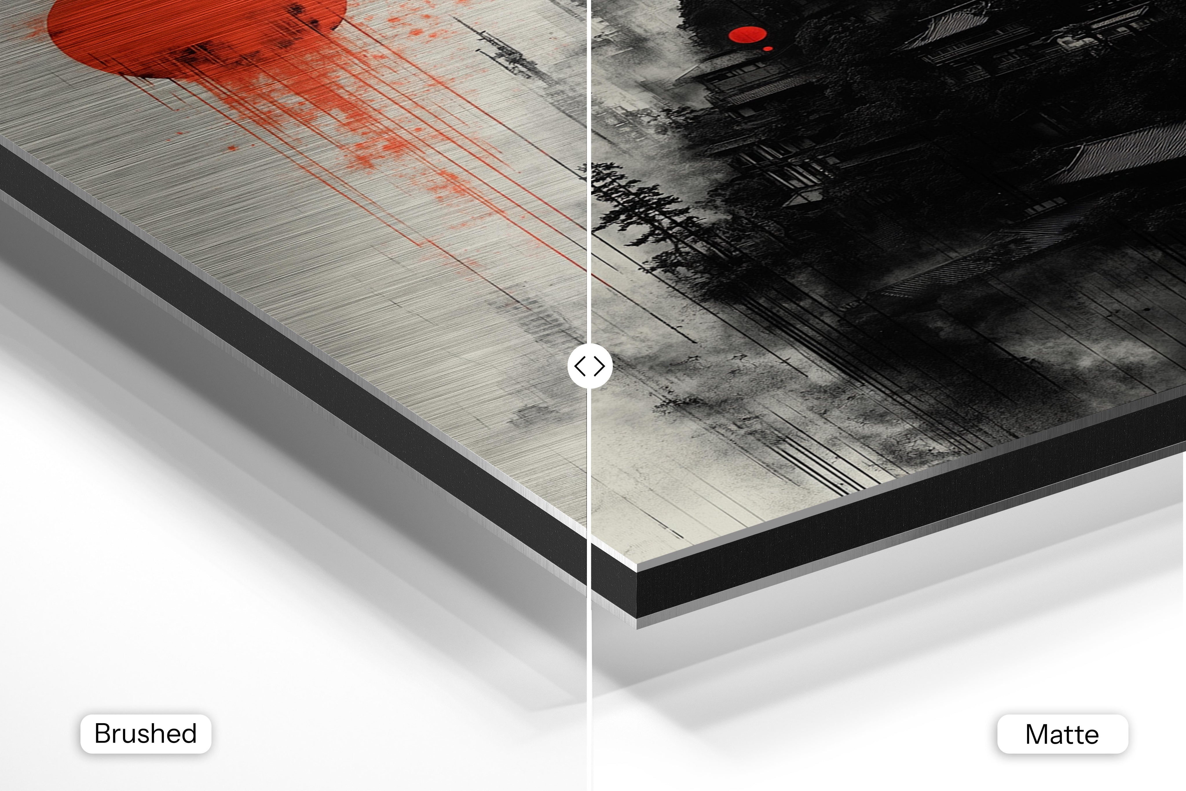 - Brushed Aluminum, on the other hand, features a raw metallic texture with visible brush strokes. Whites and highlights in your image let the silver surface show through, adding a dramatic, shimmering effect. Ideal for black-and-white images, minimalist designs, or abstract art, it creates a bold, industrial vibe with a modern edge.