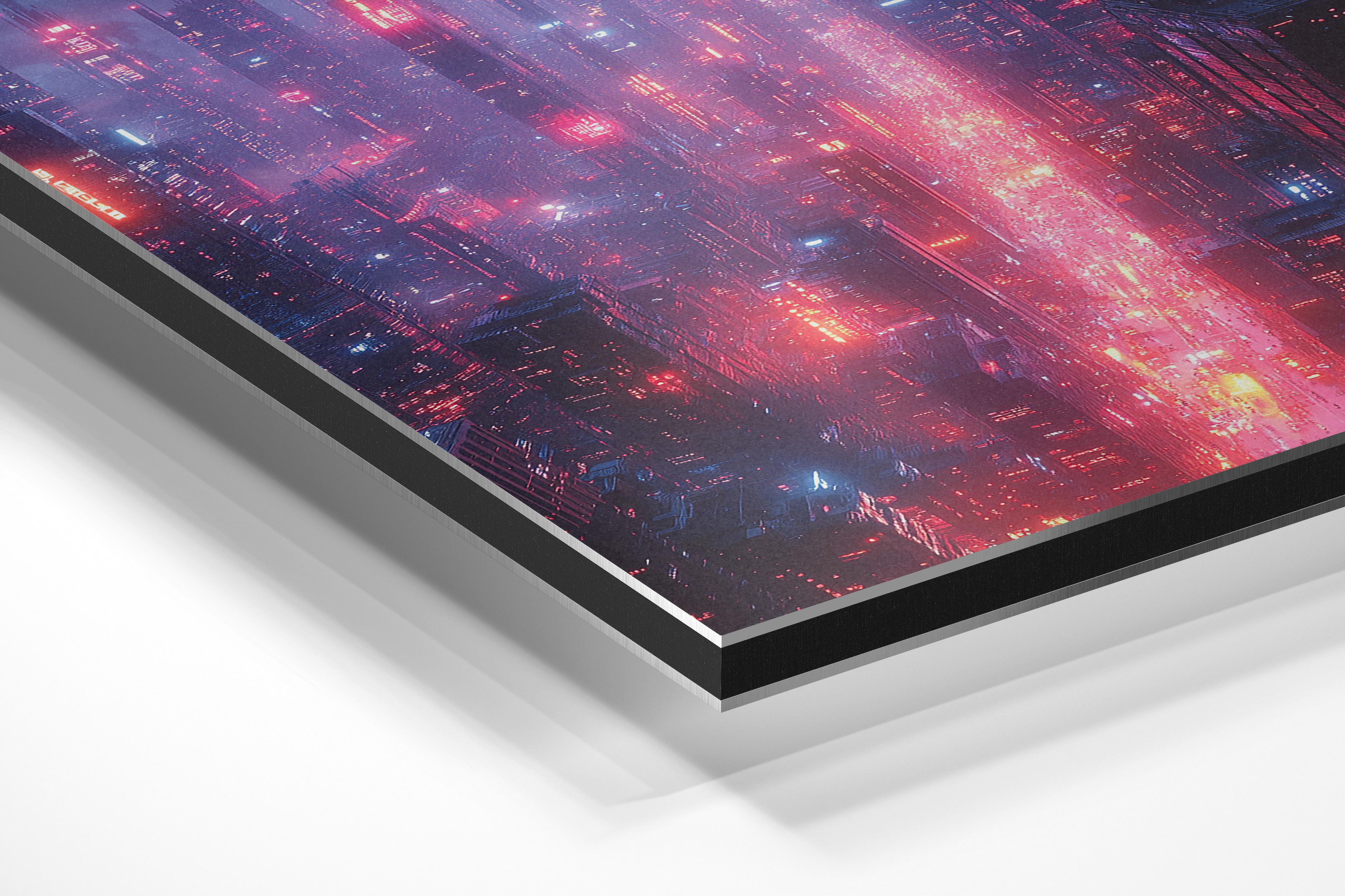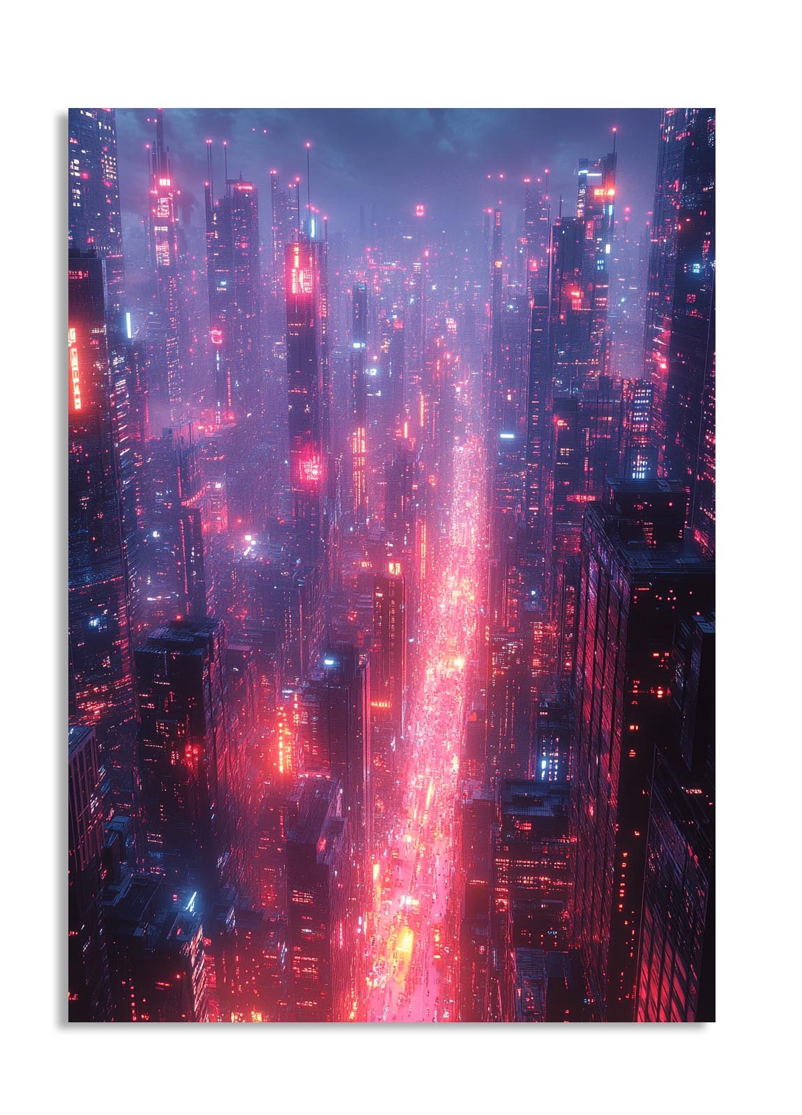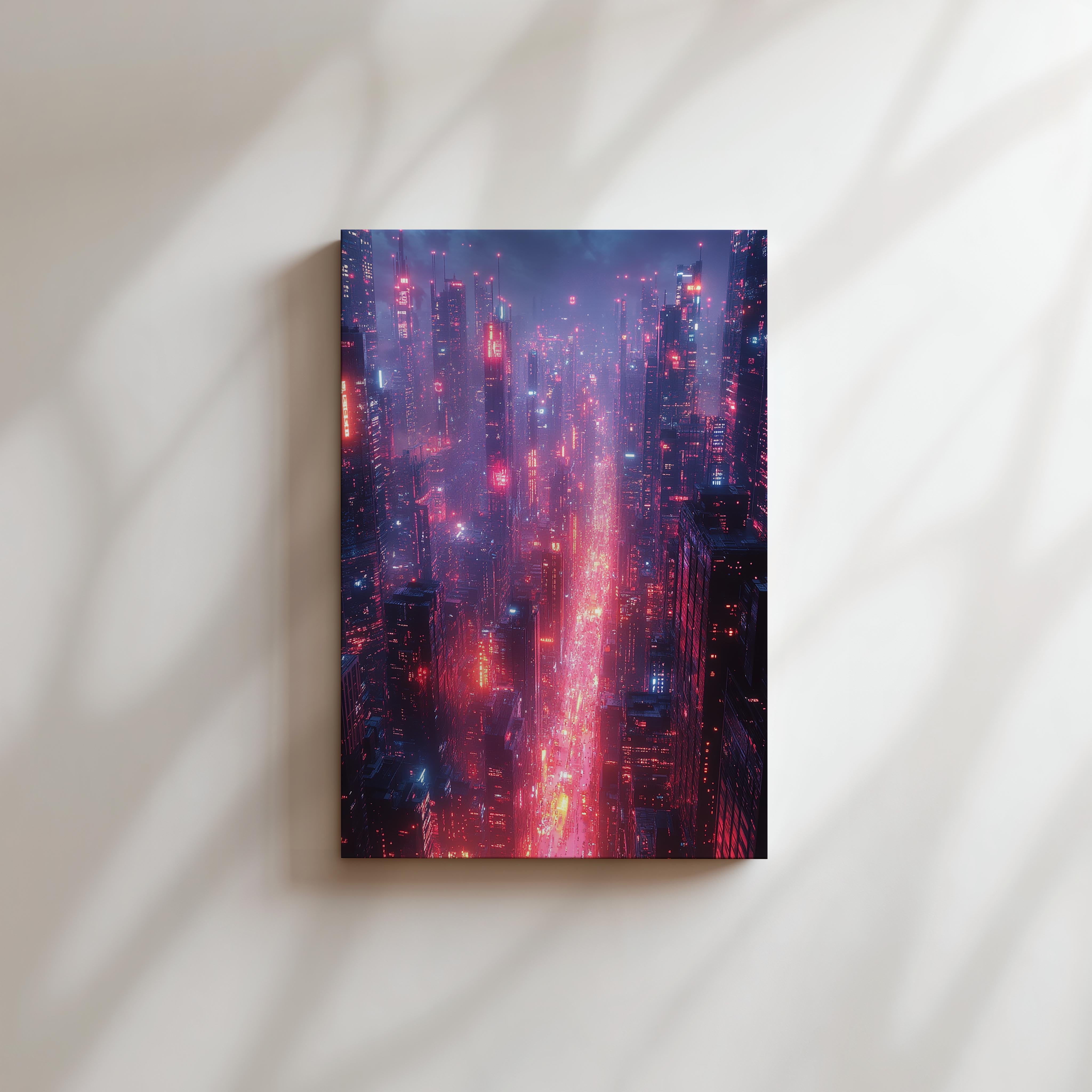 This artwork immerses the viewer into a sprawling futuristic cityscape, bathed in glowing red and blue neon. The endless skyscrapers, intricate light patterns, and atmospheric haze create a scene straight out of a cyberpunk novel. The composition captures the pulse of a futuristic metropolis, where technology and life are inextricably linked. Perfect for tech enthusiasts, urban explorers, or those fascinated by the intersection of society and innovation, this piece adds a sense of depth and motion to any modern interior, particularly in high-energy creative spaces.