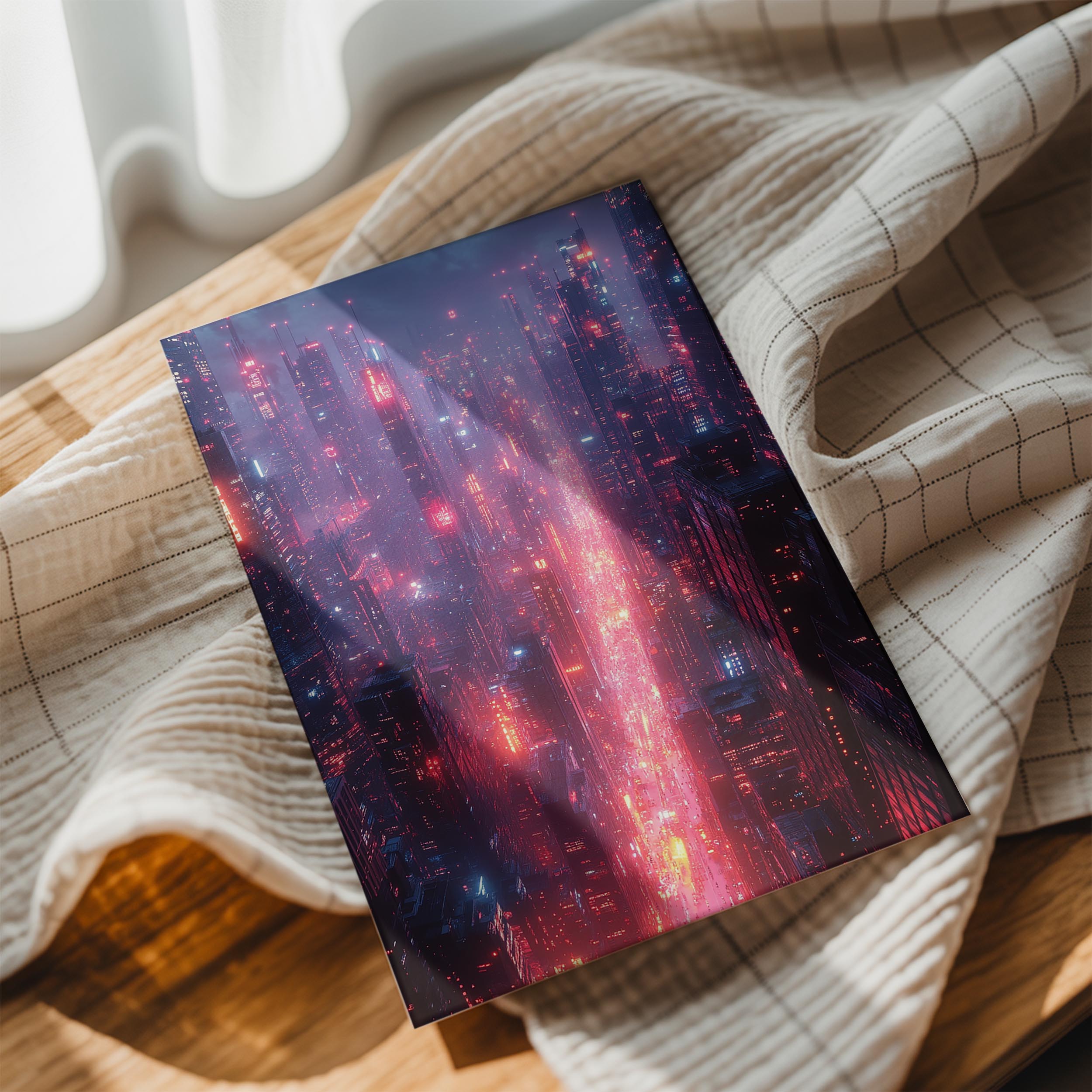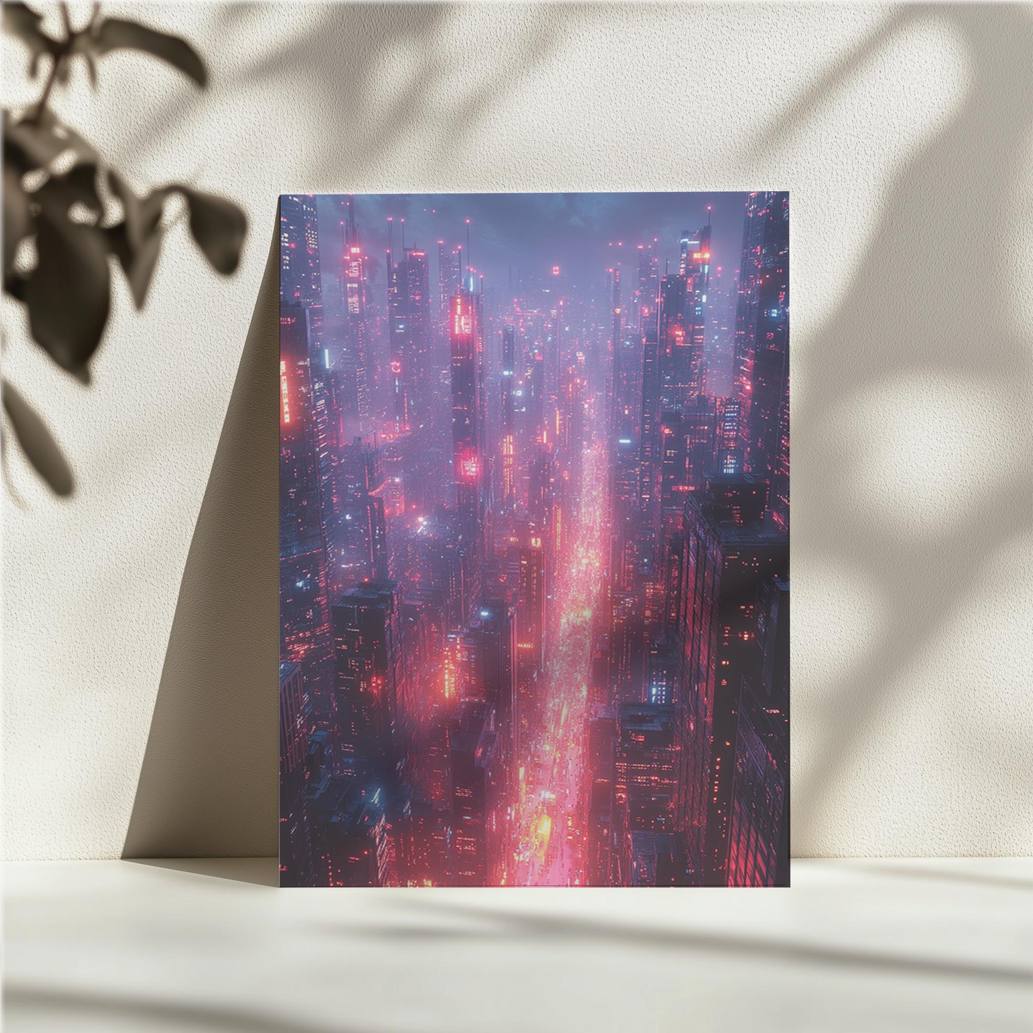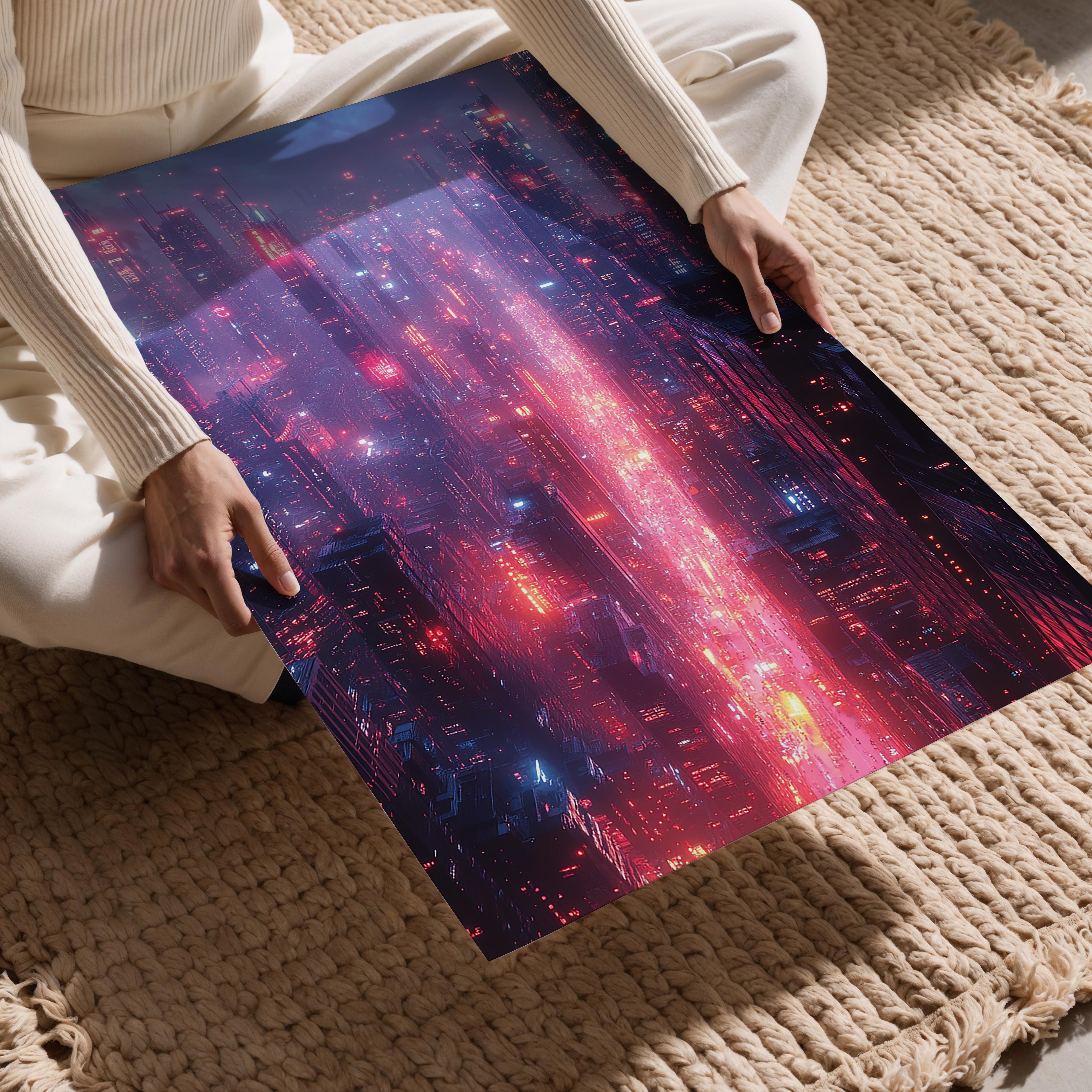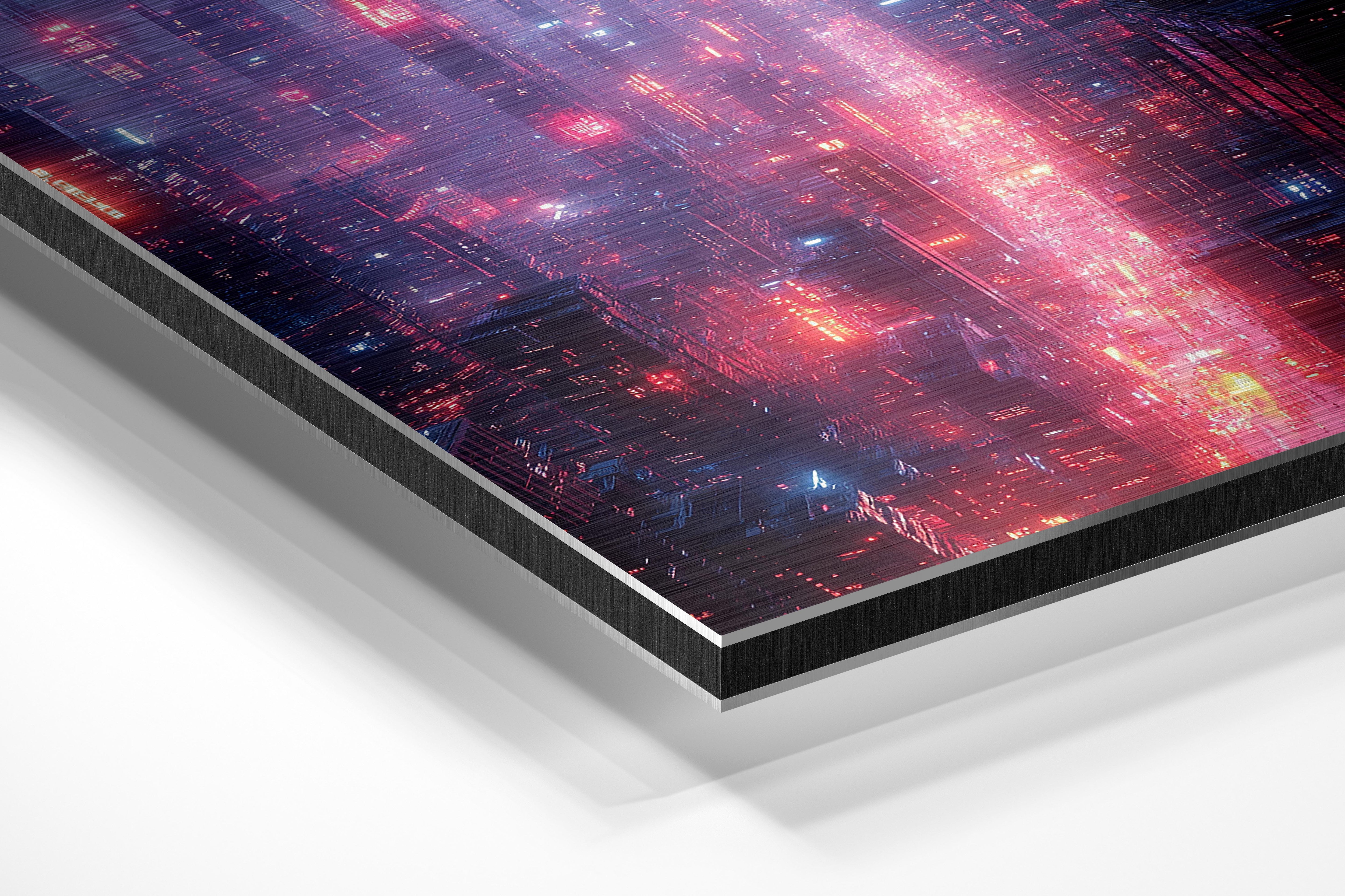 This artwork immerses the viewer into a sprawling futuristic cityscape, bathed in glowing red and blue neon. The endless skyscrapers, intricate light patterns, and atmospheric haze create a scene straight out of a cyberpunk novel. The composition captures the pulse of a futuristic metropolis, where technology and life are inextricably linked. Perfect for tech enthusiasts, urban explorers, or those fascinated by the intersection of society and innovation, this piece adds a sense of depth and motion to any modern interior, particularly in high-energy creative spaces.