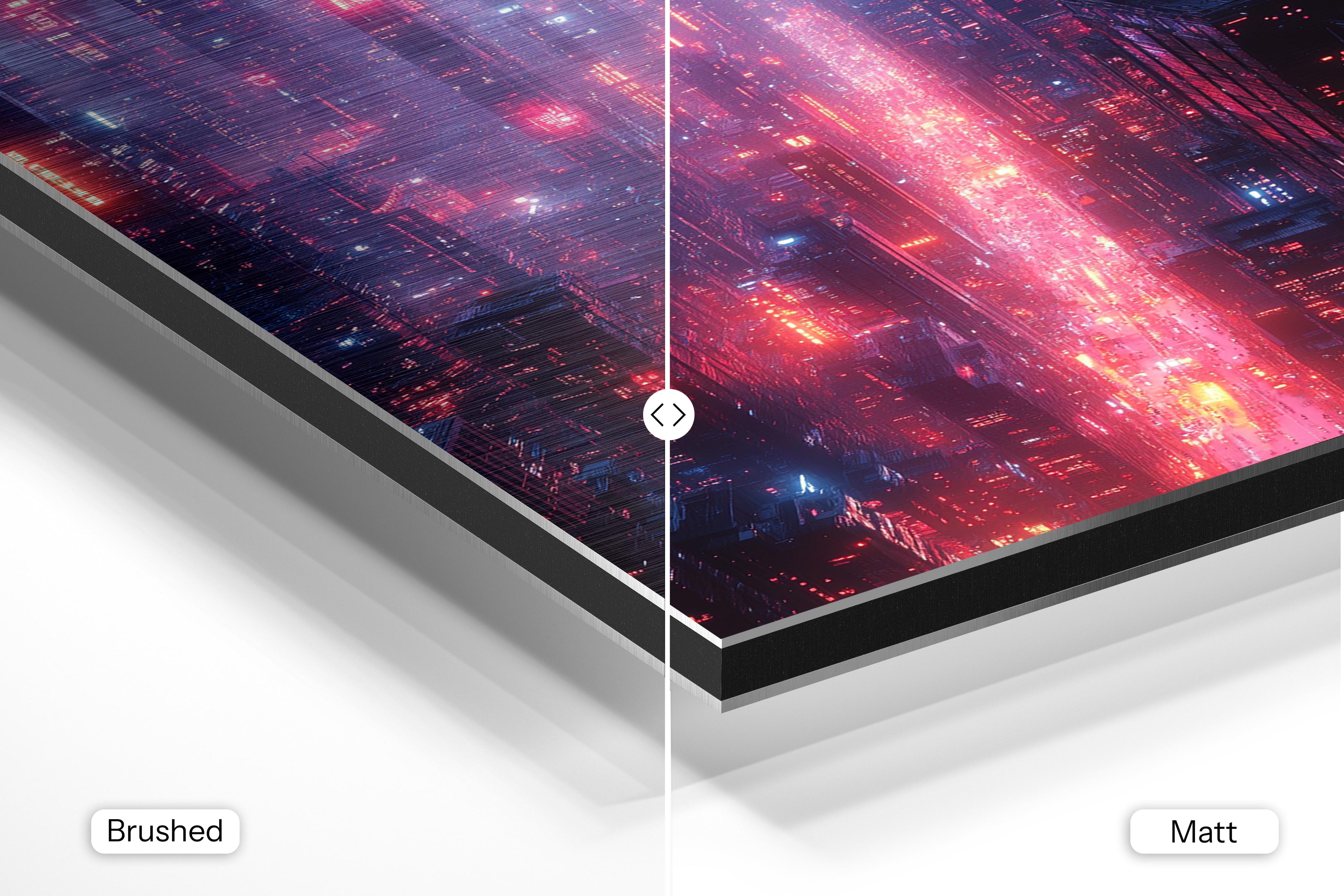 - Brushed Aluminum, on the other hand, features a raw metallic texture with visible brush strokes. Whites and highlights in your image let the silver surface show through, adding a dramatic, shimmering effect. Ideal for black-and-white images, minimalist designs, or abstract art, it creates a bold, industrial vibe with a modern edge.