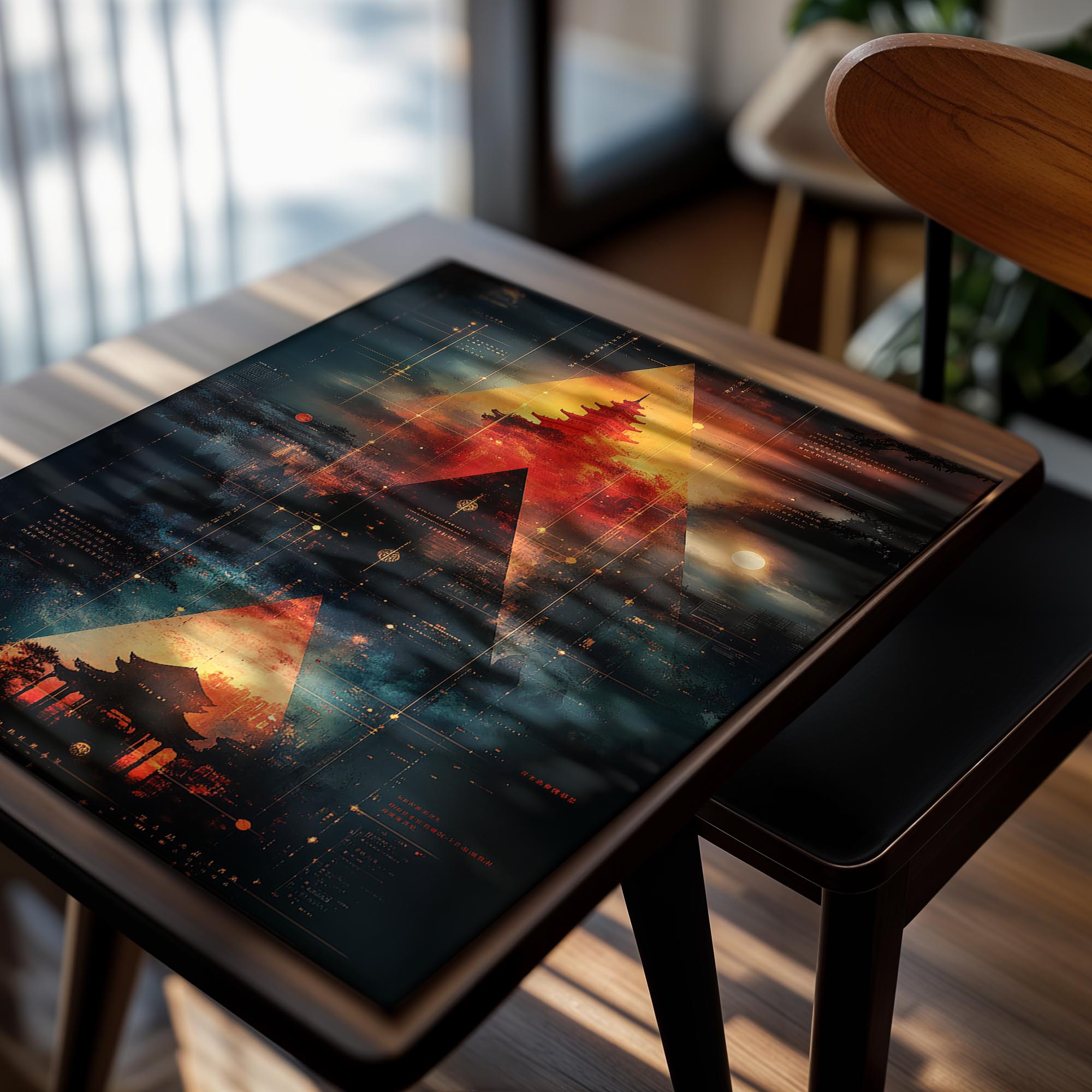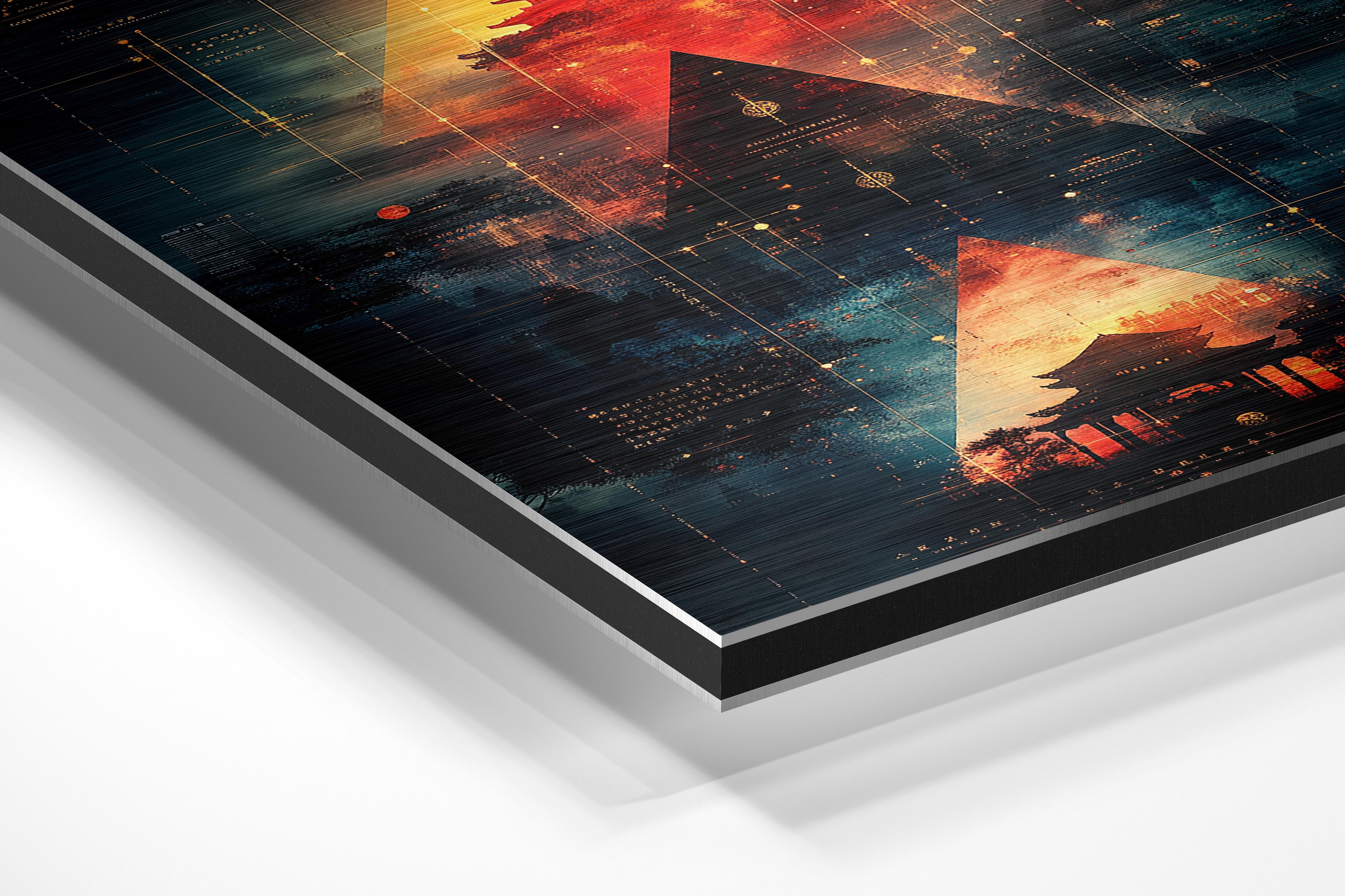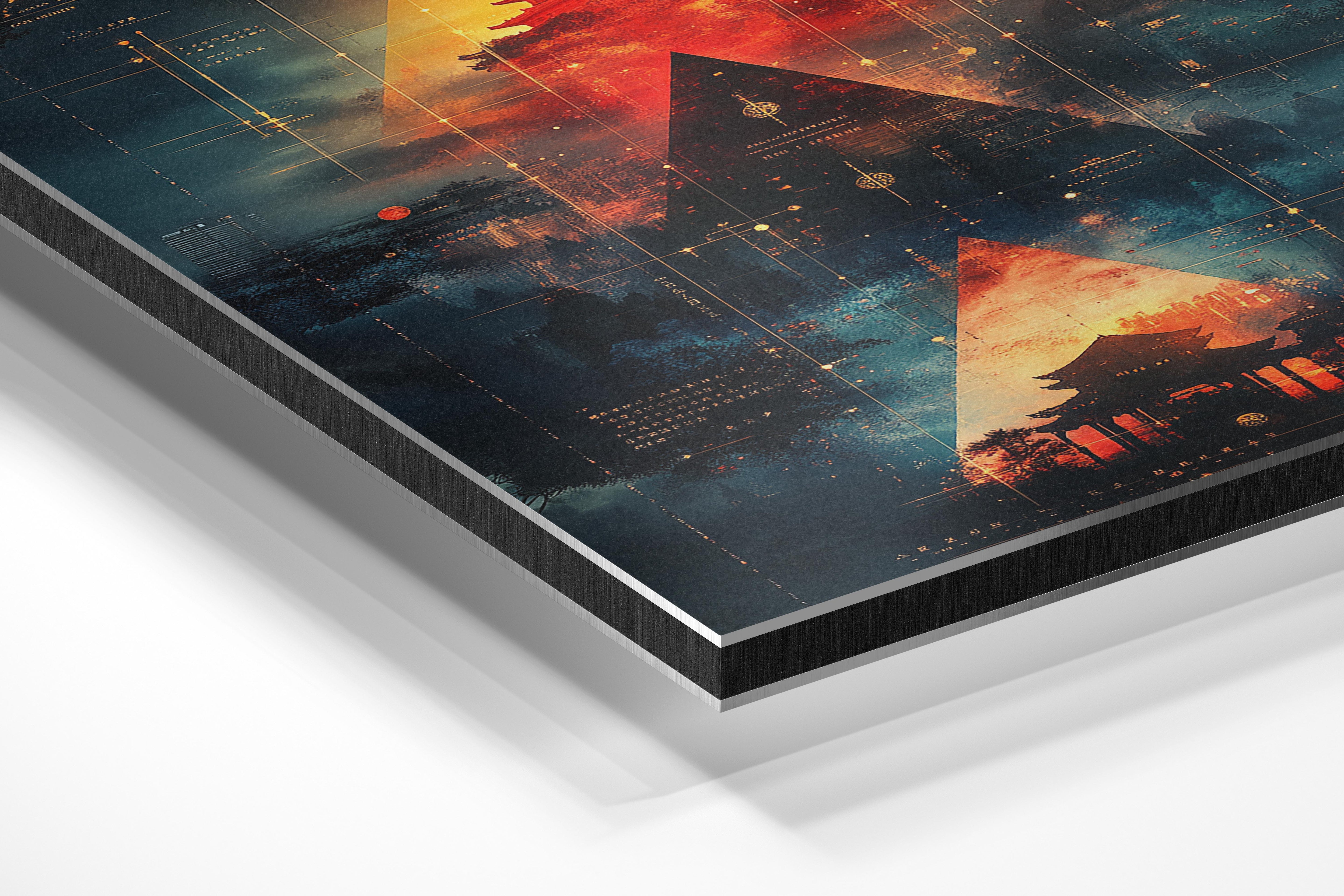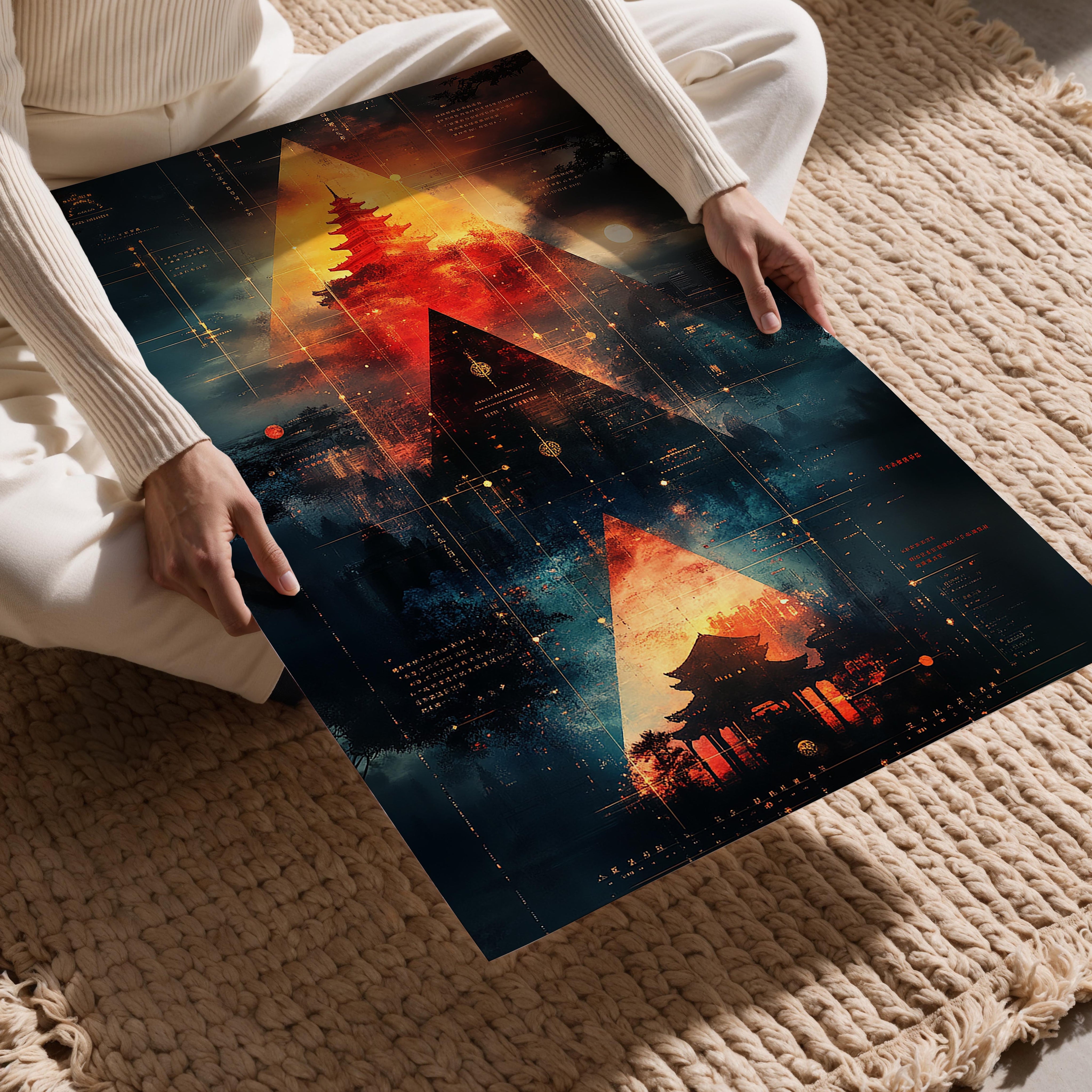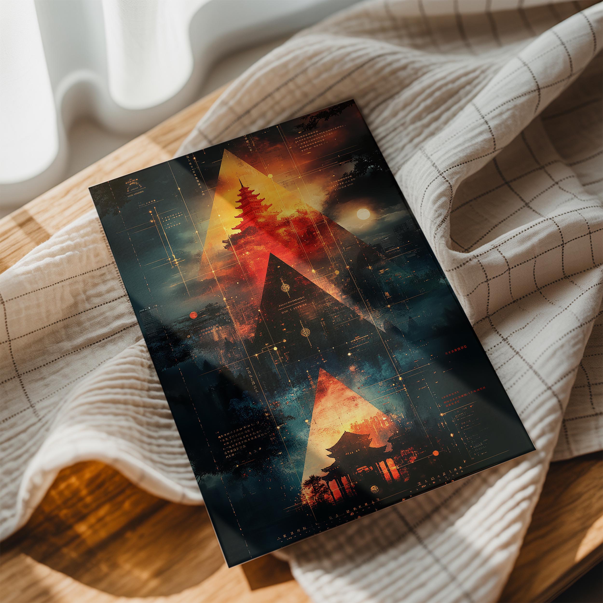 A futuristic fusion of traditional Asian architecture with cyberpunk elements, this piece features a dramatic composition of illuminated pagodas arranged in a triangular form. The rich hues of red, orange, and gold contrast with the deep blues of the digital background, evoking a scene of technological mysticism. The intricate details and glowing accents make this artwork an electrifying addition to any cyberpunk-inspired space, a gaming room, or a high-tech office. It encapsulates a perfect blend of history and the future, merging ancient traditions with modern technology.