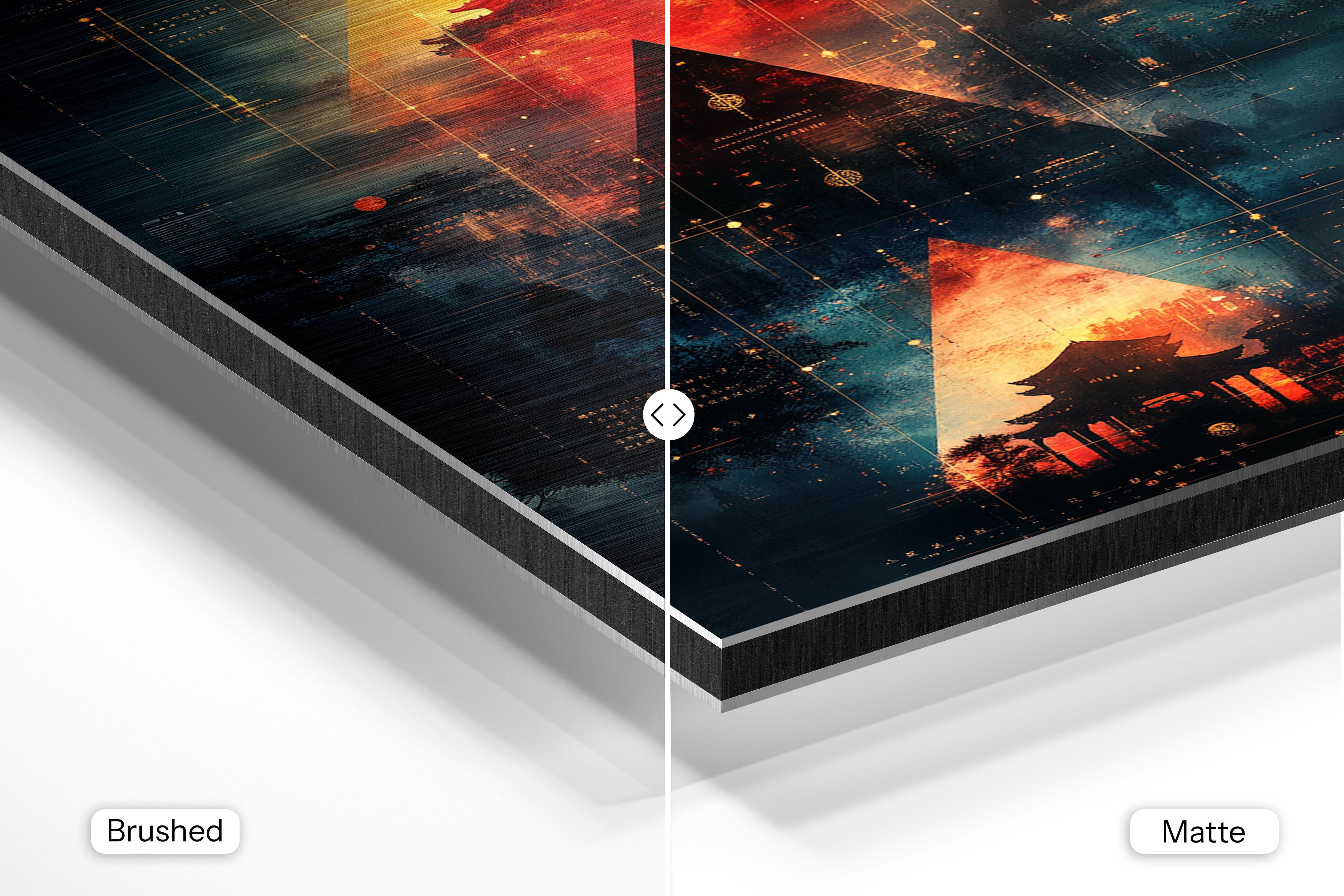 - Brushed Aluminum, on the other hand, features a raw metallic texture with visible brush strokes. Whites and highlights in your image let the silver surface show through, adding a dramatic, shimmering effect. Ideal for black-and-white images, minimalist designs, or abstract art, it creates a bold, industrial vibe with a modern edge.