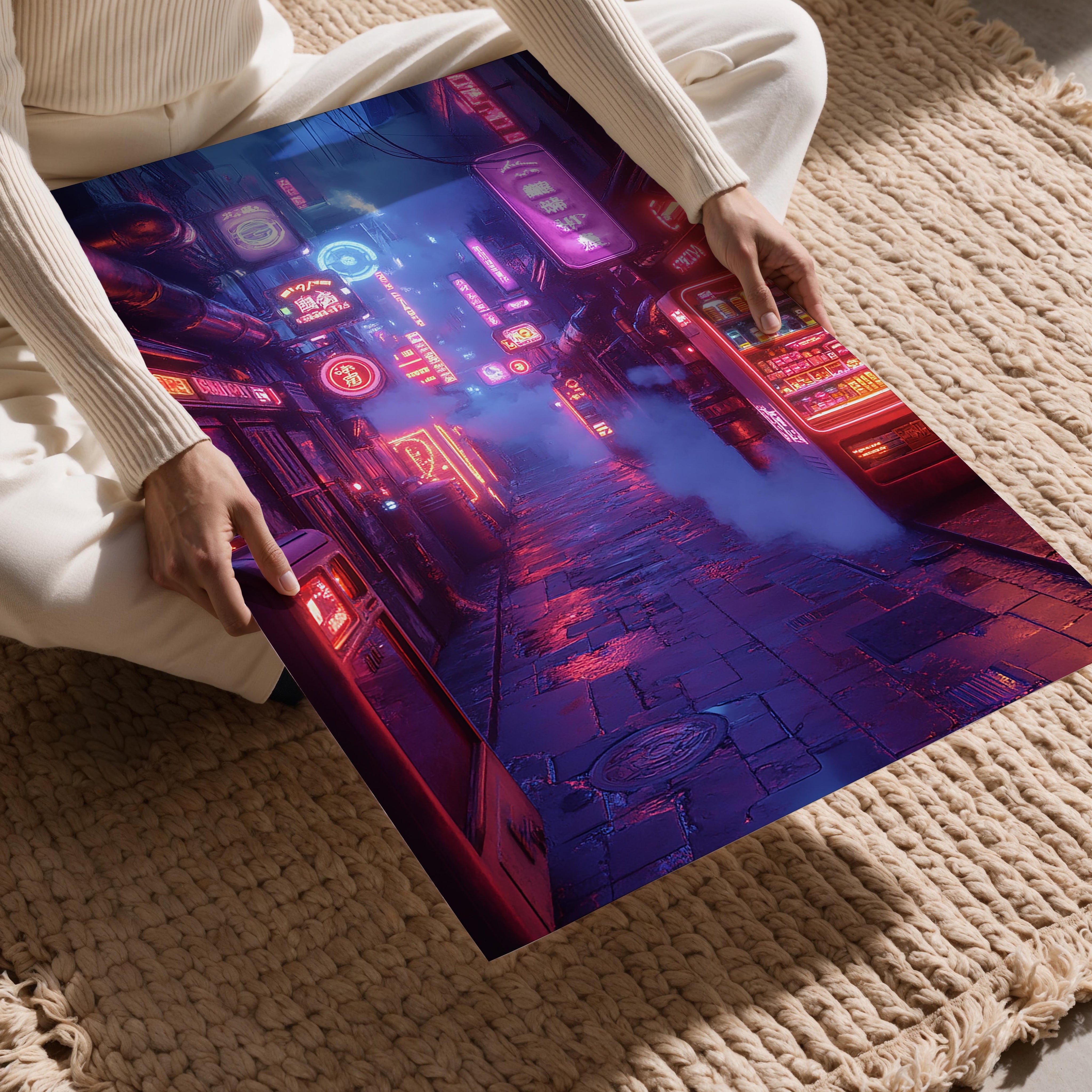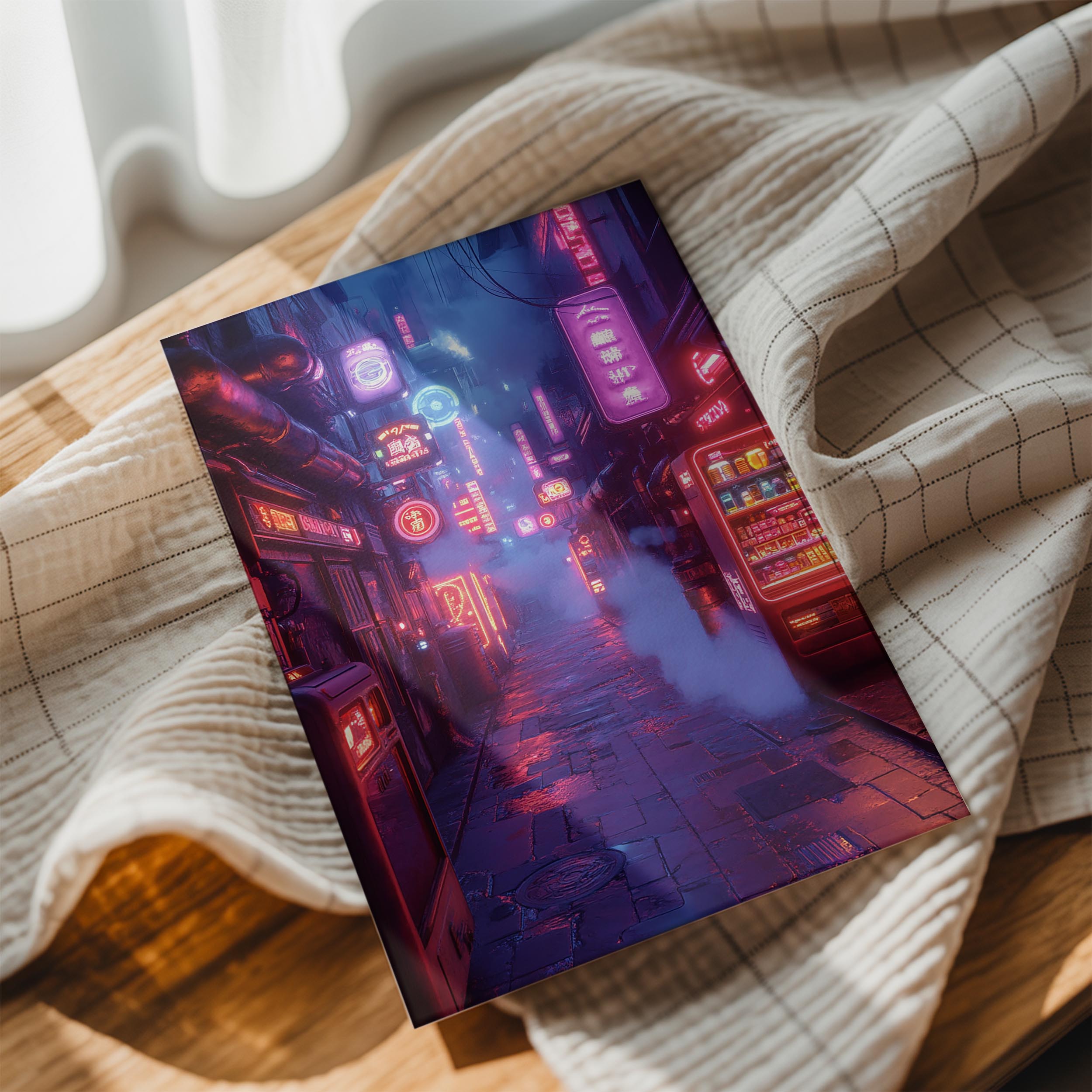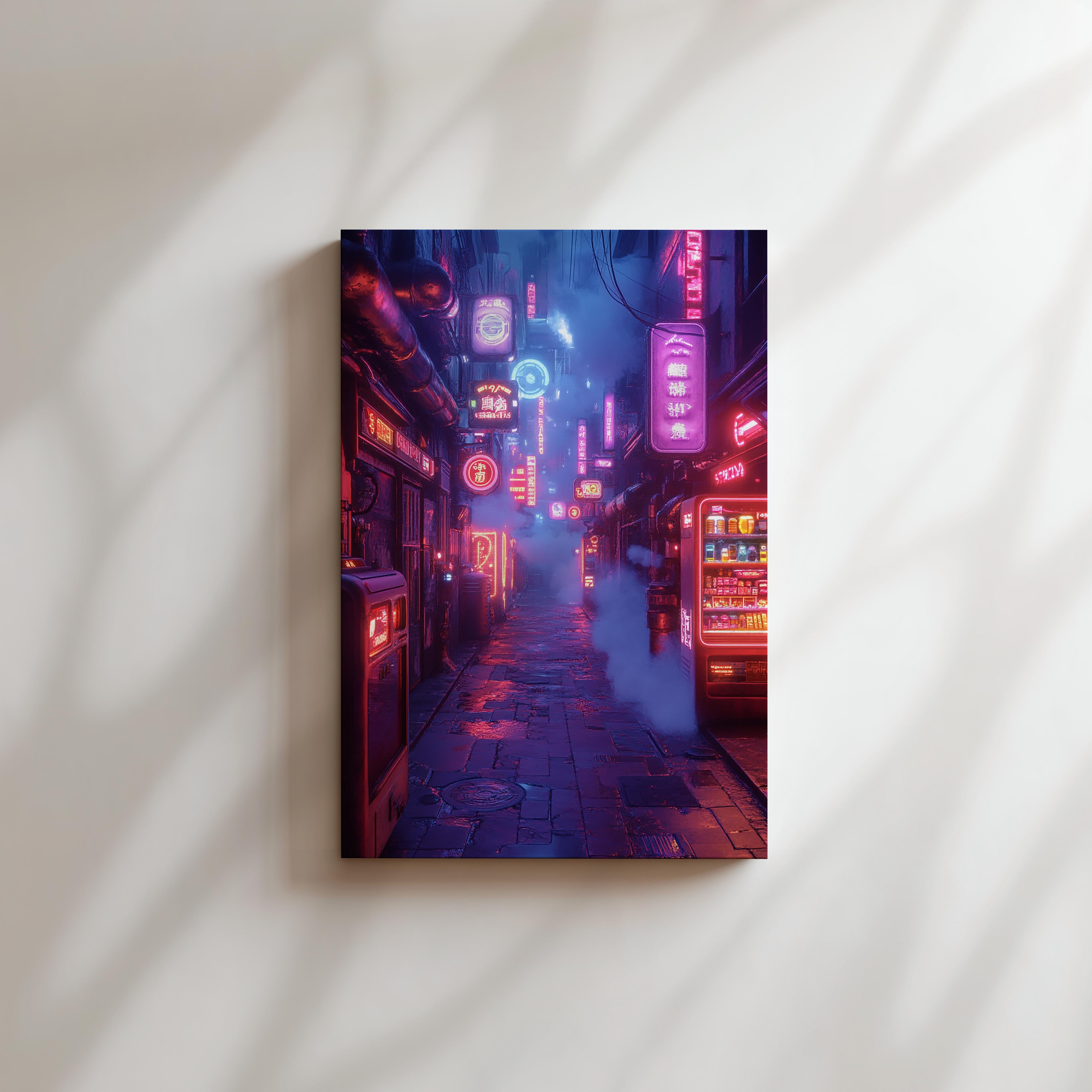 An evocative urban street bathed in neon lights, with vending machines and glowing signs creating a lively cyberpunk aesthetic. The misty atmosphere enhances the futuristic ambiance, drawing viewers into its immersive world. Every detail, from the reflections on the pavement to the cascading neon, adds to its appeal. This piece is perfect for a tech-themed workspace or a futuristic living area seeking a splash of vibrancy.