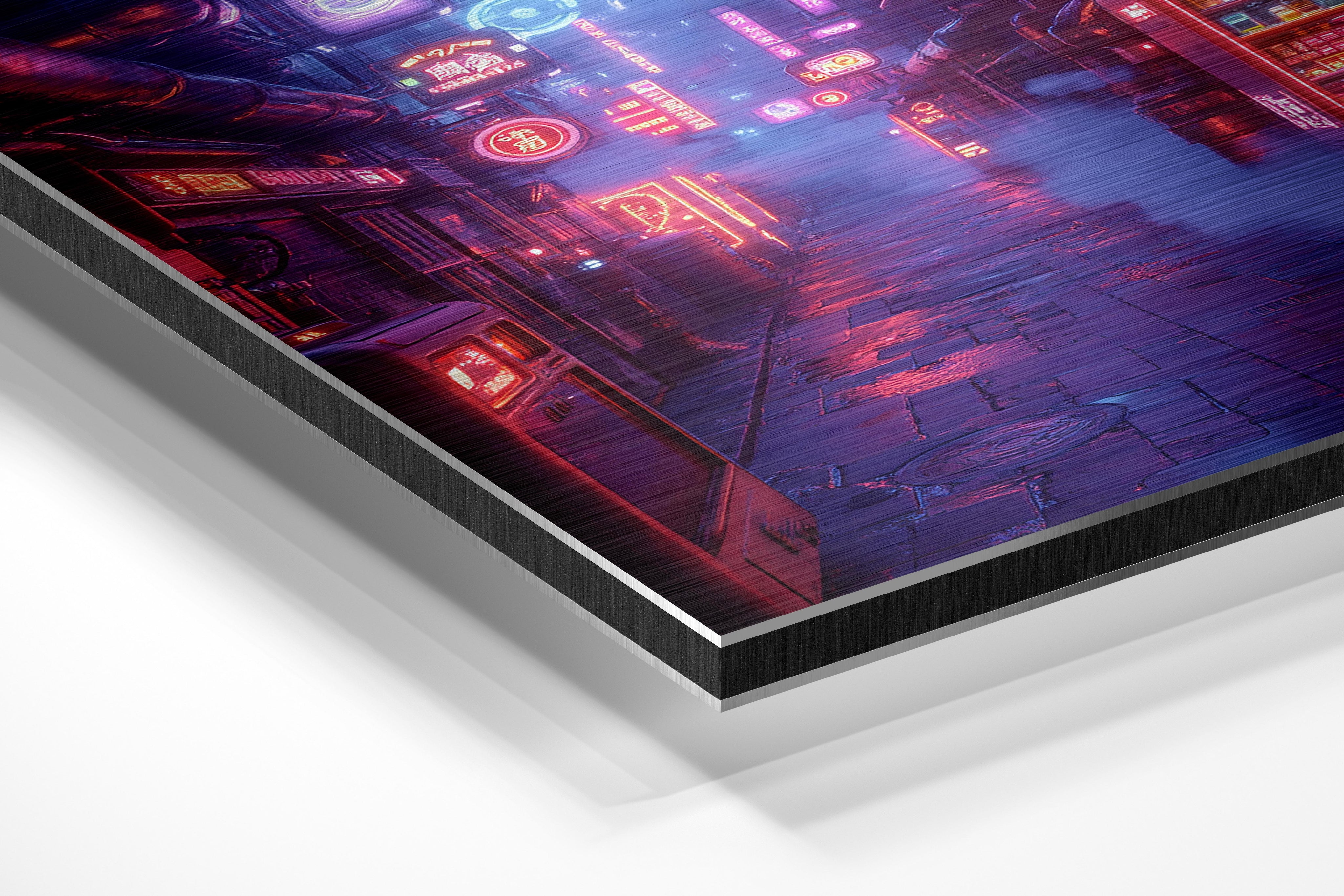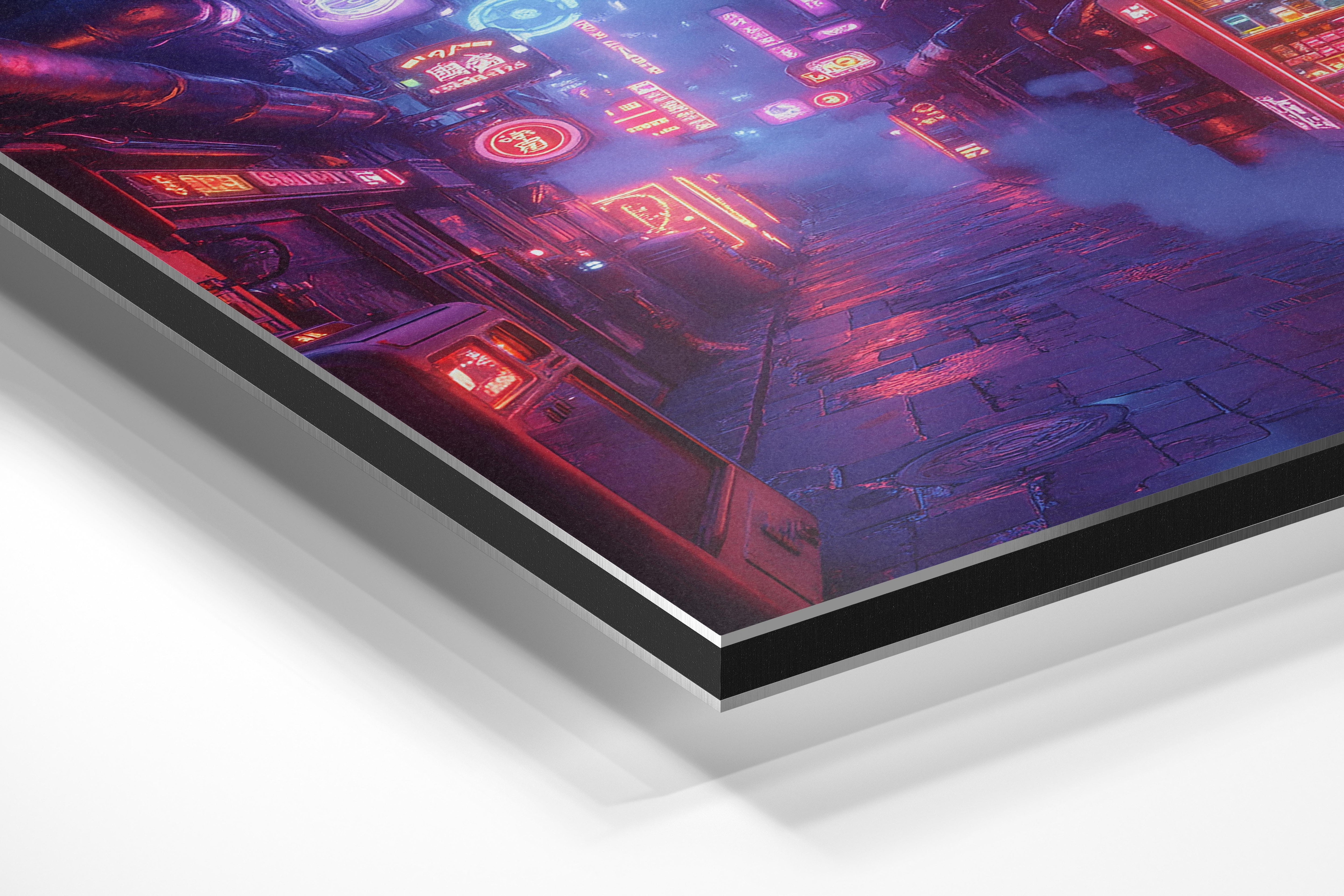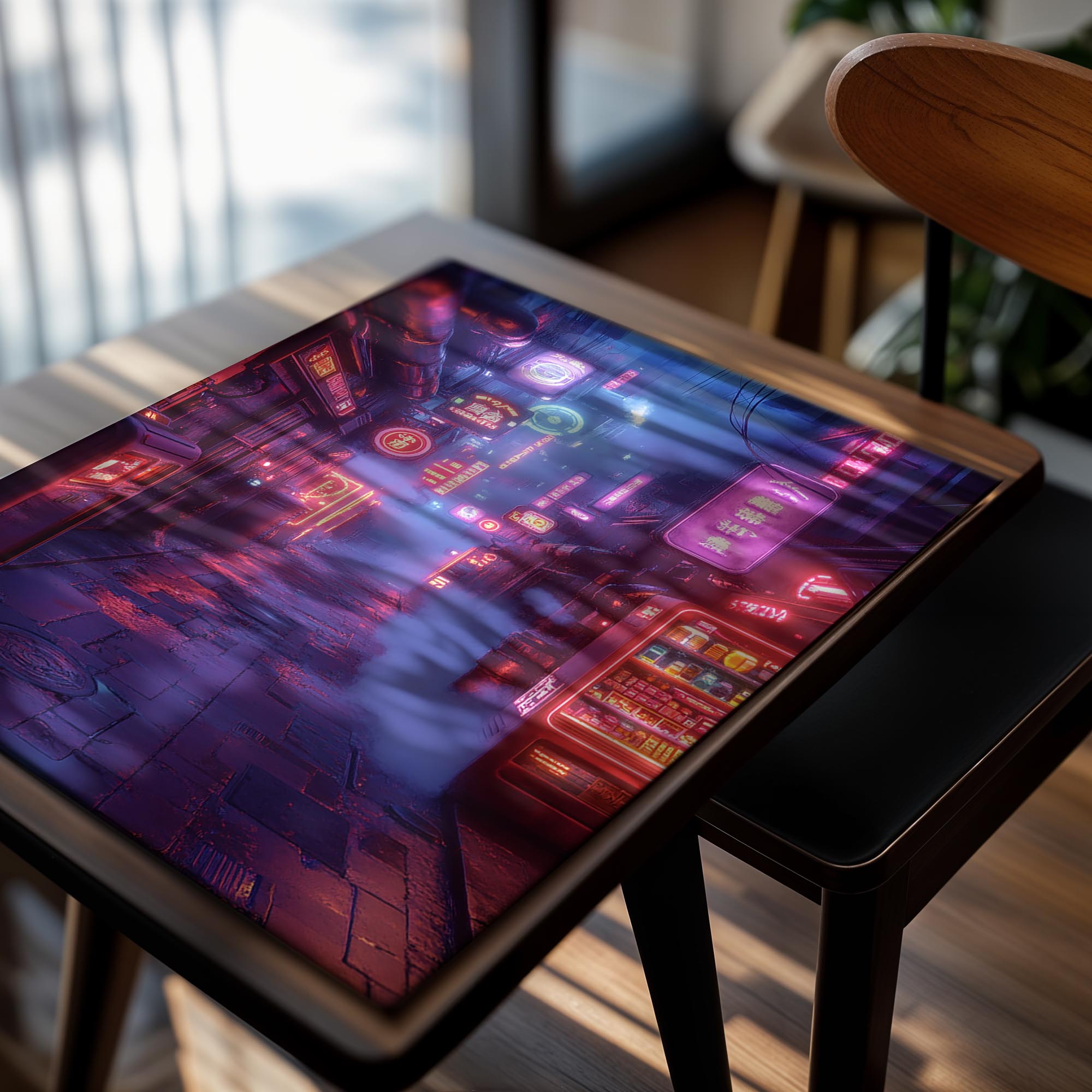 An evocative urban street bathed in neon lights, with vending machines and glowing signs creating a lively cyberpunk aesthetic. The misty atmosphere enhances the futuristic ambiance, drawing viewers into its immersive world. Every detail, from the reflections on the pavement to the cascading neon, adds to its appeal. This piece is perfect for a tech-themed workspace or a futuristic living area seeking a splash of vibrancy.