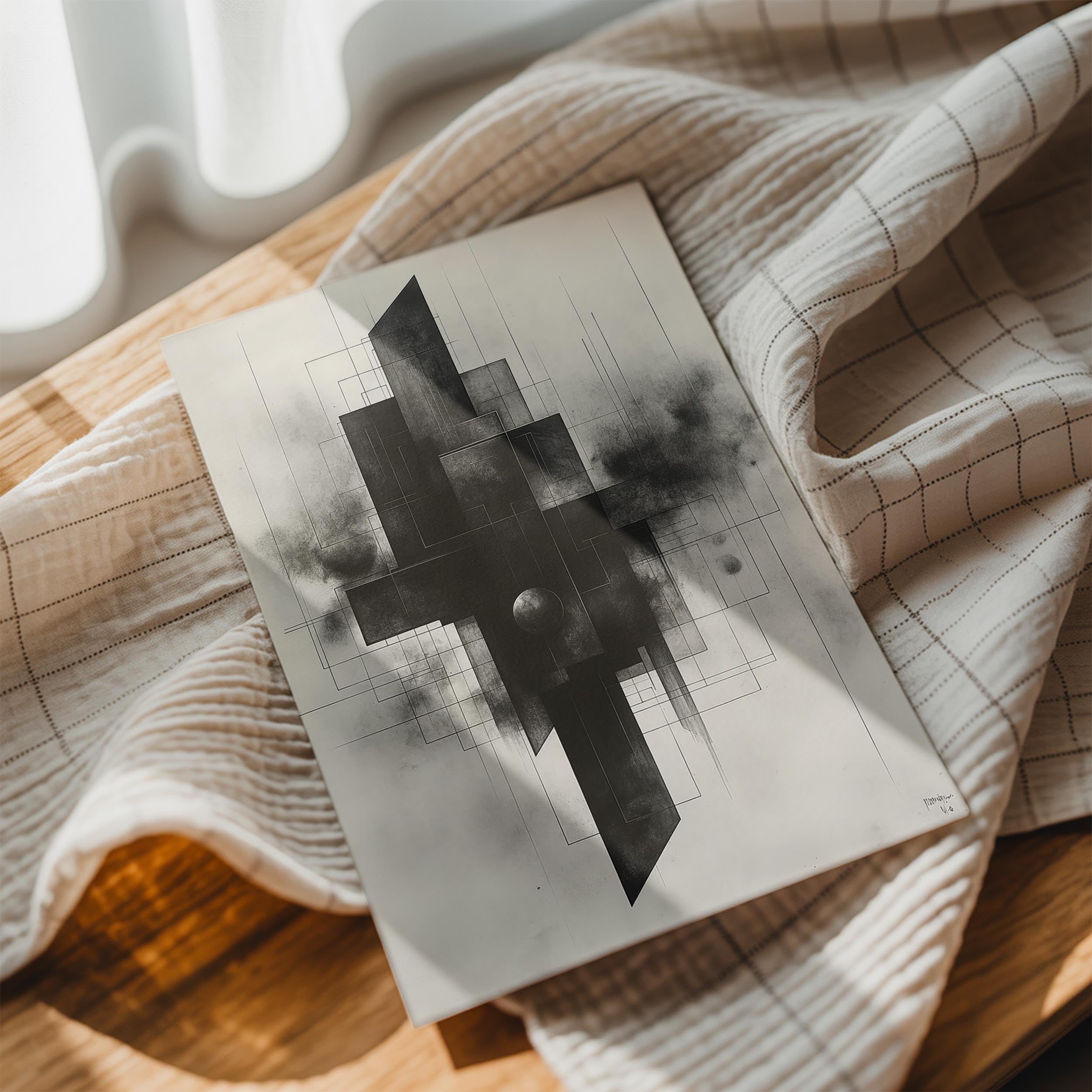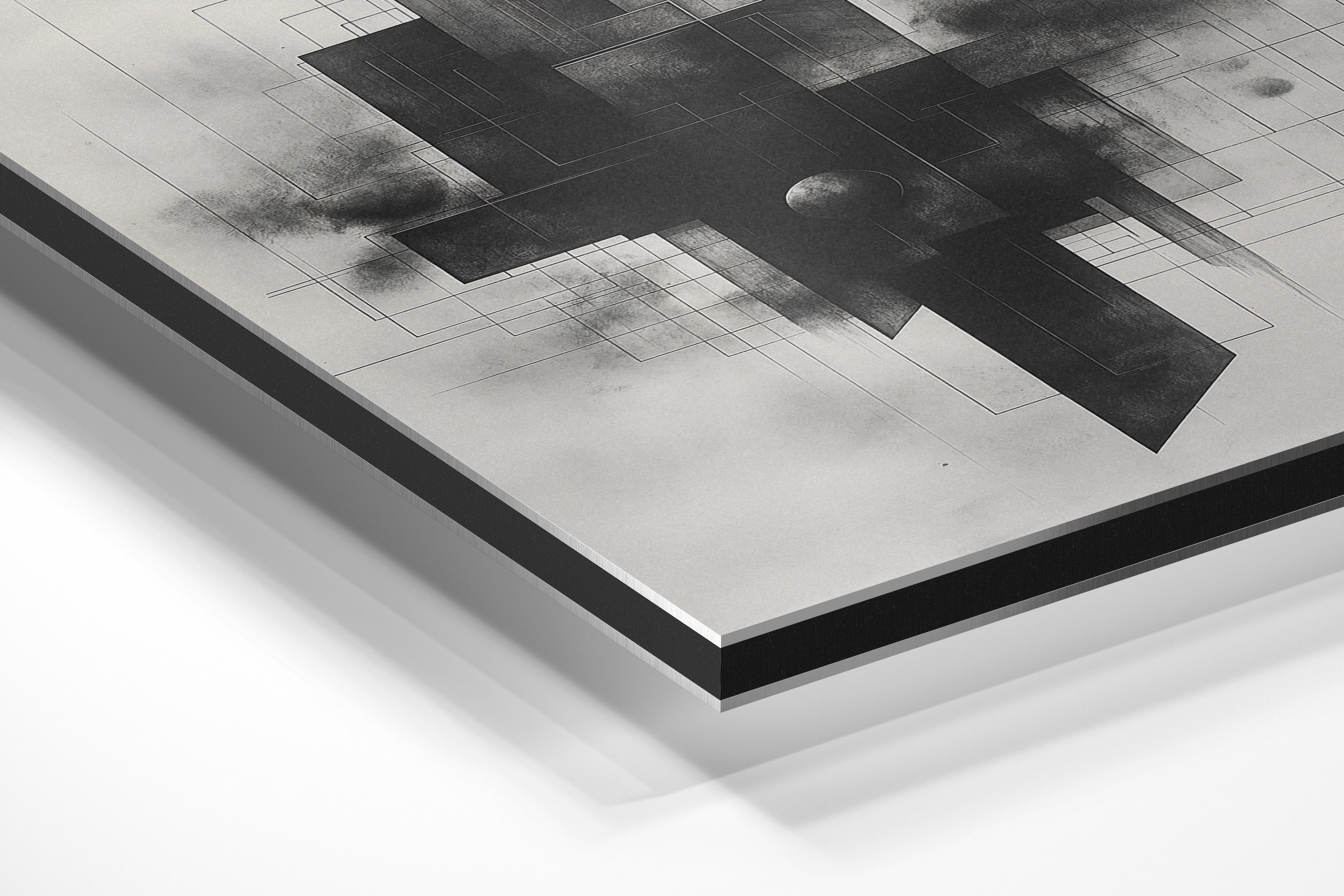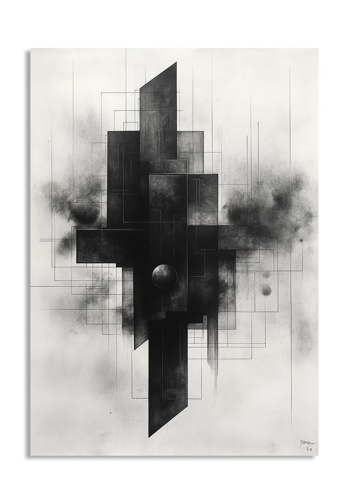 This intricate abstract artwork features dark geometric shapes layered with subtle textures and lines. The interplay of sharp edges and gradients creates a powerful sense of depth and sophistication. Its monochromatic theme makes it an ideal centerpiece for modern and industrial-inspired interiors.