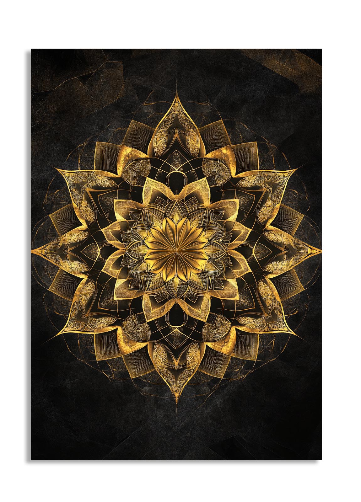 This artwork features a rich golden mandala against a deep, dark background, creating an aura of mystery and sophistication. The intricate patterns and glowing accents make it a luxurious piece that suits upscale interiors, such as hotel suites or elegant dining rooms. Perfect for those who value cultural and spiritual symbolism, this mandala adds depth and refinement to any space. Its combination of opulence and subtlety makes it versatile for both traditional and contemporary settings.