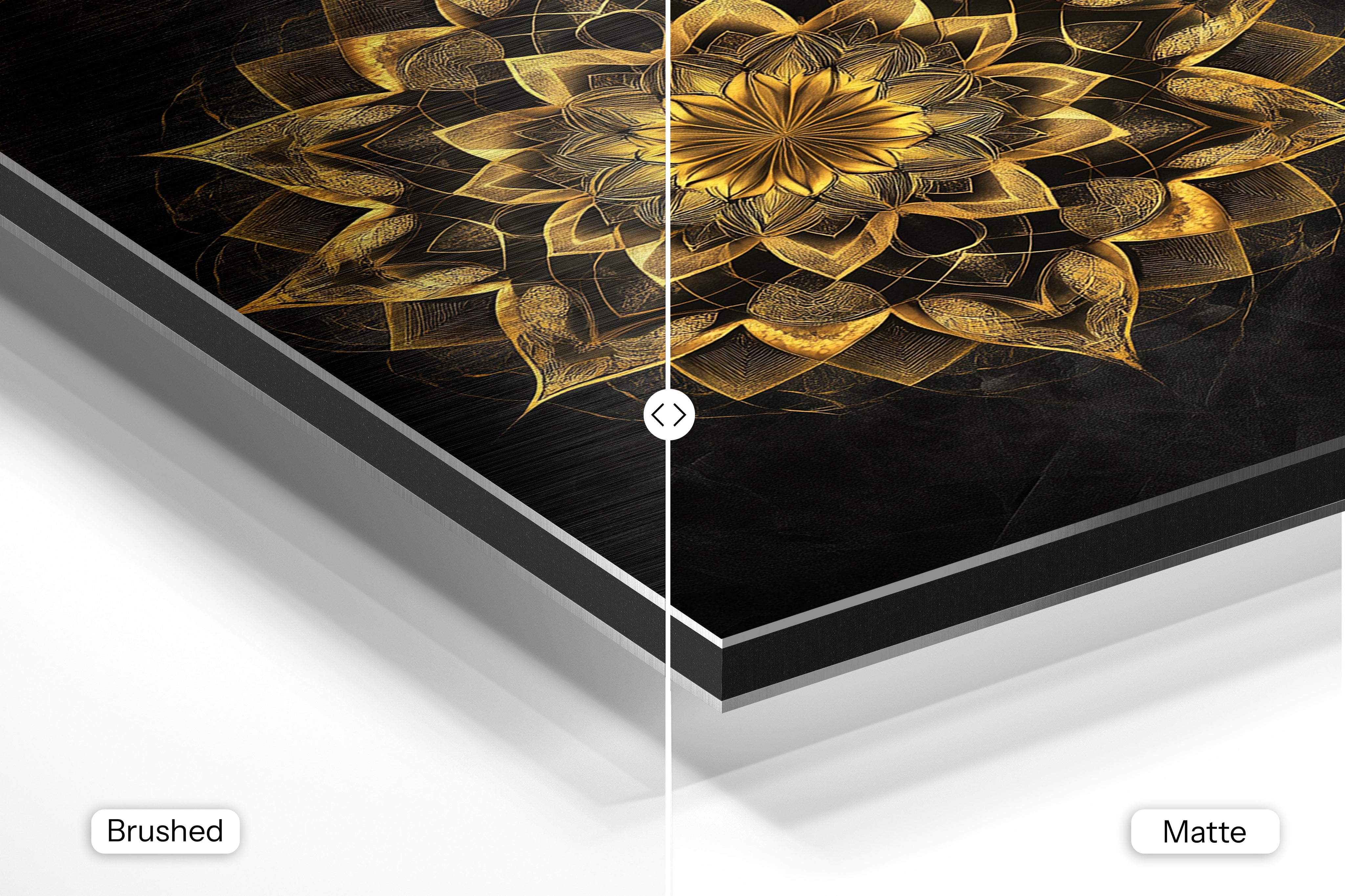 - Brushed Aluminum, on the other hand, features a raw metallic texture with visible brush strokes. Whites and highlights in your image let the silver surface show through, adding a dramatic, shimmering effect. Ideal for black-and-white images, minimalist designs, or abstract art, it creates a bold, industrial vibe with a modern edge.
