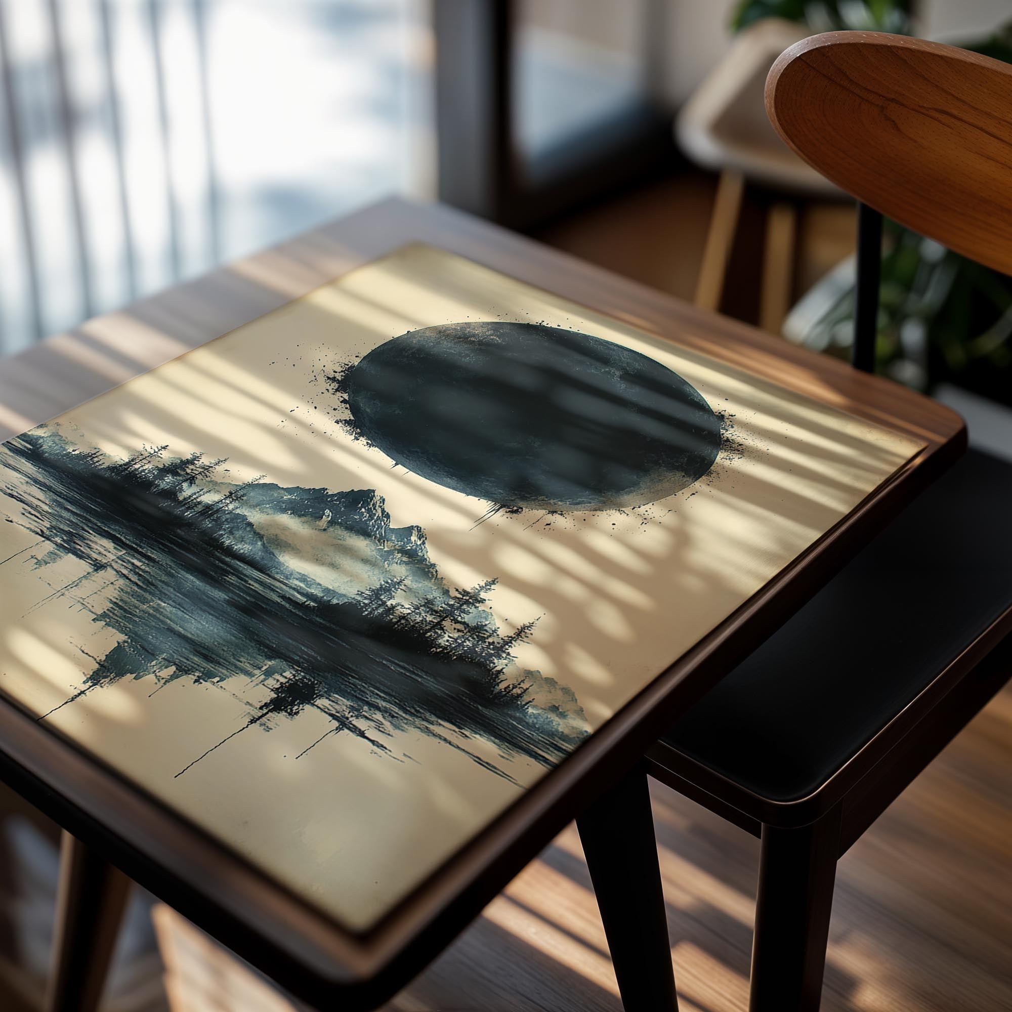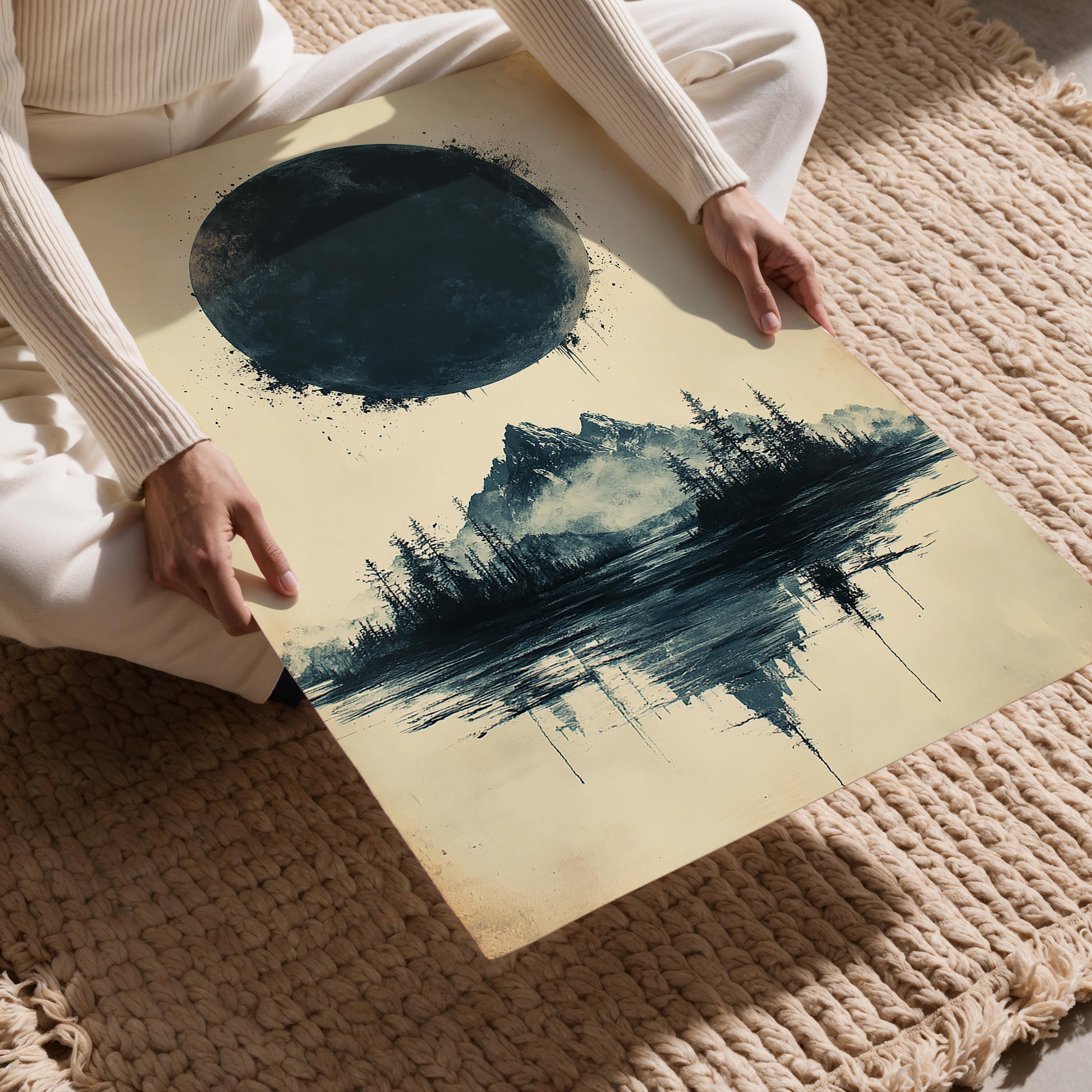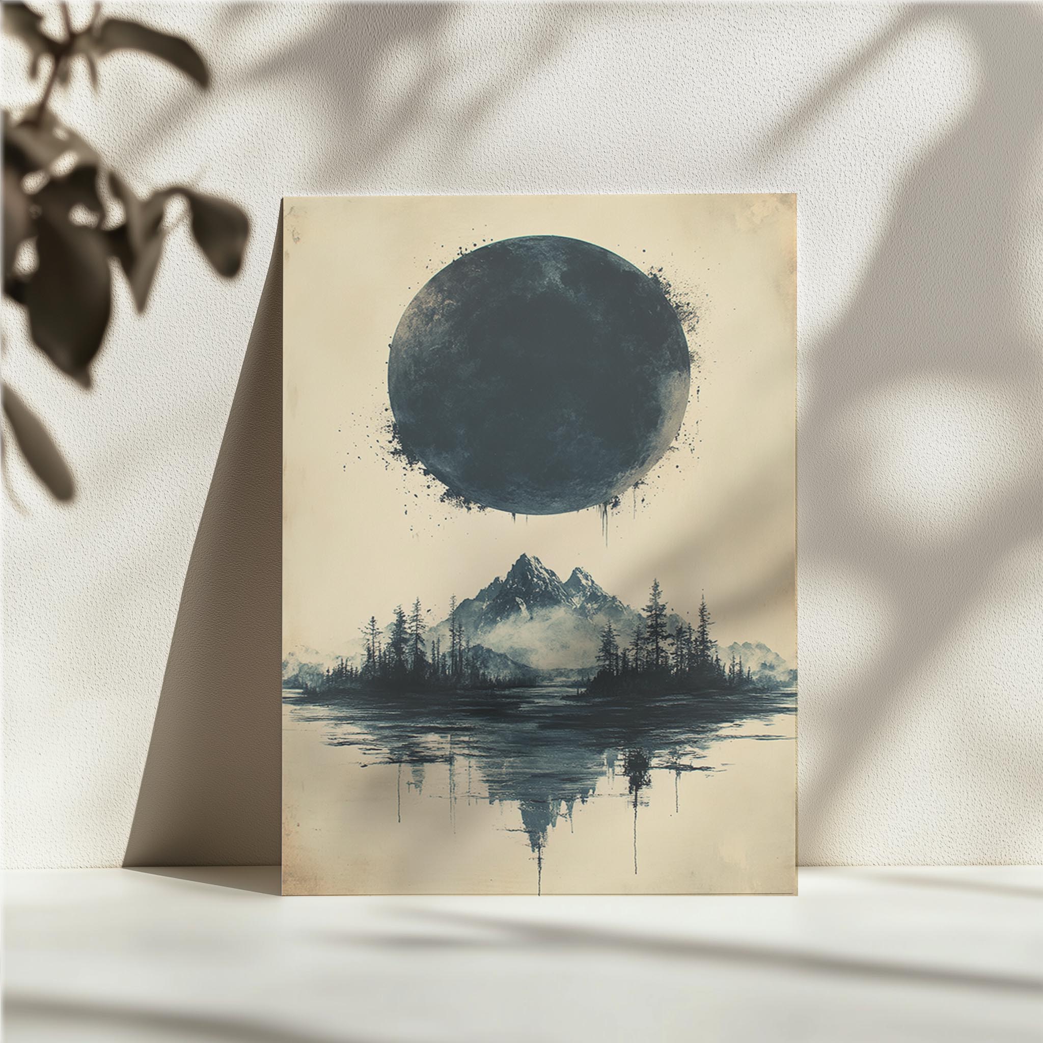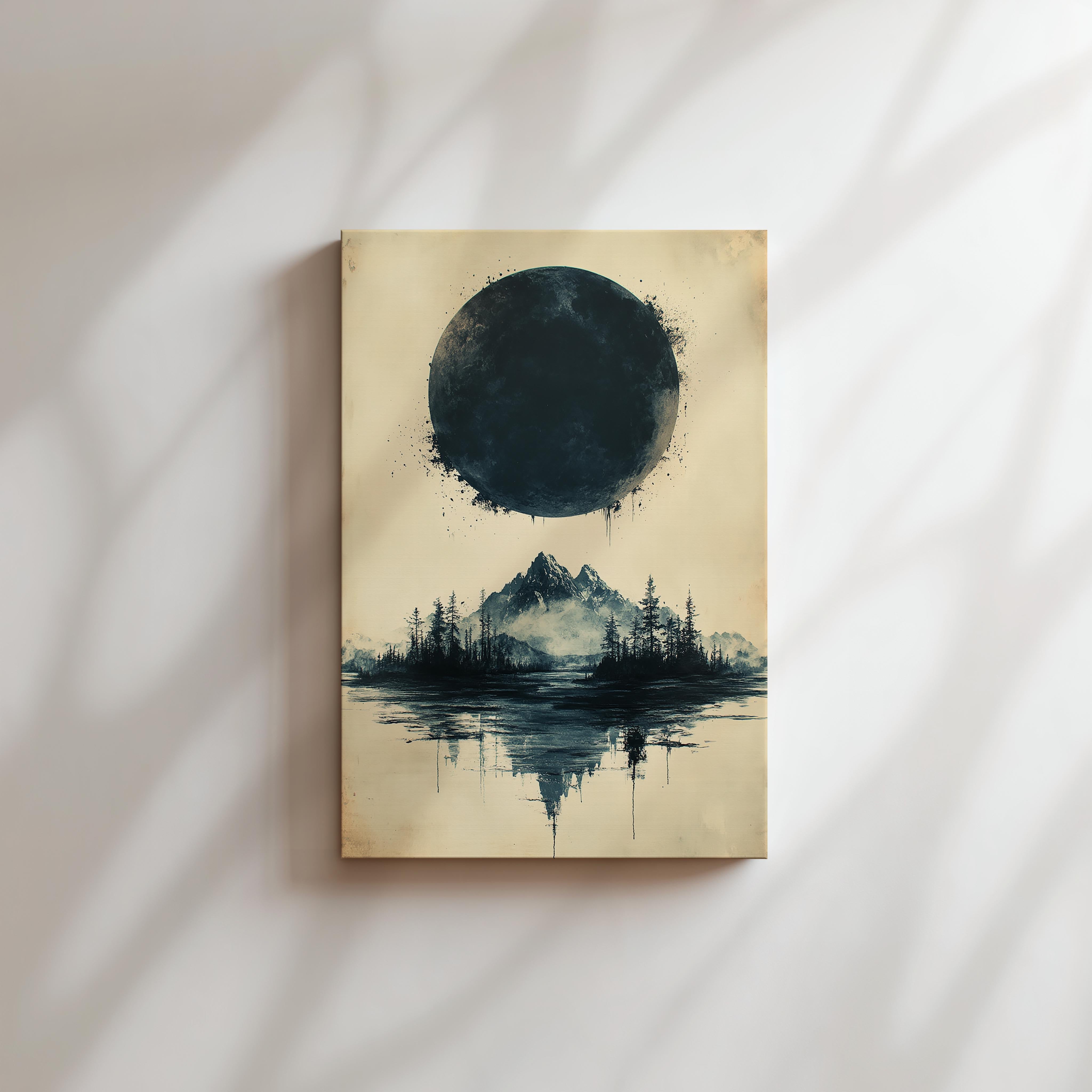 A dark and mysterious scene, this artwork depicts a massive, shadowy moon hanging low over a rugged mountain range. The reflective lake in the foreground doubles the composition's drama, adding depth and symmetry. The interplay of light and shadow creates a moody, surreal atmosphere, ideal for nature lovers or fans of fantasy art. This piece is perfect for creating a dramatic focal point in living rooms or spaces designed for quiet reflection.