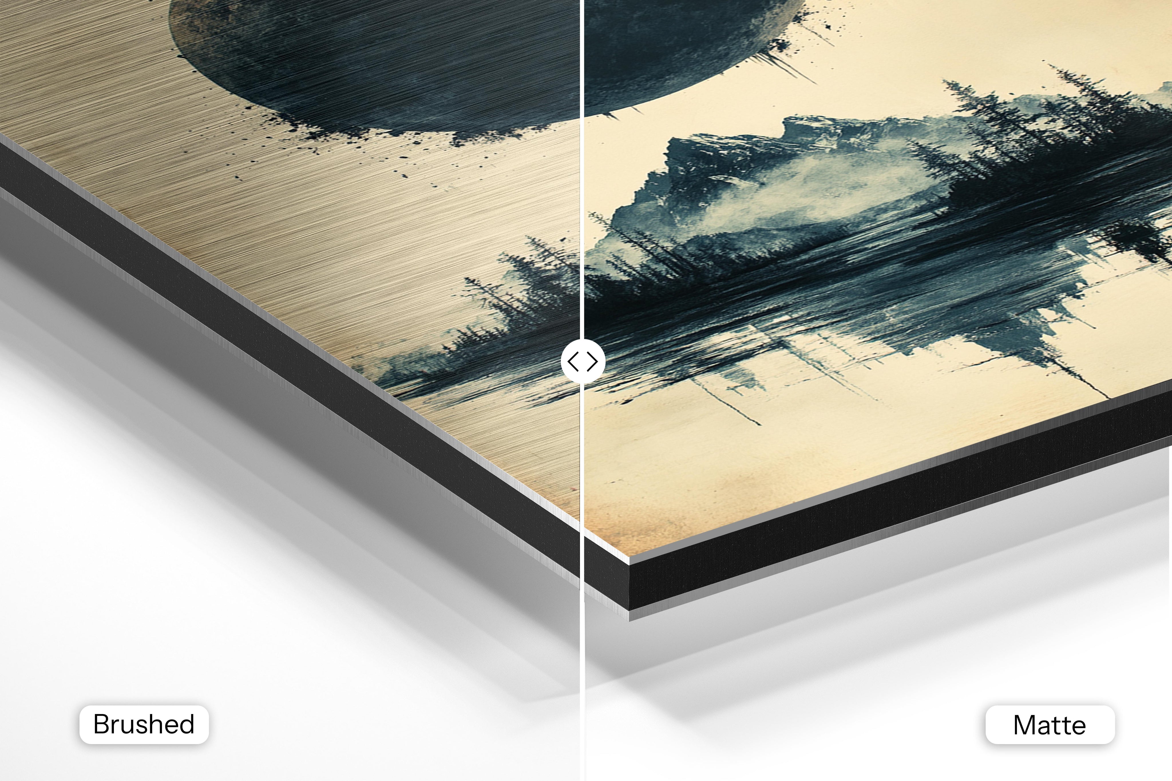 - Brushed Aluminum, on the other hand, features a raw metallic texture with visible brush strokes. Whites and highlights in your image let the silver surface show through, adding a dramatic, shimmering effect. Ideal for black-and-white images, minimalist designs, or abstract art, it creates a bold, industrial vibe with a modern edge.
