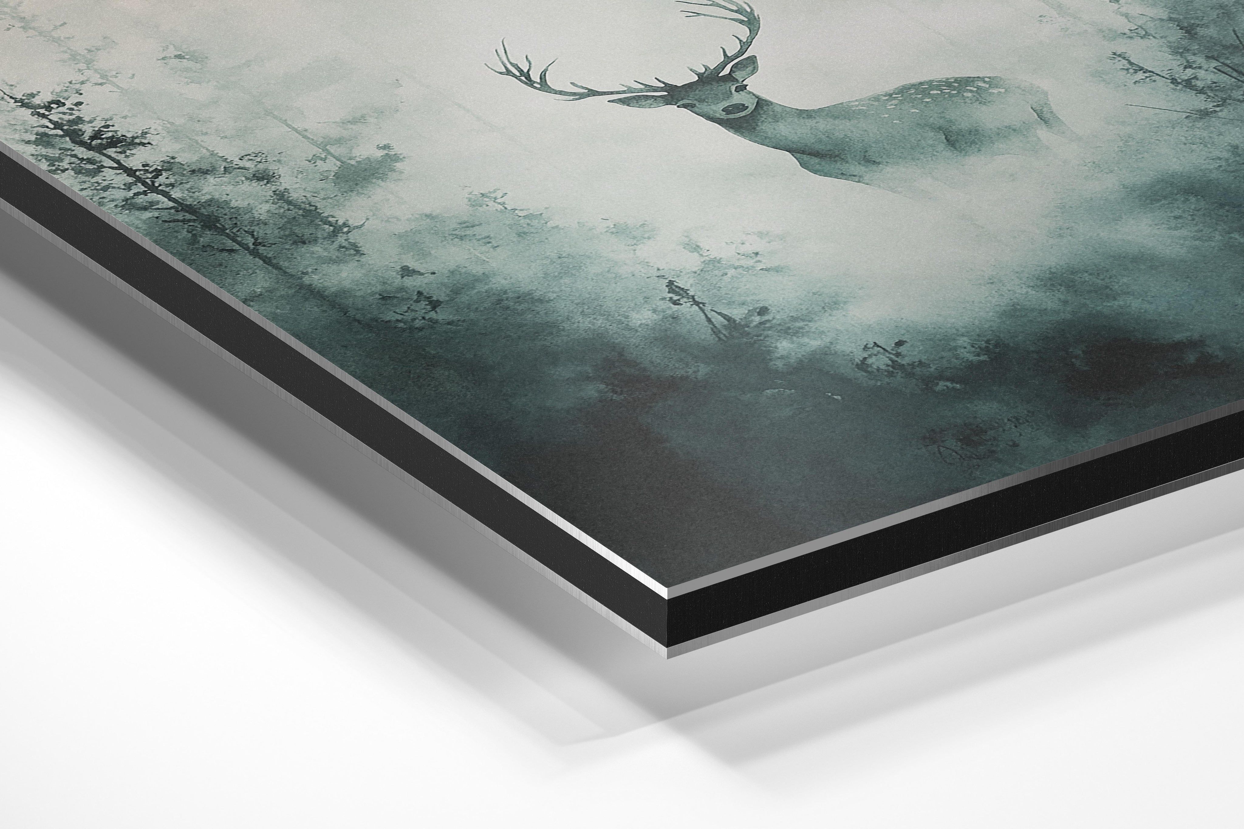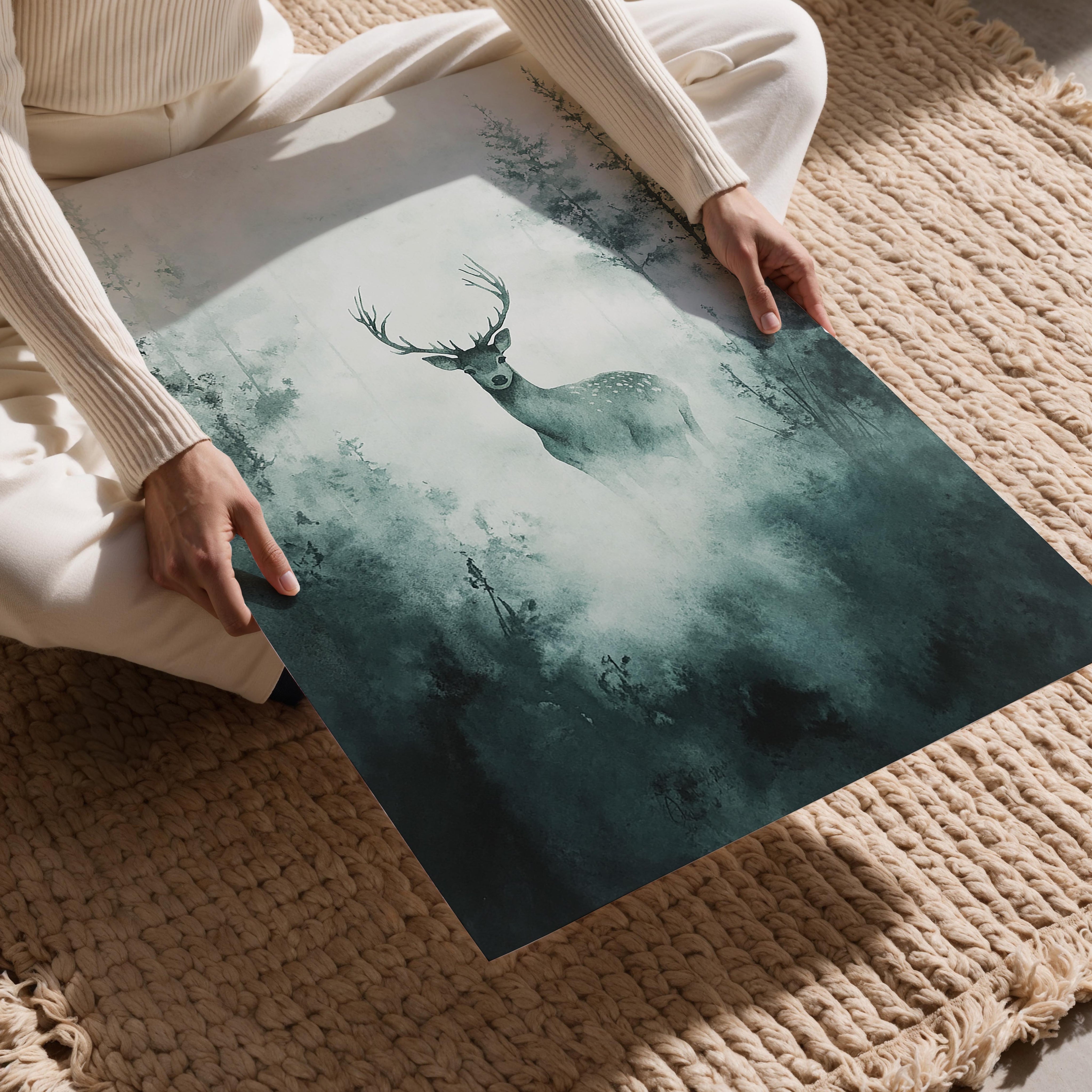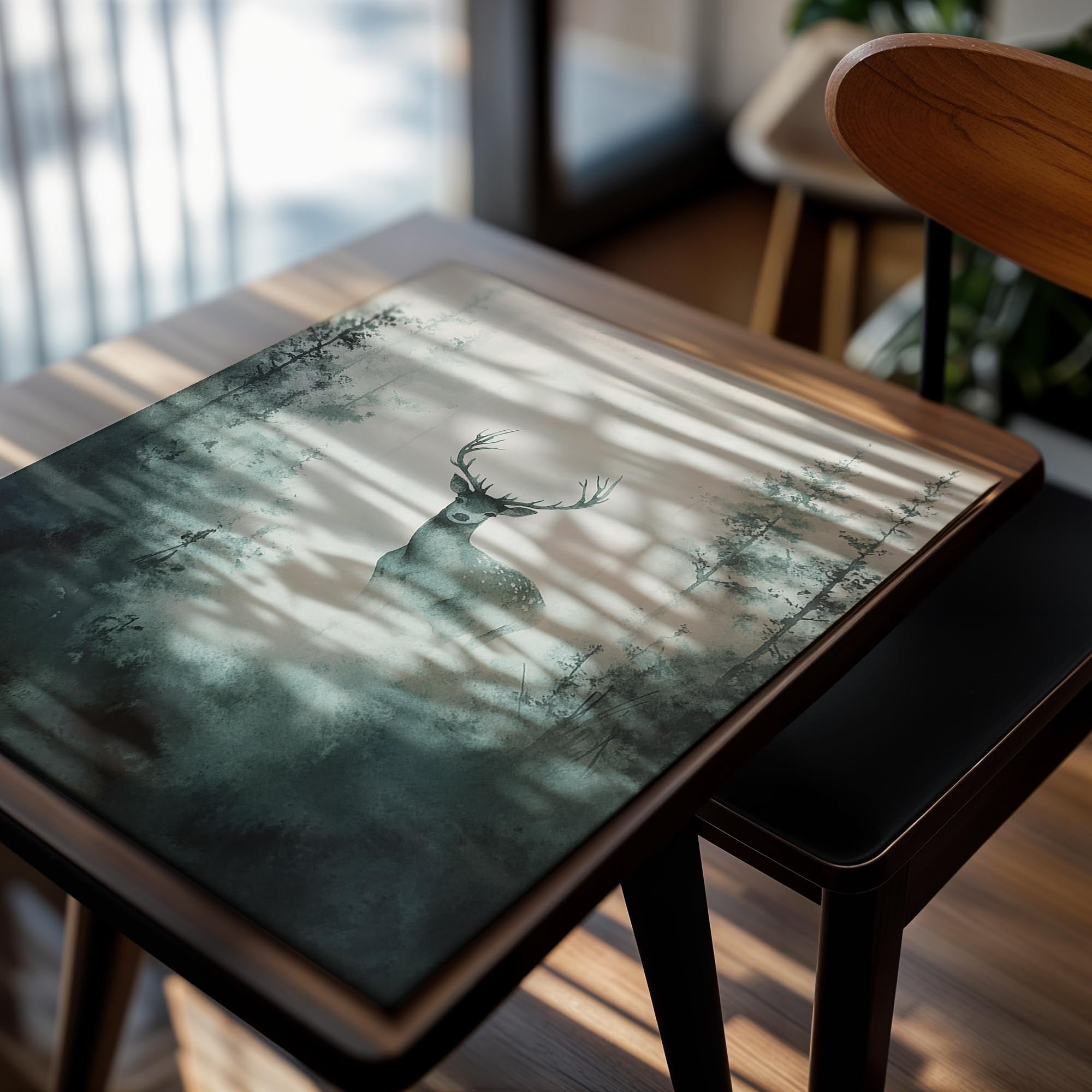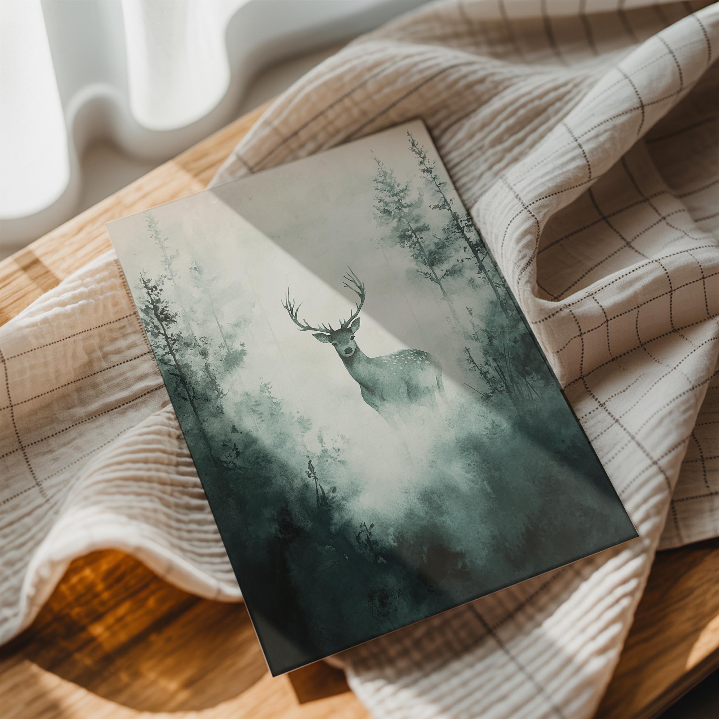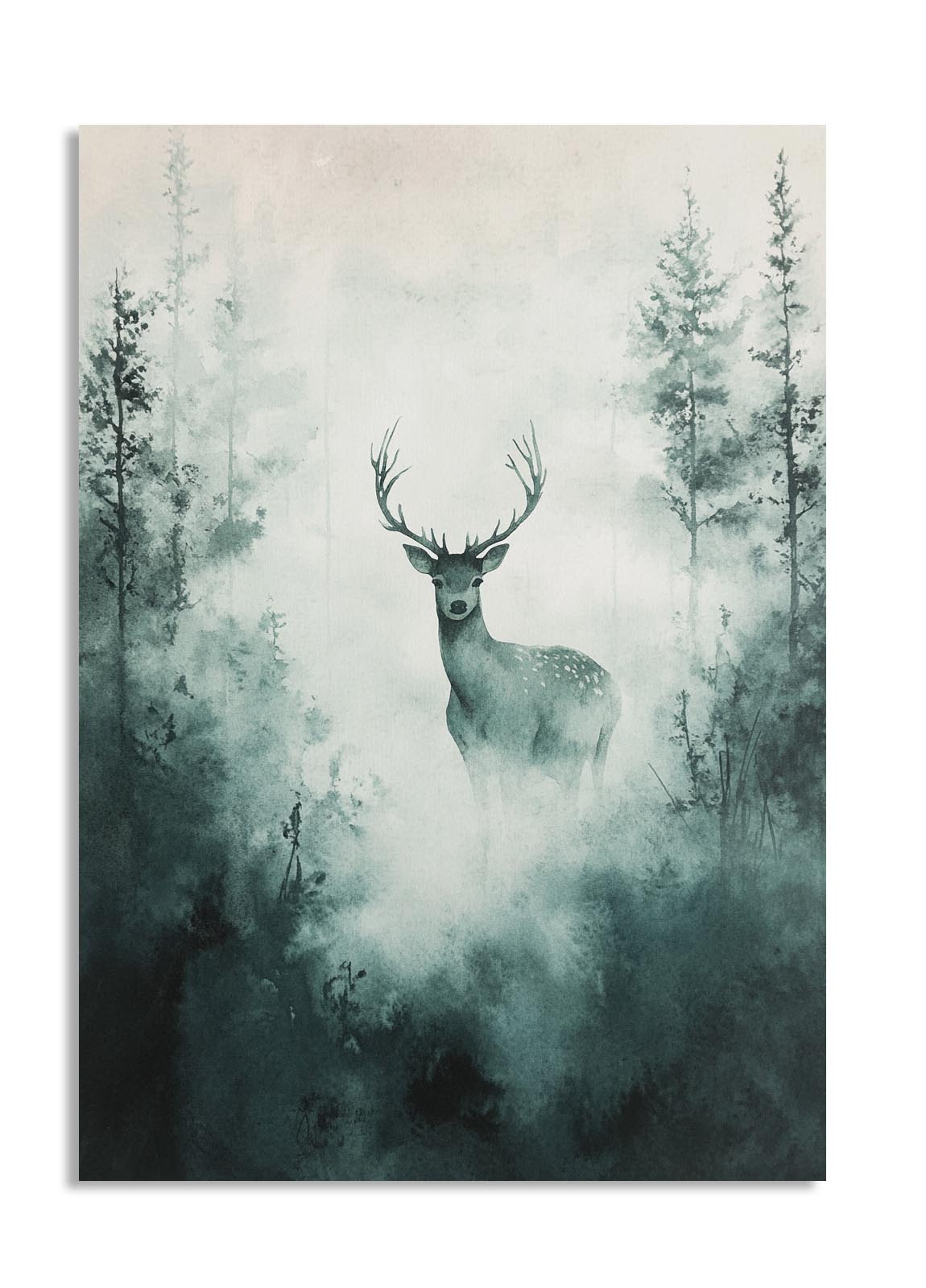 A mesmerizing, atmospheric depiction of a deer standing in a foggy forest, surrounded by towering trees that fade into the mist. The muted green and gray tones create a serene, almost mystical ambiance, making this an ideal piece for lovers of nature and tranquil landscapes. The lone deer, with its poised stance and watchful gaze, symbolizes grace, solitude, and the beauty of the wild. This artwork is perfect for a modern or rustic home, particularly in living rooms or offices where a calming presence is desired.