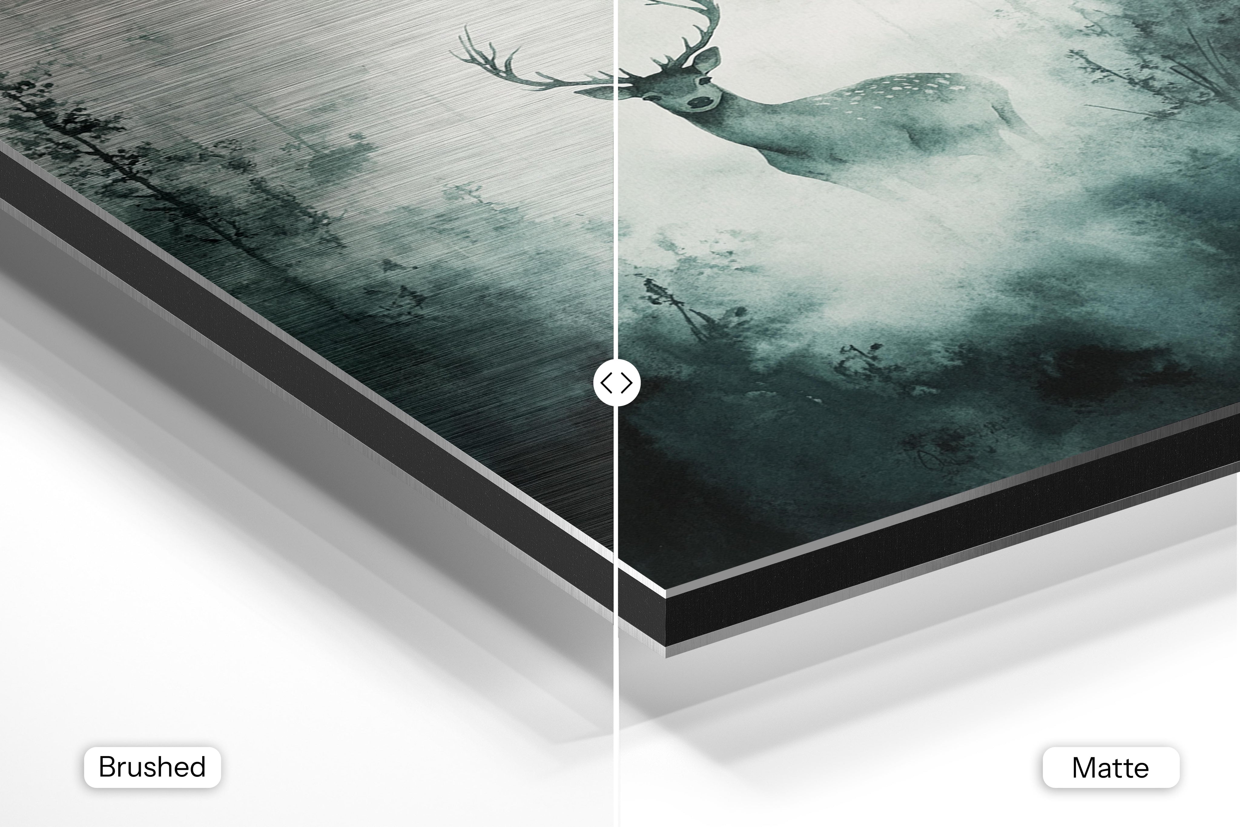 - Brushed Aluminum, on the other hand, features a raw metallic texture with visible brush strokes. Whites and highlights in your image let the silver surface show through, adding a dramatic, shimmering effect. Ideal for black-and-white images, minimalist designs, or abstract art, it creates a bold, industrial vibe with a modern edge.