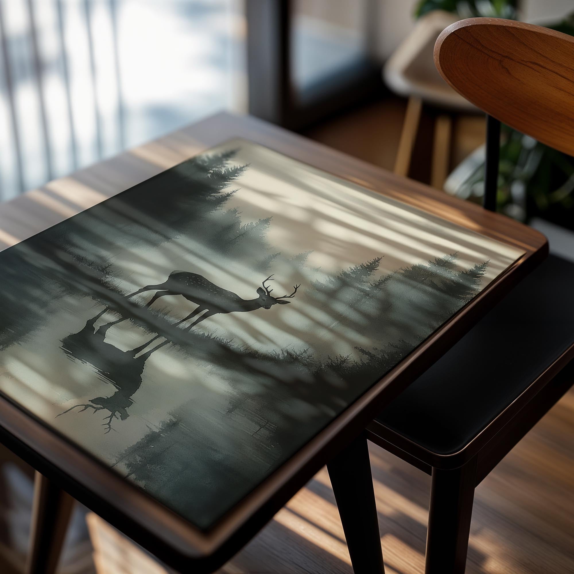 A serene and atmospheric portrayal of a lone deer standing at the edge of a still lake, its reflection perfectly mirroring the foggy landscape. The towering pine trees in the background fade into the mist, creating a quiet and introspective mood. The monochromatic tones add an element of mystery and elegance, making this a stunning addition to minimalist, modern, or nature-inspired spaces. This artwork is an excellent choice for those who love tranquil, meditative imagery that evokes a sense of solitude, nature’s beauty, and quiet contemplation.