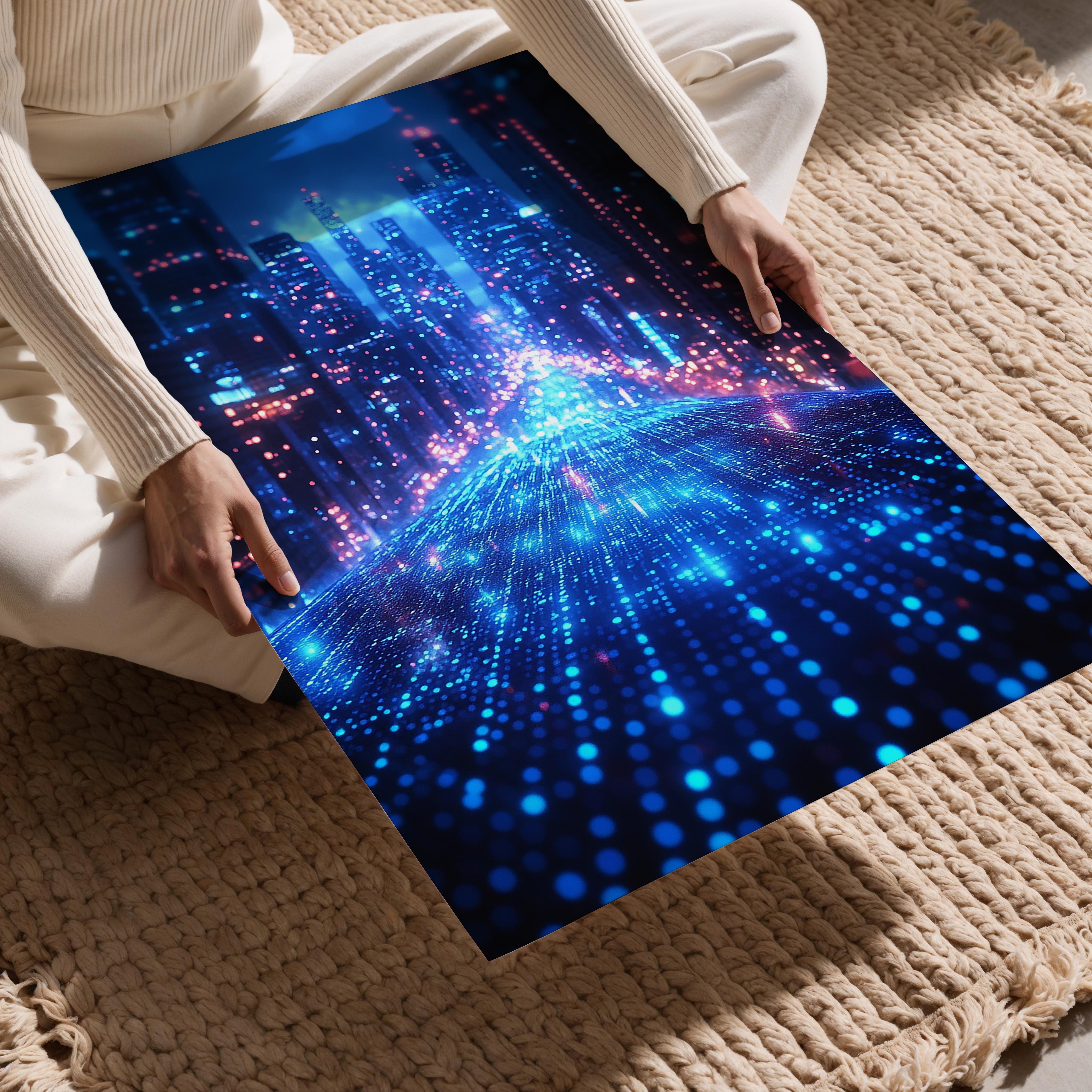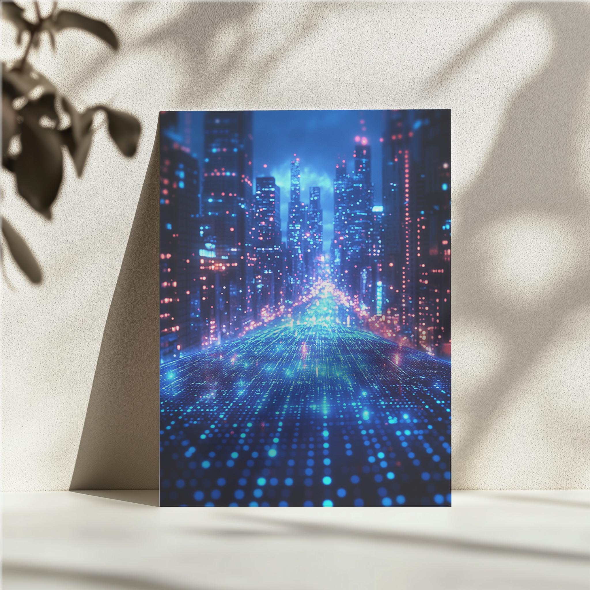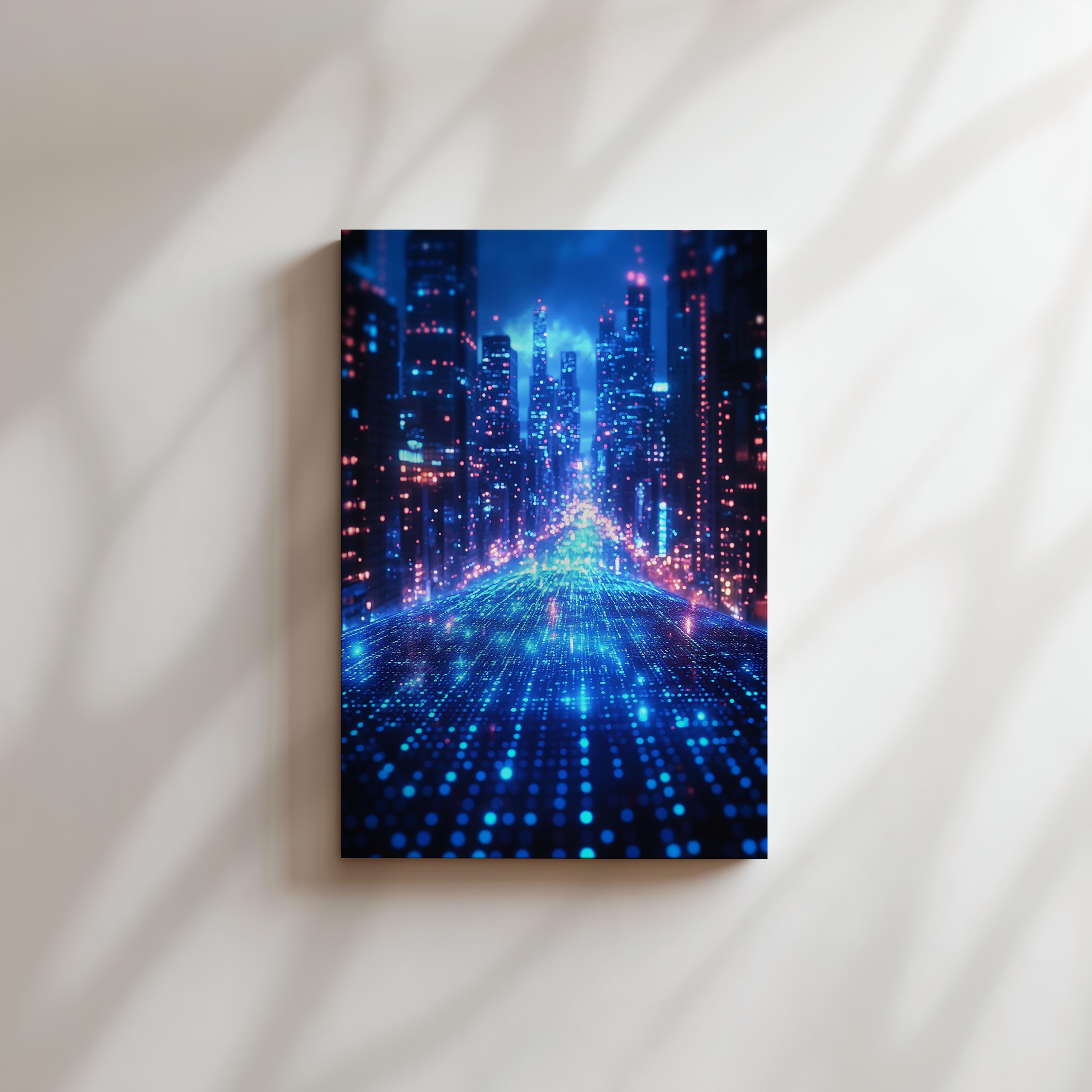 A vibrant digital cityscape filled with glowing blue lights and a futuristic skyline. This image captures the energy of a tech-infused metropolis, making it perfect for technology enthusiasts or urban decor settings. The shimmering light trails create a sense of movement and innovation, symbolizing the pulse of modern city life. Ideal for hanging in tech firms, co-working spaces, or modern homes seeking a dynamic and forward-looking aesthetic.