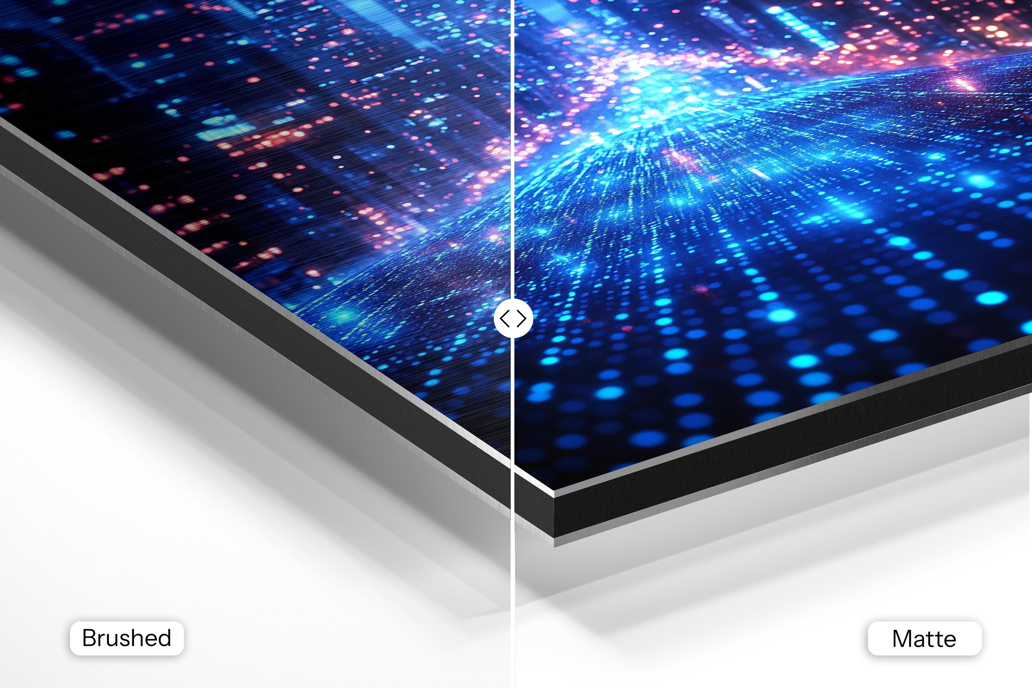 - Brushed Aluminum, on the other hand, features a raw metallic texture with visible brush strokes. Whites and highlights in your image let the silver surface show through, adding a dramatic, shimmering effect. Ideal for black-and-white images, minimalist designs, or abstract art, it creates a bold, industrial vibe with a modern edge.