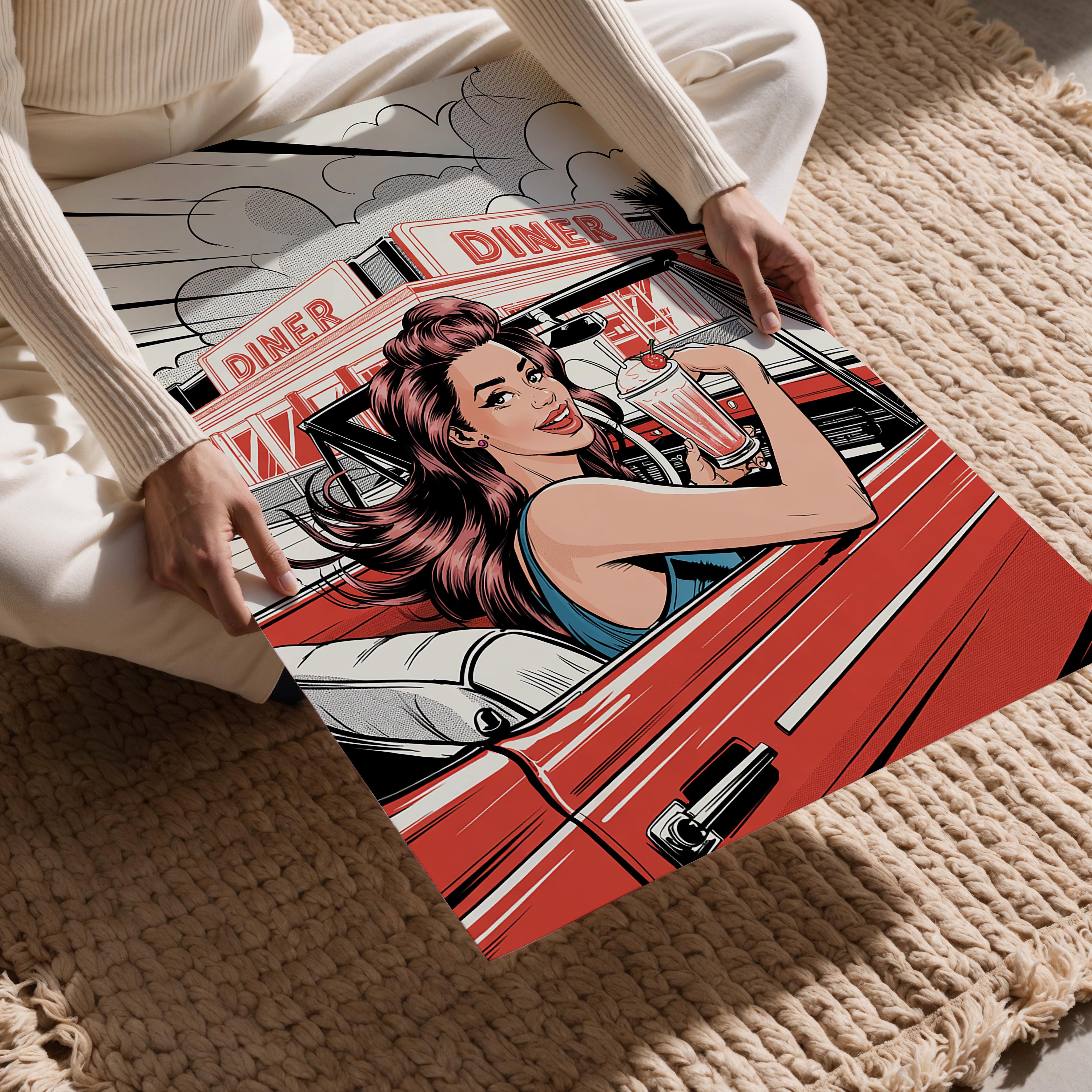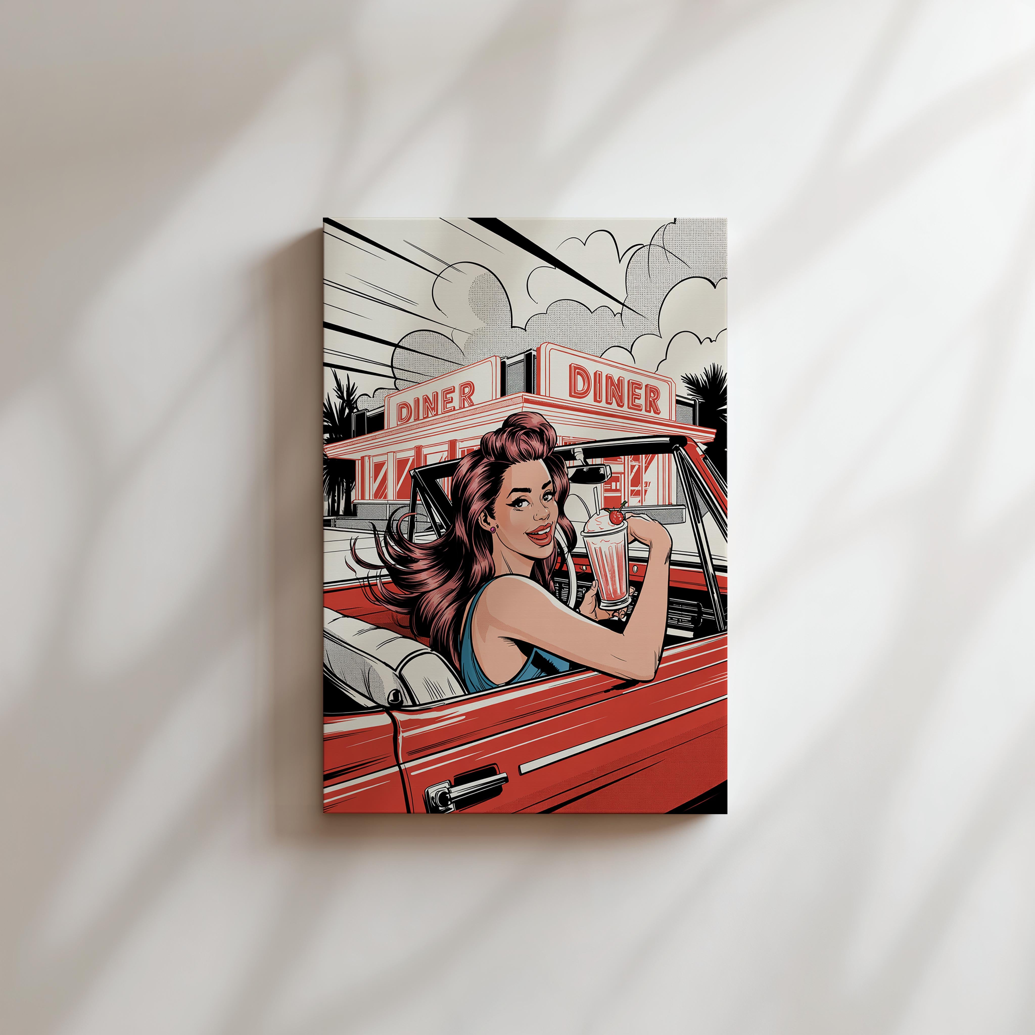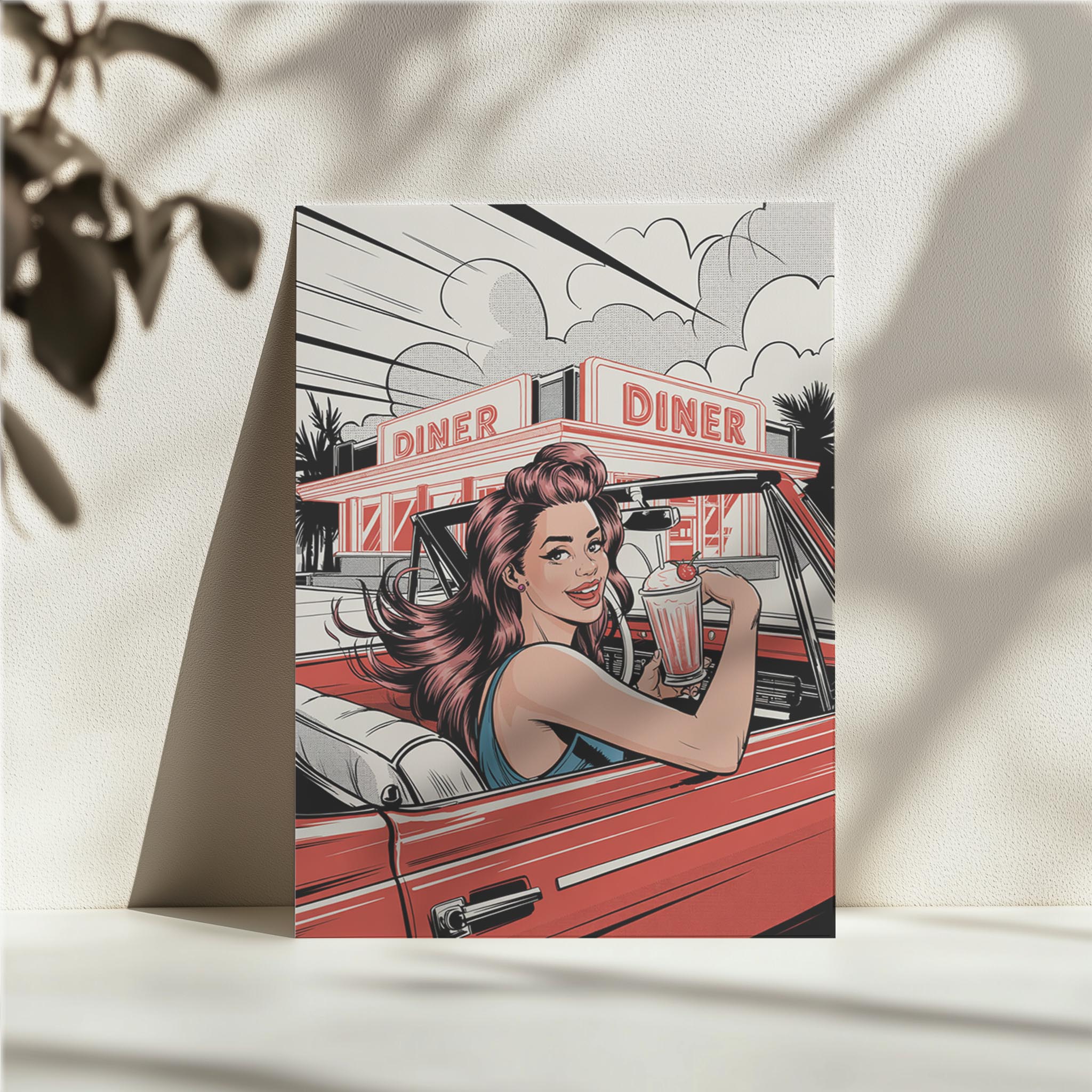 A stylish woman in a convertible raises a milkshake in greeting, parked outside a retro American diner. With clean linework, soft red and beige tones, and a nostalgic atmosphere, this illustration captures the joy and simplicity of 1950s car culture. Her confident smile and glamorous waves create a welcoming, cinematic moment. Perfect for kitchens, diners, or vintage-inspired rooms, this piece conjures feelings of youthful romance and the golden age of Americana. A timeless choice with a cool, flirty charm.
