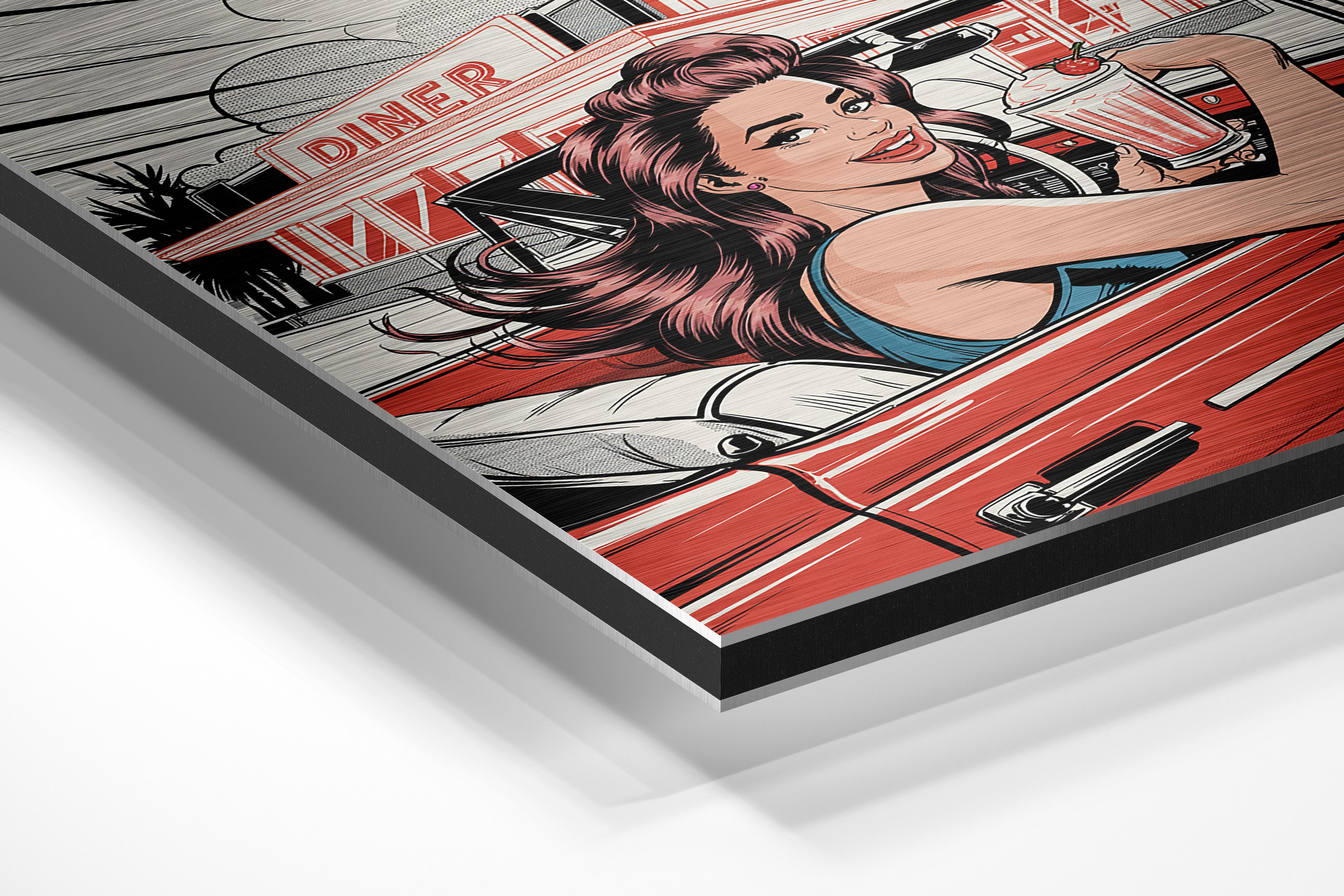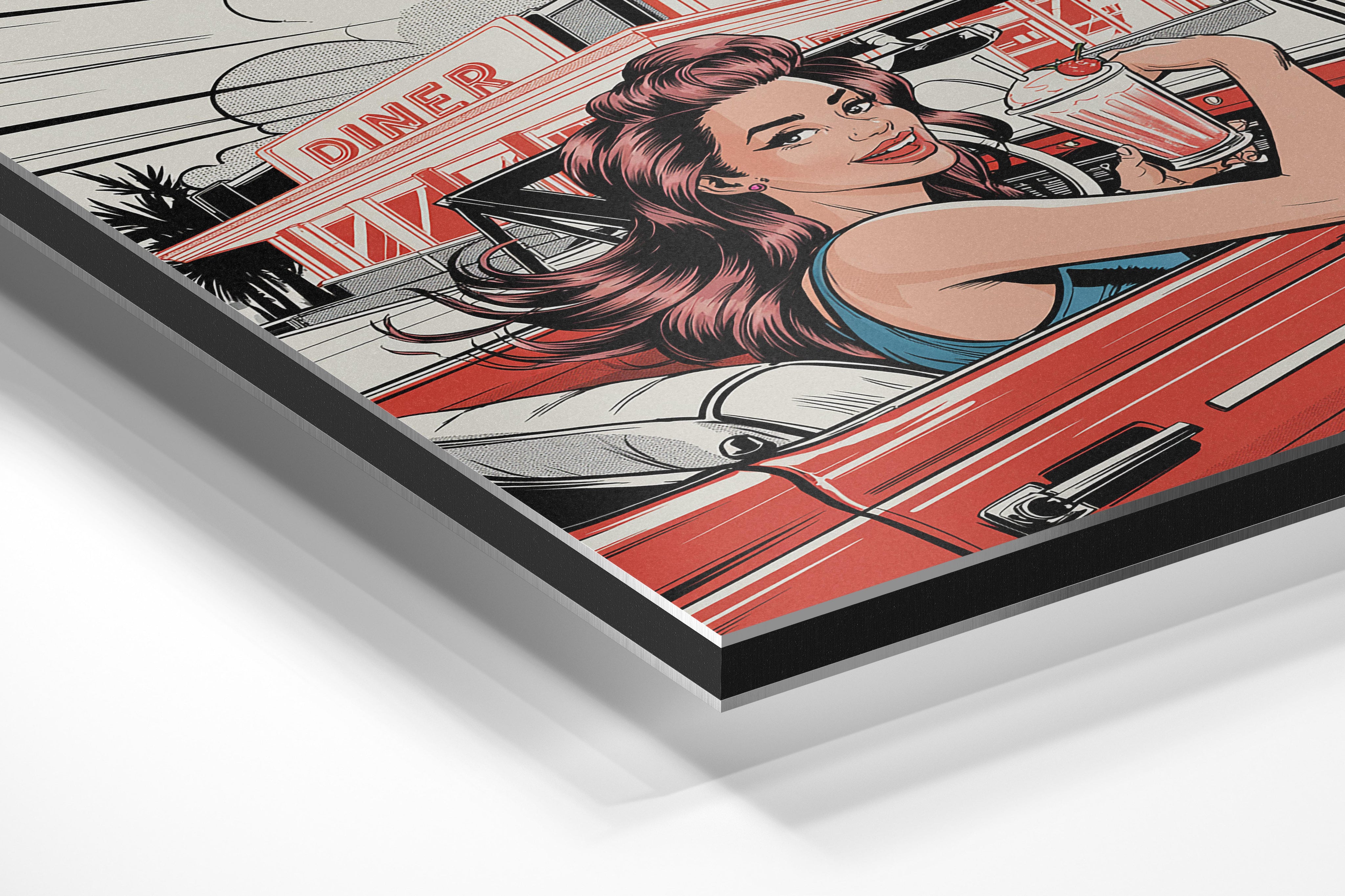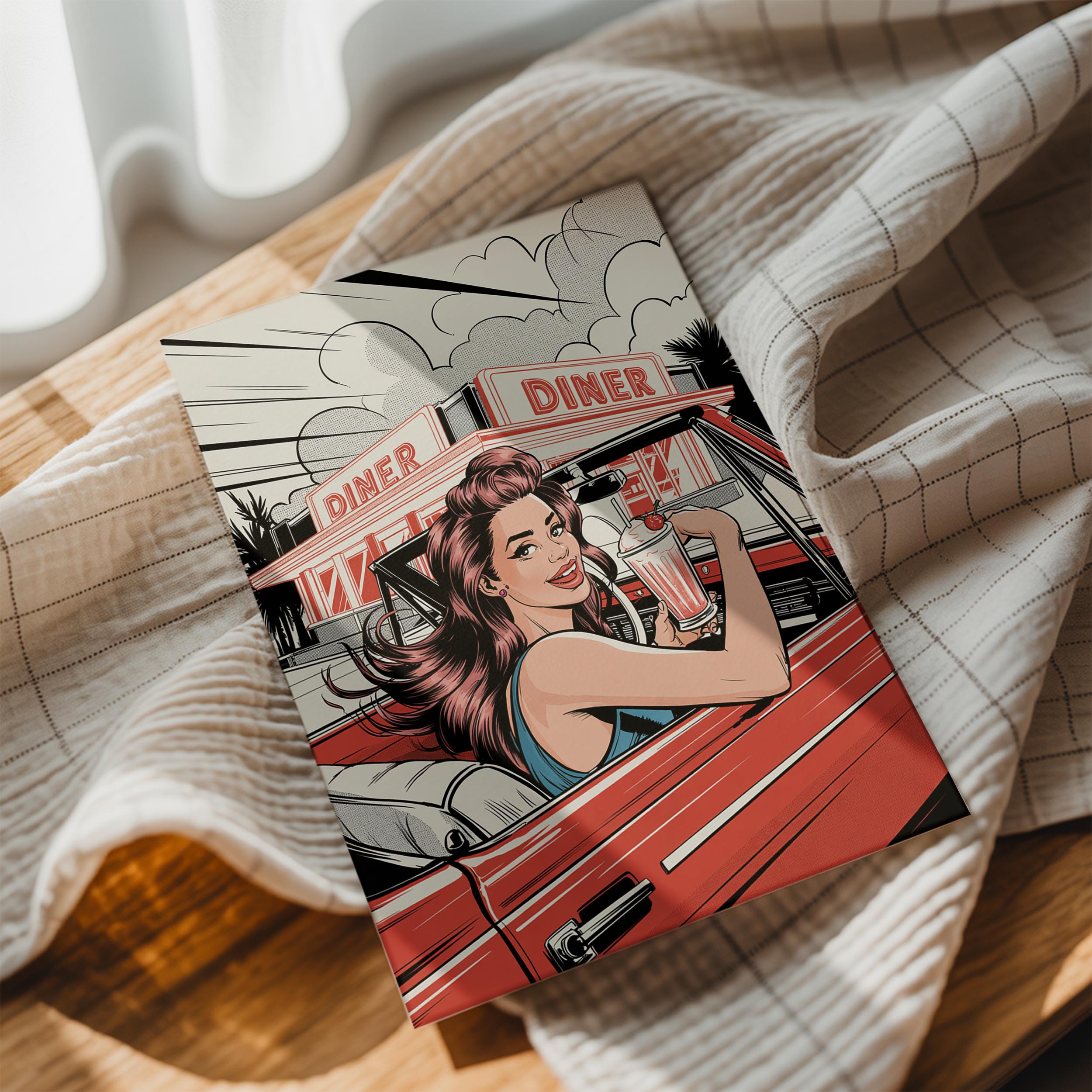 A stylish woman in a convertible raises a milkshake in greeting, parked outside a retro American diner. With clean linework, soft red and beige tones, and a nostalgic atmosphere, this illustration captures the joy and simplicity of 1950s car culture. Her confident smile and glamorous waves create a welcoming, cinematic moment. Perfect for kitchens, diners, or vintage-inspired rooms, this piece conjures feelings of youthful romance and the golden age of Americana. A timeless choice with a cool, flirty charm.