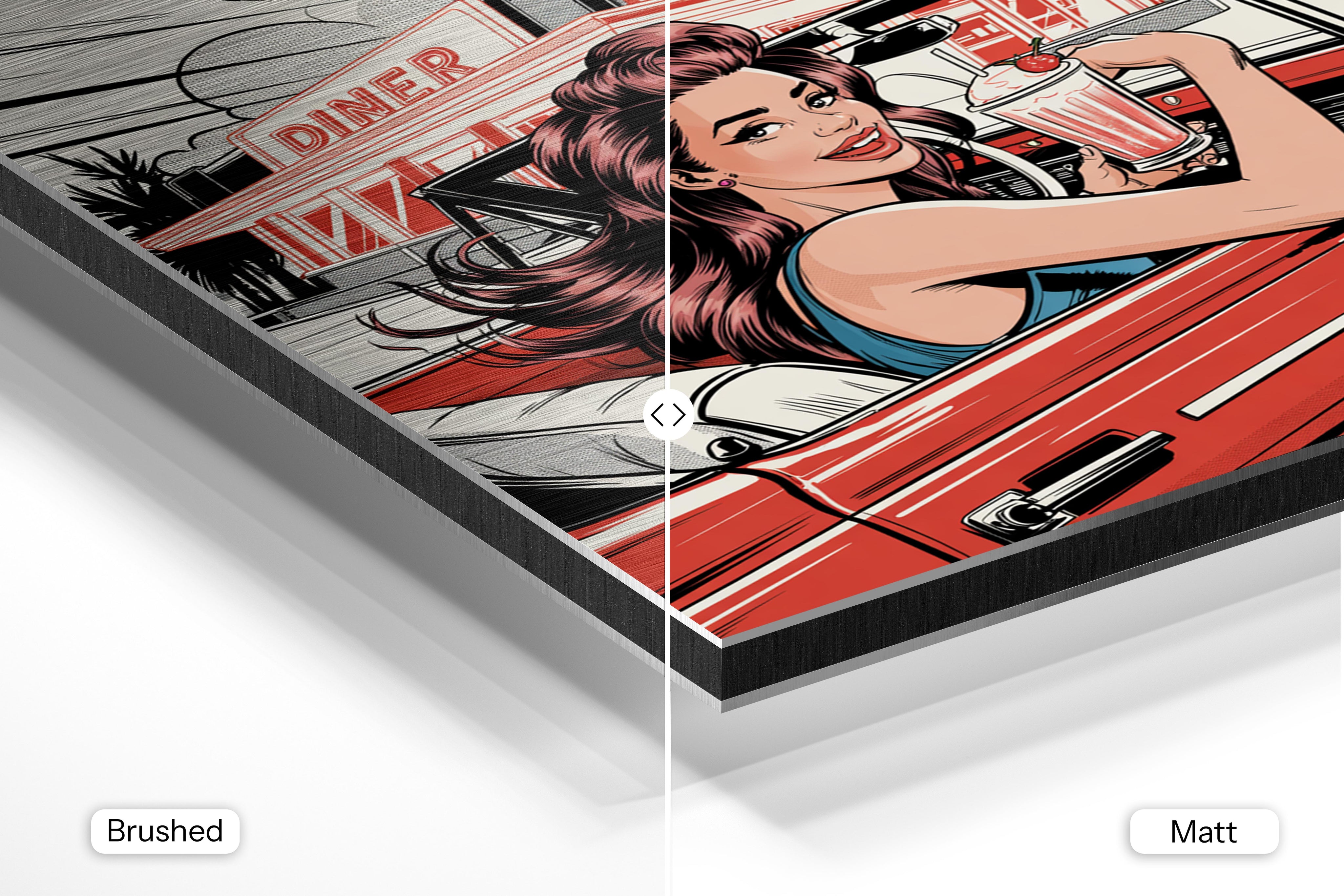 - Matte Aluminum offers a smooth, bright white surface that delivers crisp details and vibrant, true-to-life colors. With its non-reflective finish and subtle silky sheen, it’s perfect for photography, portraits, and colorful artwork—bringing a clean, polished look to any interior.