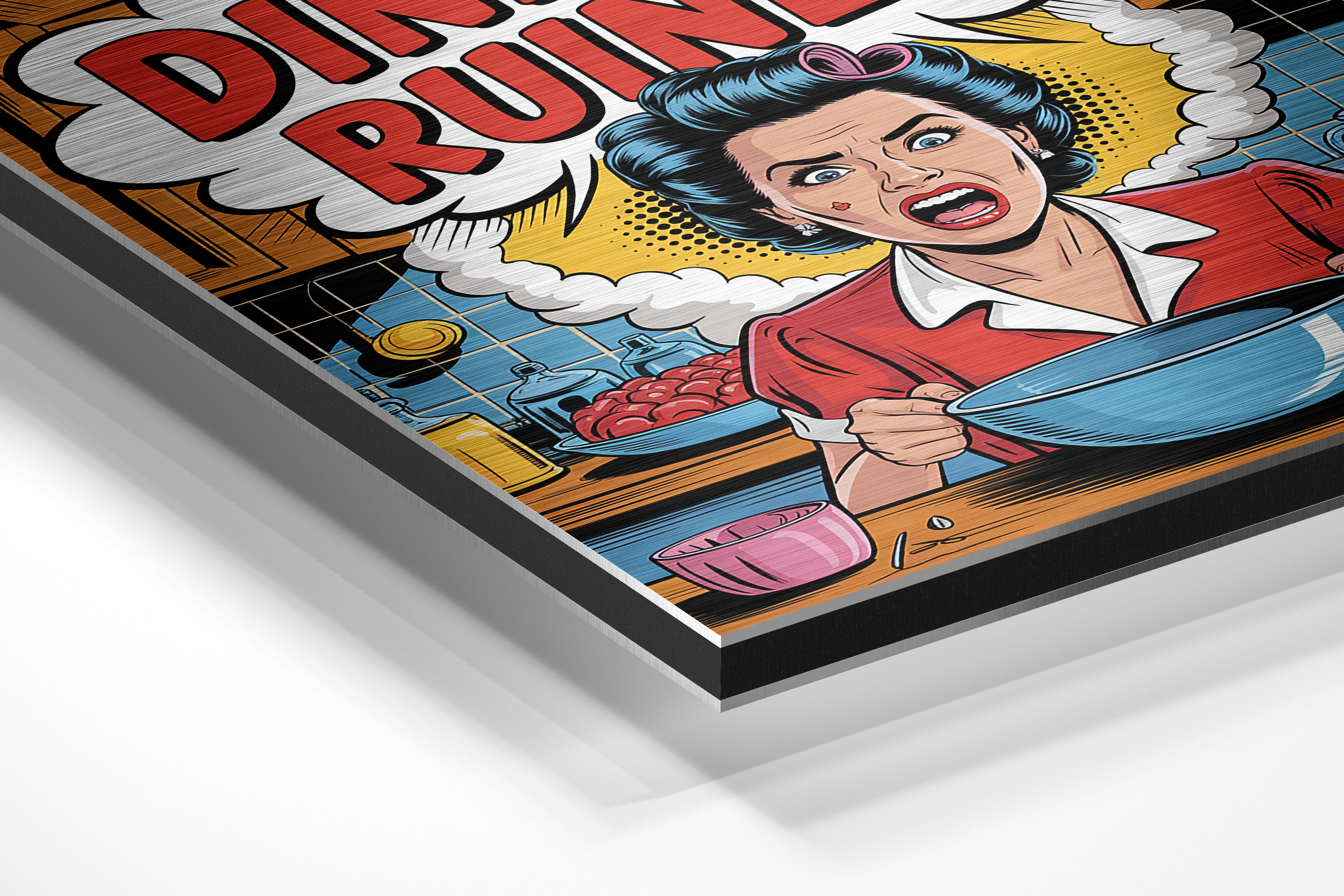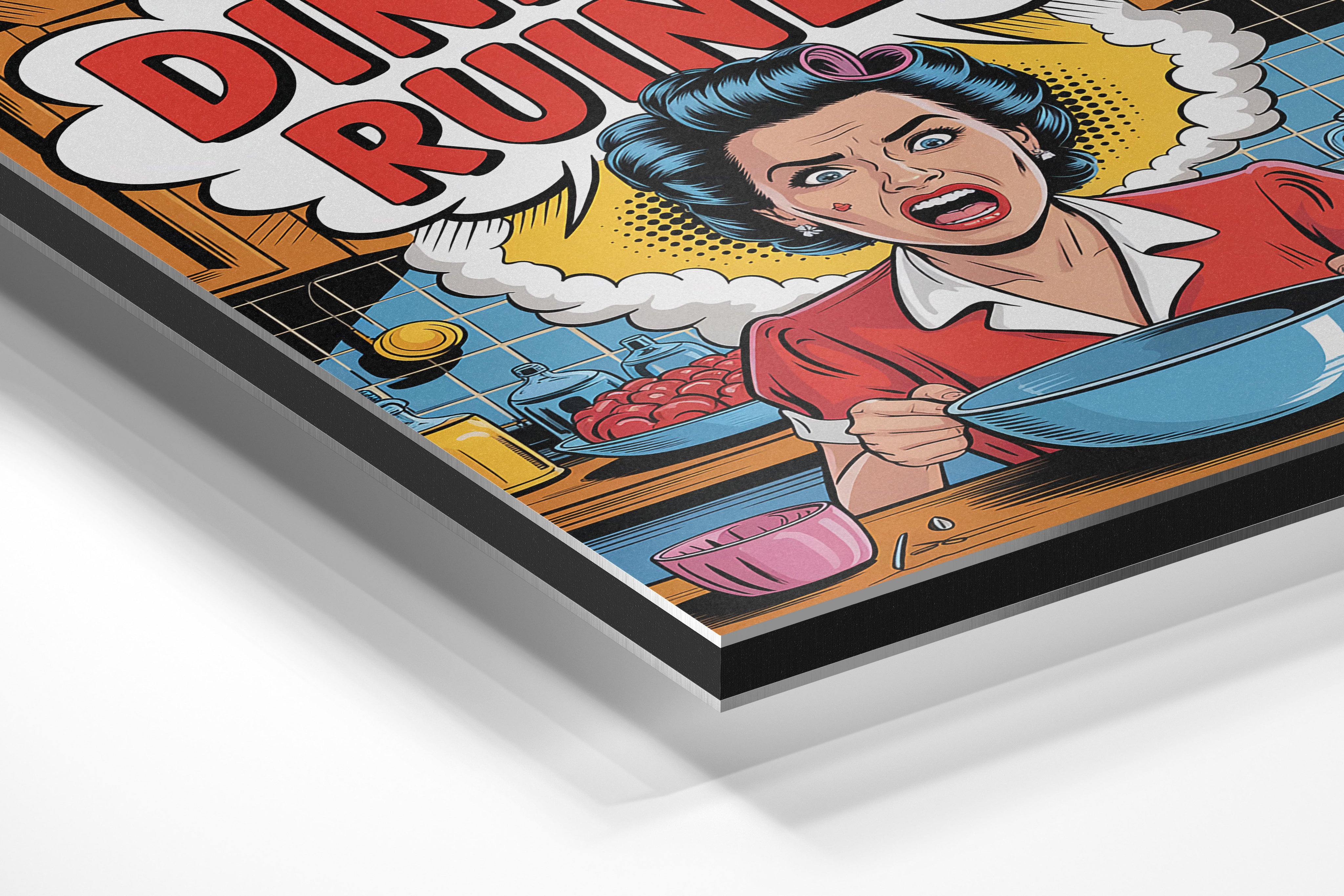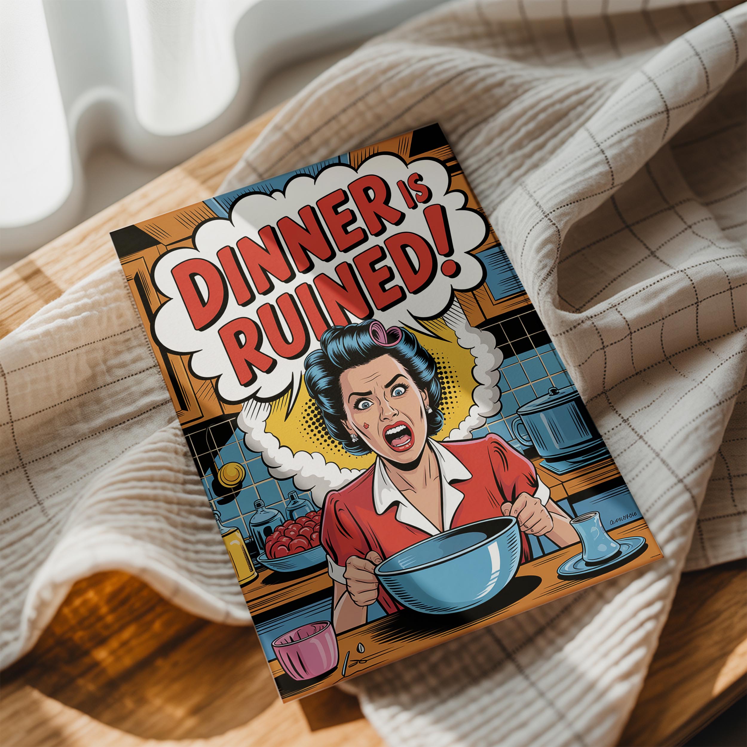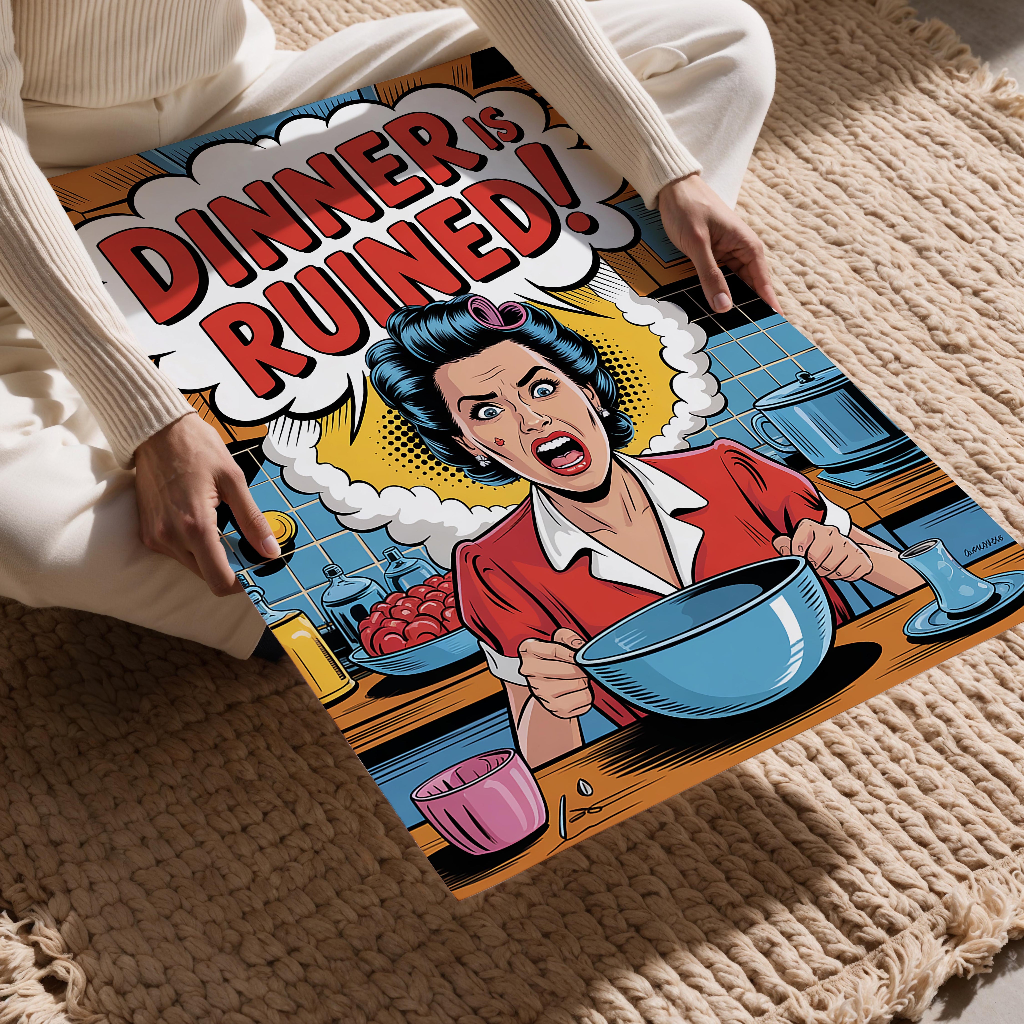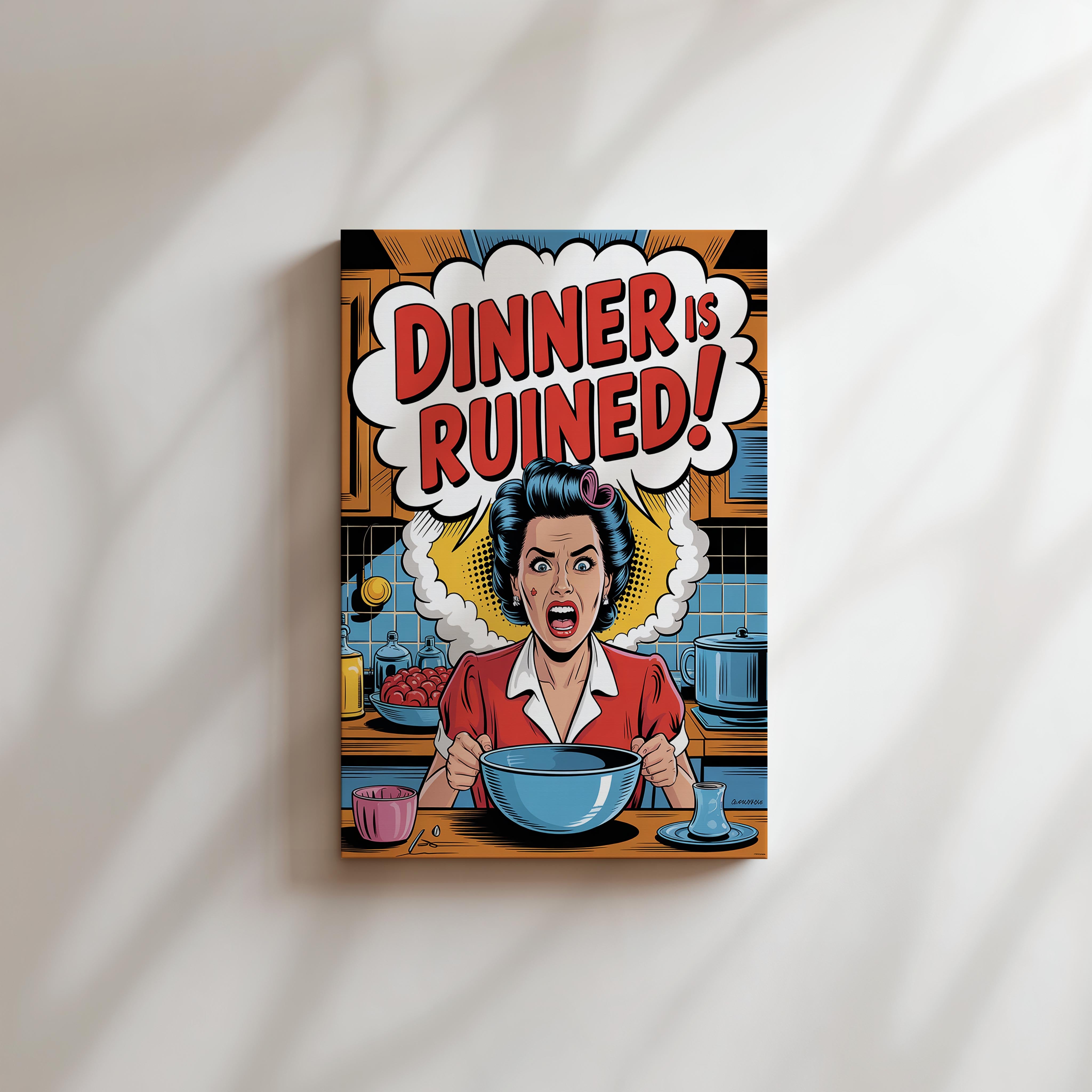 A retro-style housewife, wide-eyed and furious, shouts 'DINNER IS RUINED!' in this dramatic and hilarious pop-art piece. Surrounded by kitchen elements and rendered in vintage comic style, it playfully exaggerates domestic frustration. Perfect for kitchens or dining areas with a sense of humor, this image mixes 1950s aesthetics with timeless emotional outbursts. It’s especially appealing to fans of kitsch or retro décor, making it a standout piece that blends humor and classic illustration.