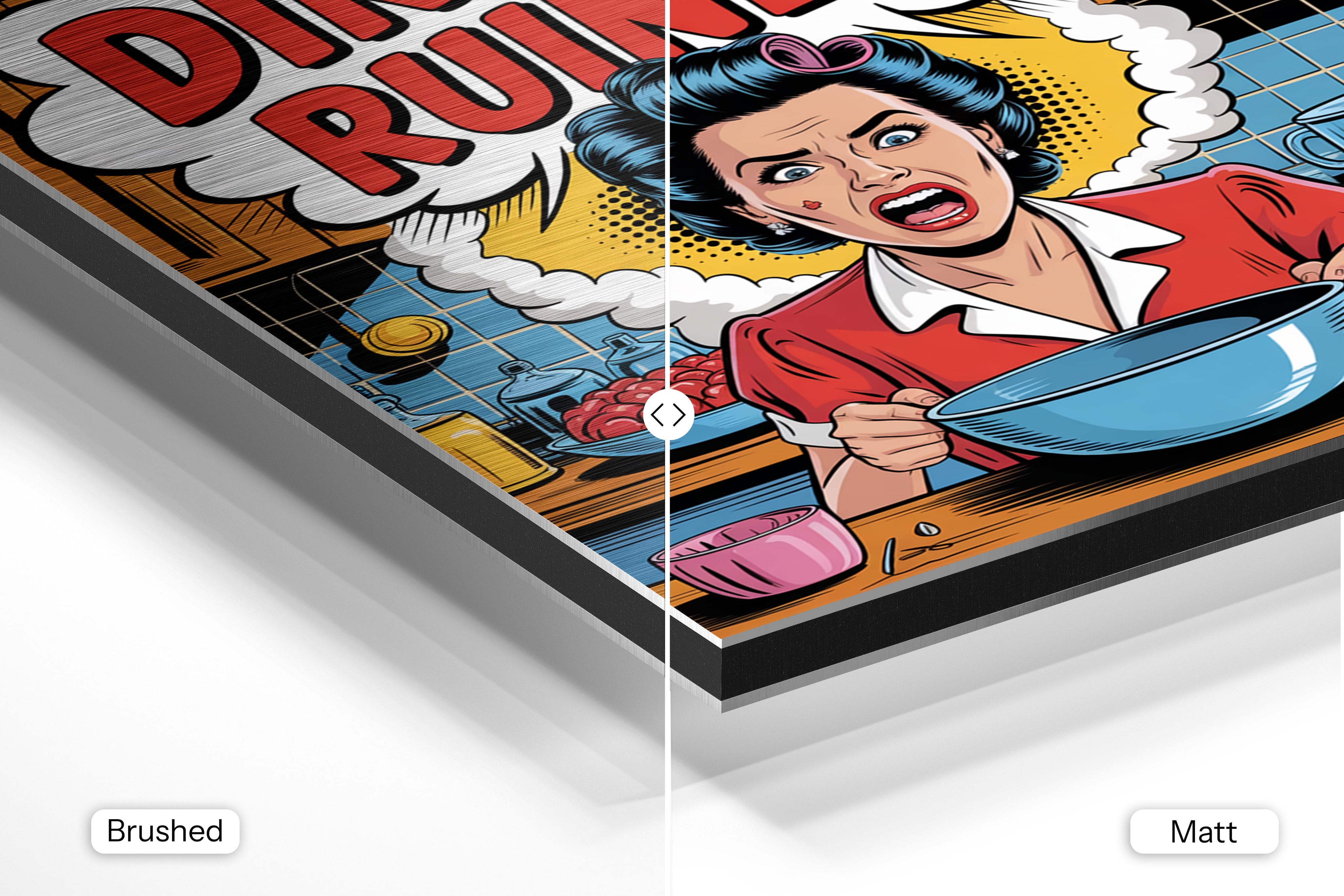 - Matte Aluminum offers a smooth, bright white surface that delivers crisp details and vibrant, true-to-life colors. With its non-reflective finish and subtle silky sheen, it’s perfect for photography, portraits, and colorful artwork—bringing a clean, polished look to any interior.
