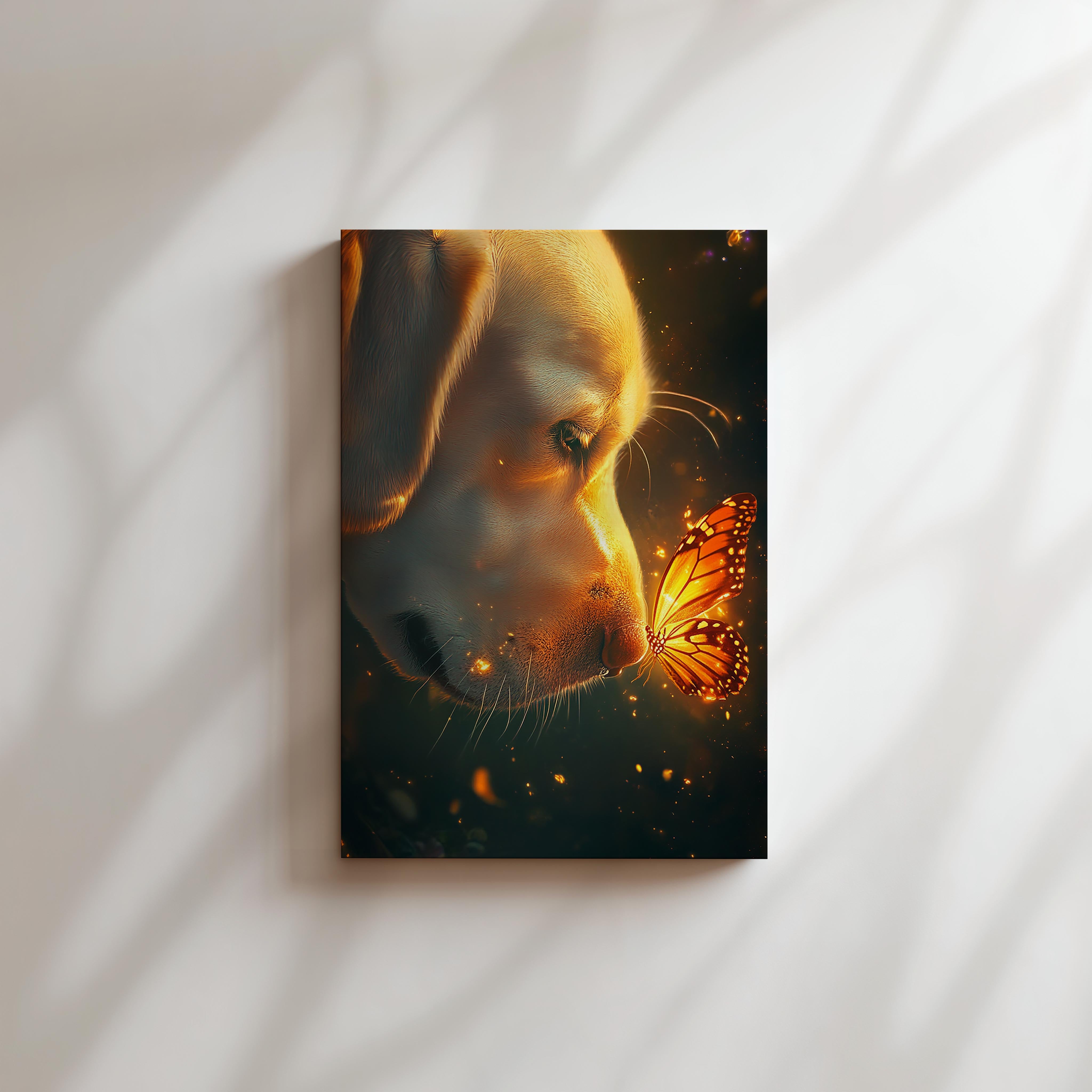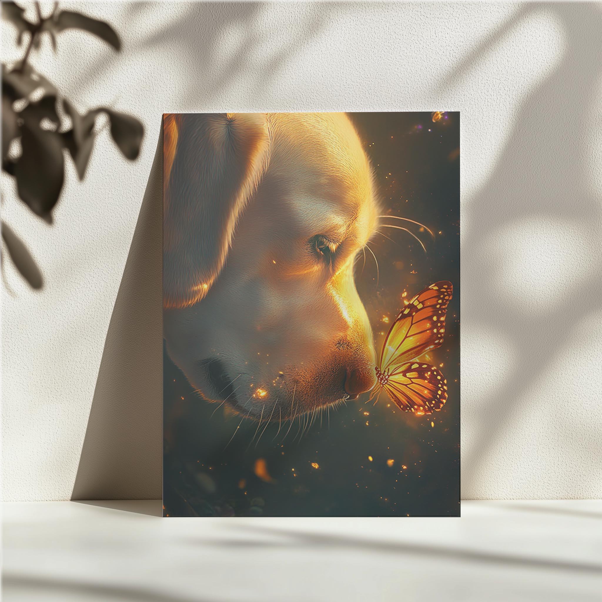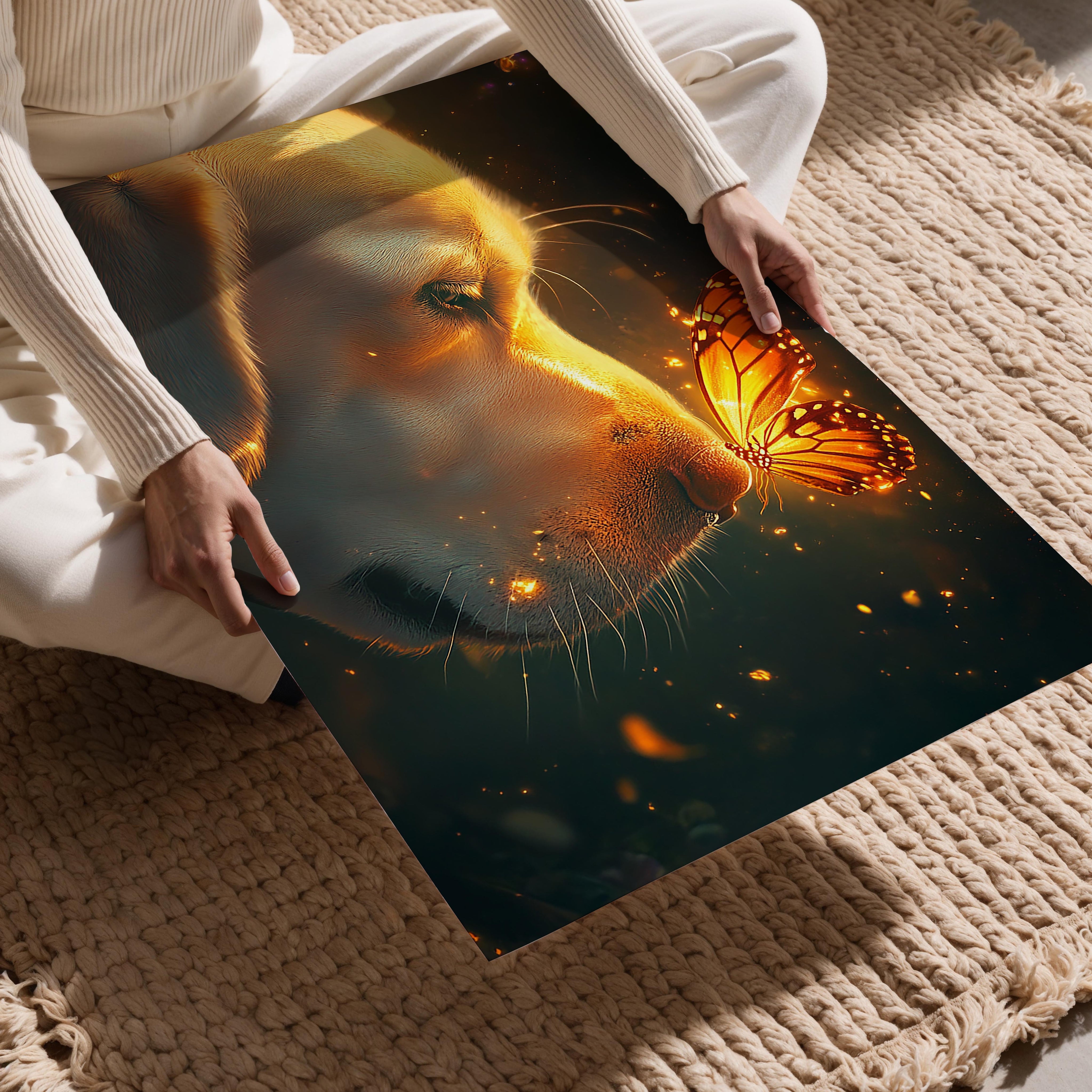 This enchanting artwork features a close-up of a dog gazing curiously at a glowing butterfly resting on its nose. The golden light from the butterfly illuminates the dog’s face, creating a mesmerizing and magical effect. The attention to detail in the fur, combined with the dreamy lighting, makes this piece perfect for those who appreciate whimsical, emotional artwork. Ideal for pet lovers, cozy corners, or fantasy-inspired interiors.