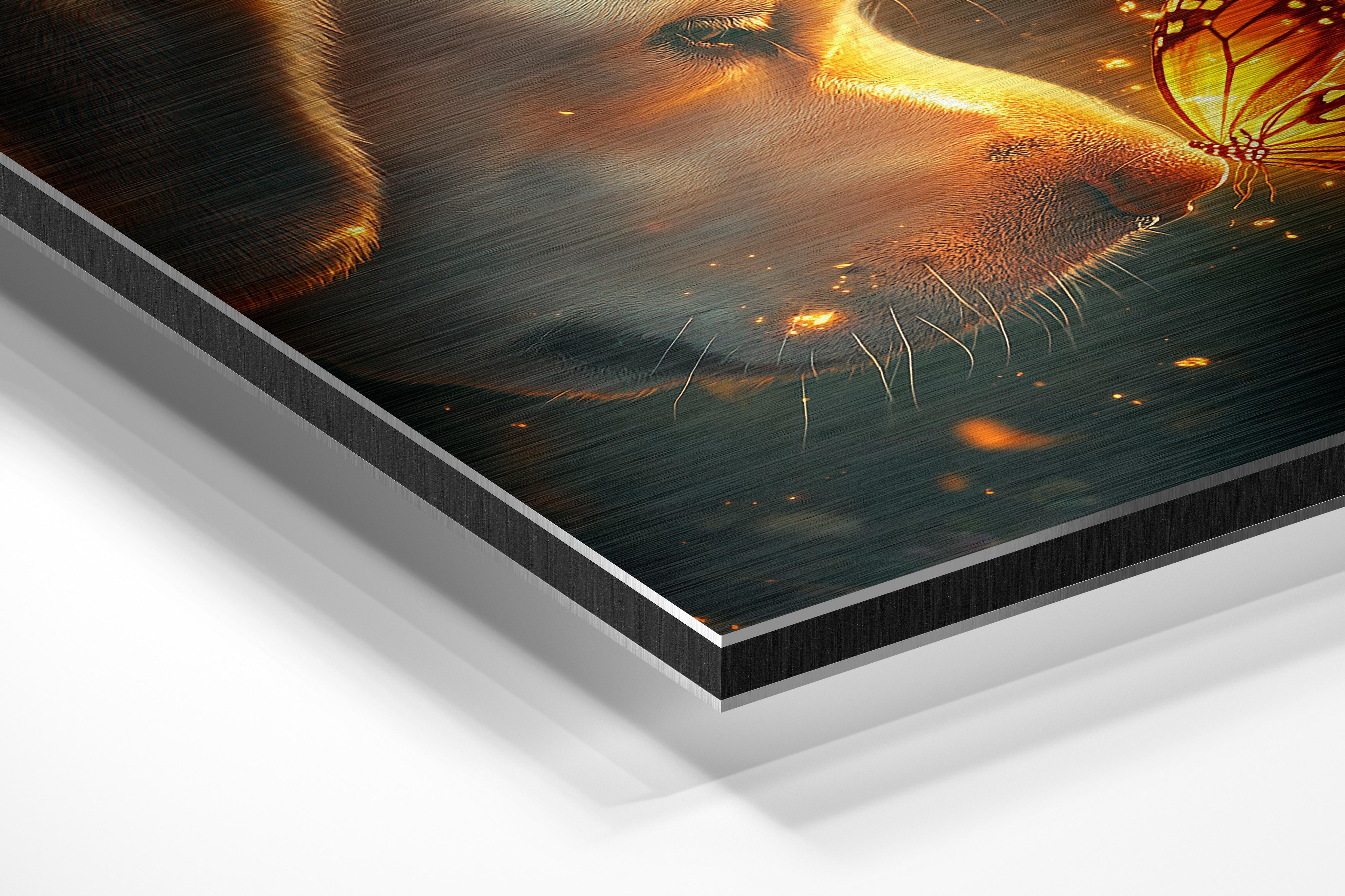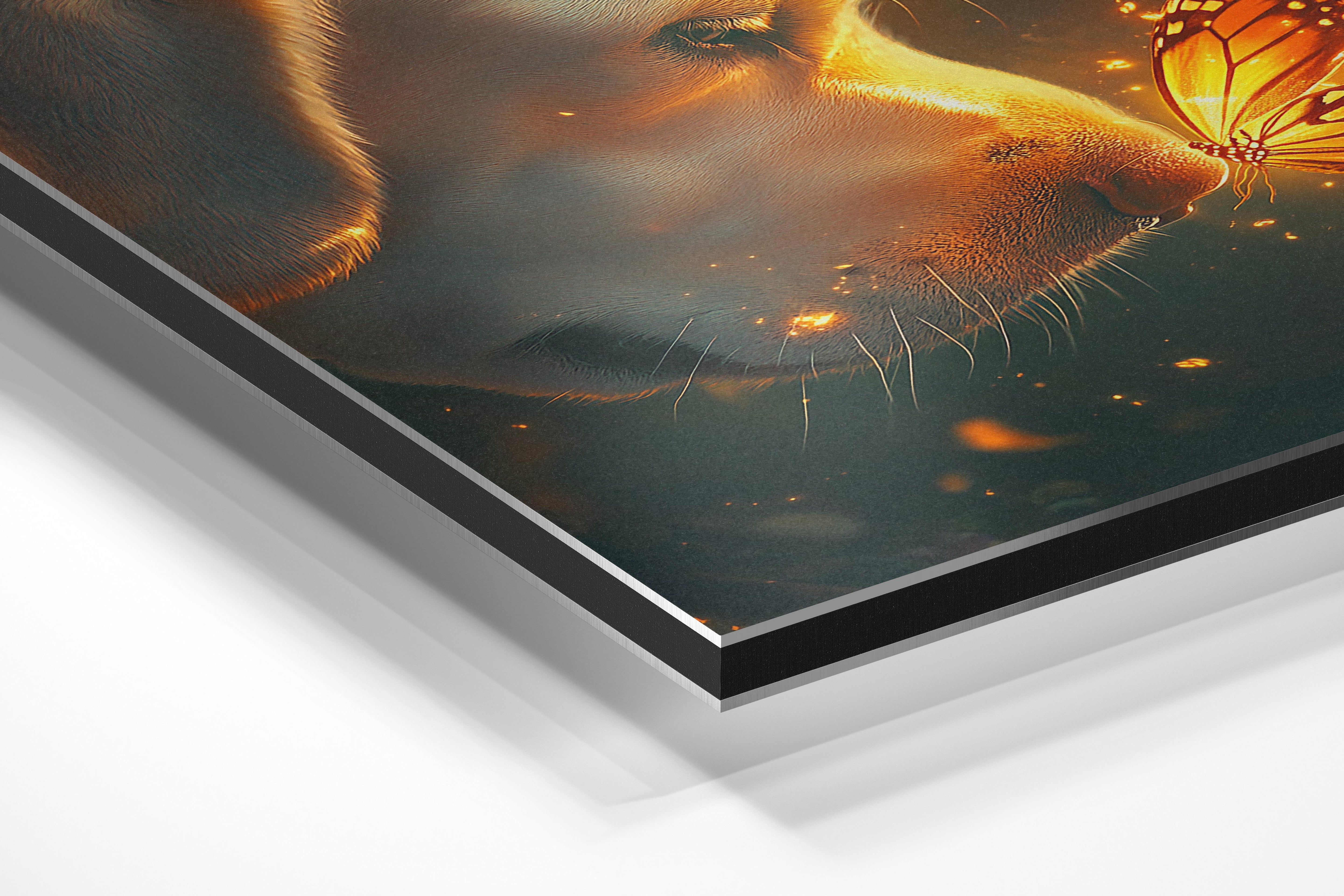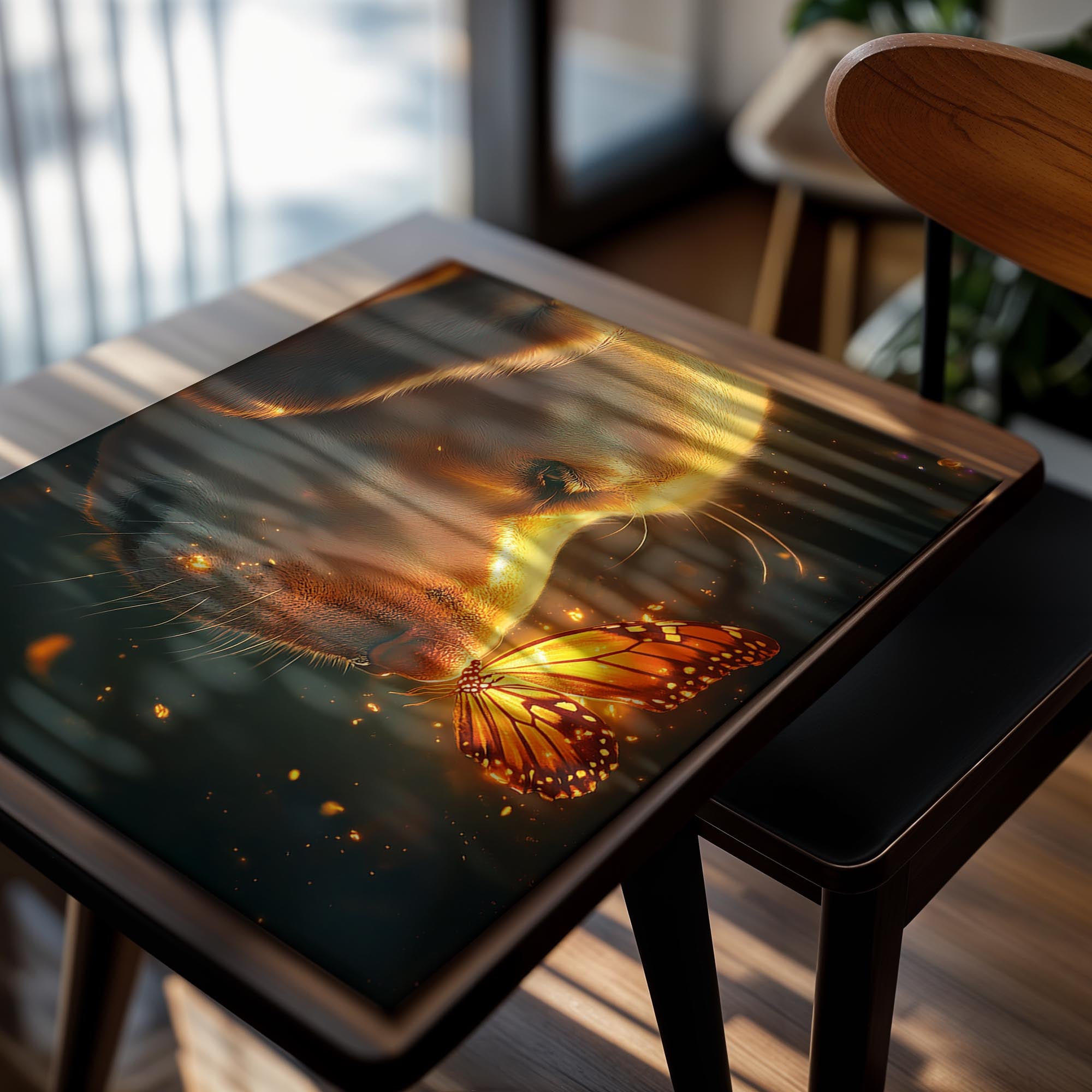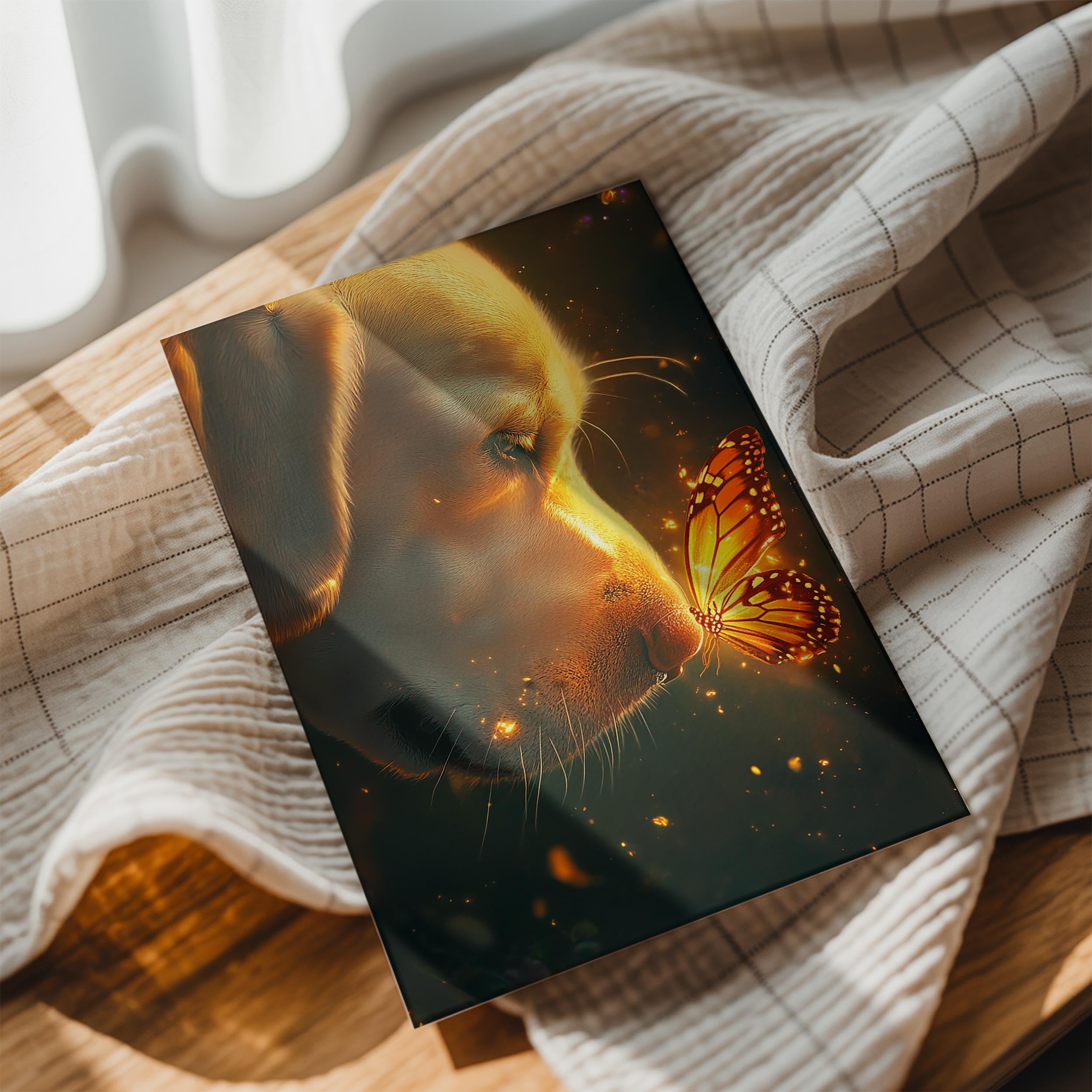 This enchanting artwork features a close-up of a dog gazing curiously at a glowing butterfly resting on its nose. The golden light from the butterfly illuminates the dog’s face, creating a mesmerizing and magical effect. The attention to detail in the fur, combined with the dreamy lighting, makes this piece perfect for those who appreciate whimsical, emotional artwork. Ideal for pet lovers, cozy corners, or fantasy-inspired interiors.