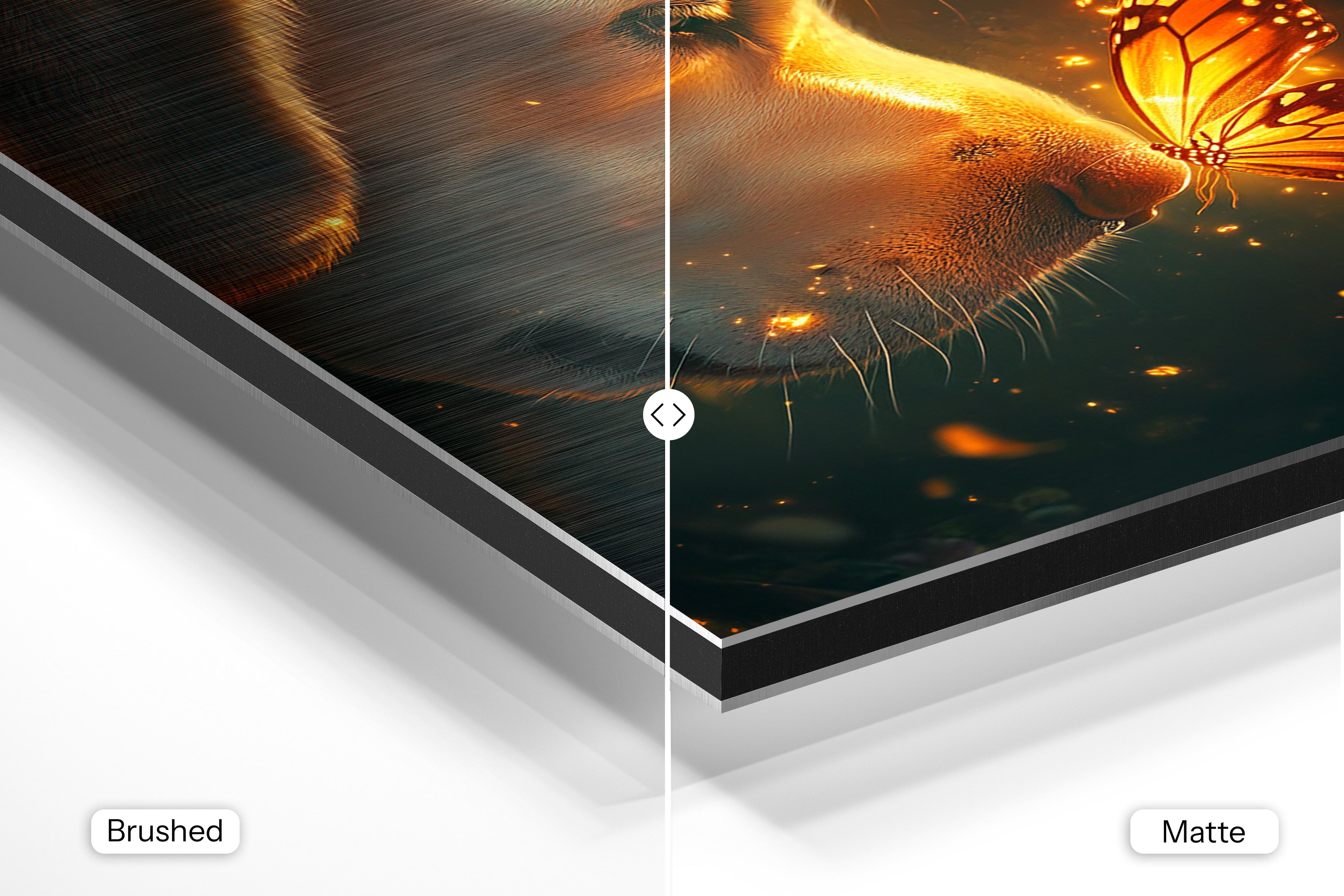 - Brushed Aluminum, on the other hand, features a raw metallic texture with visible brush strokes. Whites and highlights in your image let the silver surface show through, adding a dramatic, shimmering effect. Ideal for black-and-white images, minimalist designs, or abstract art, it creates a bold, industrial vibe with a modern edge.