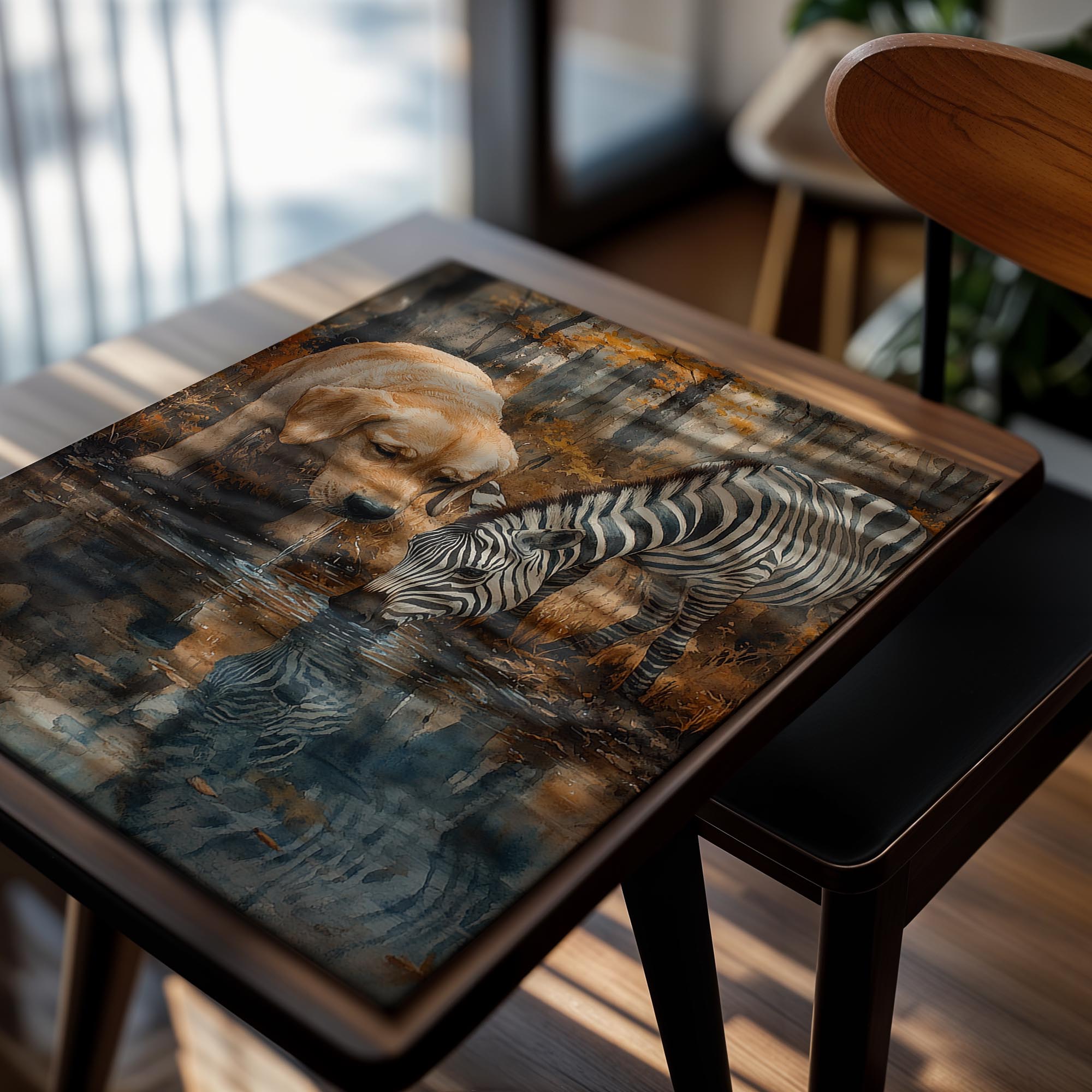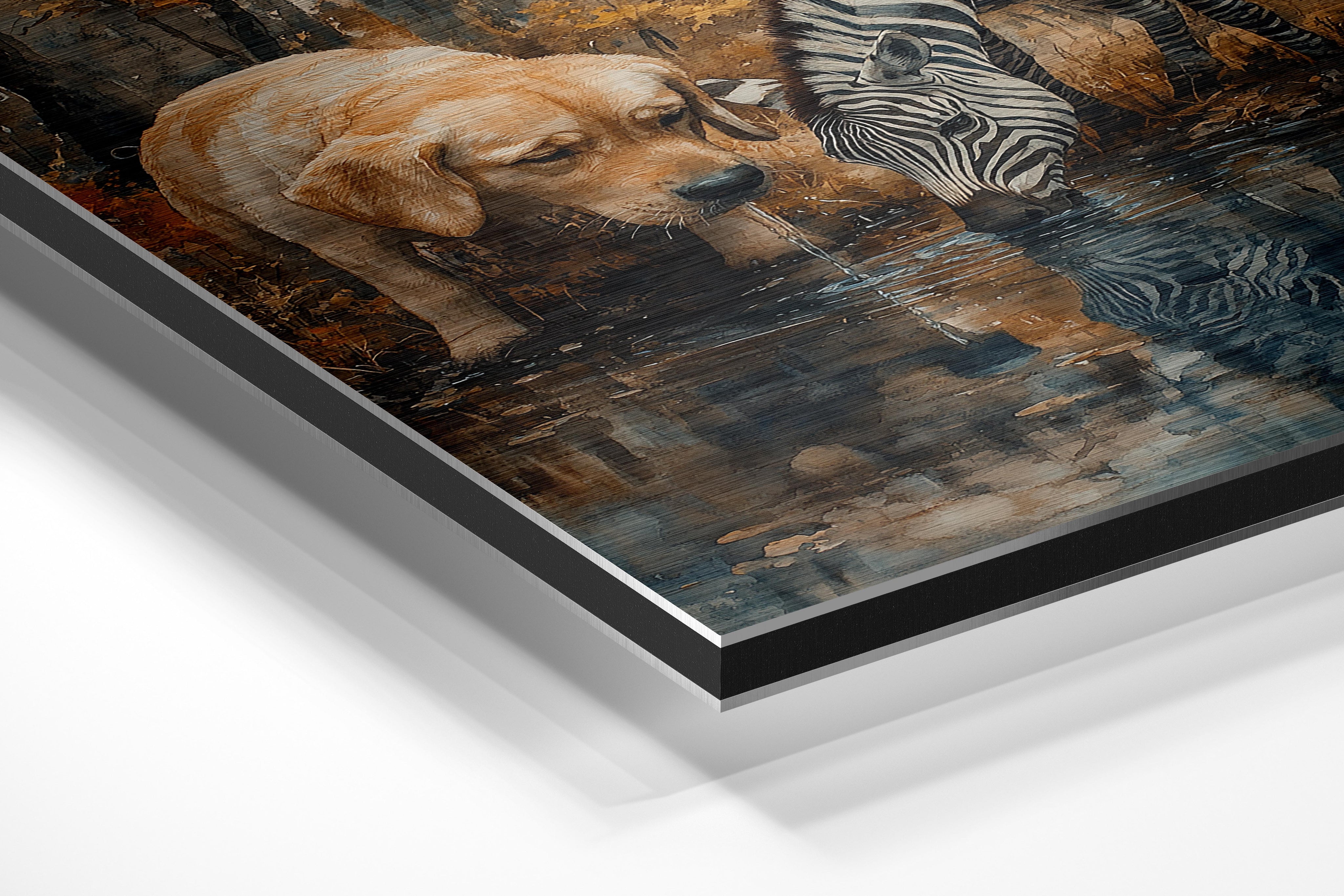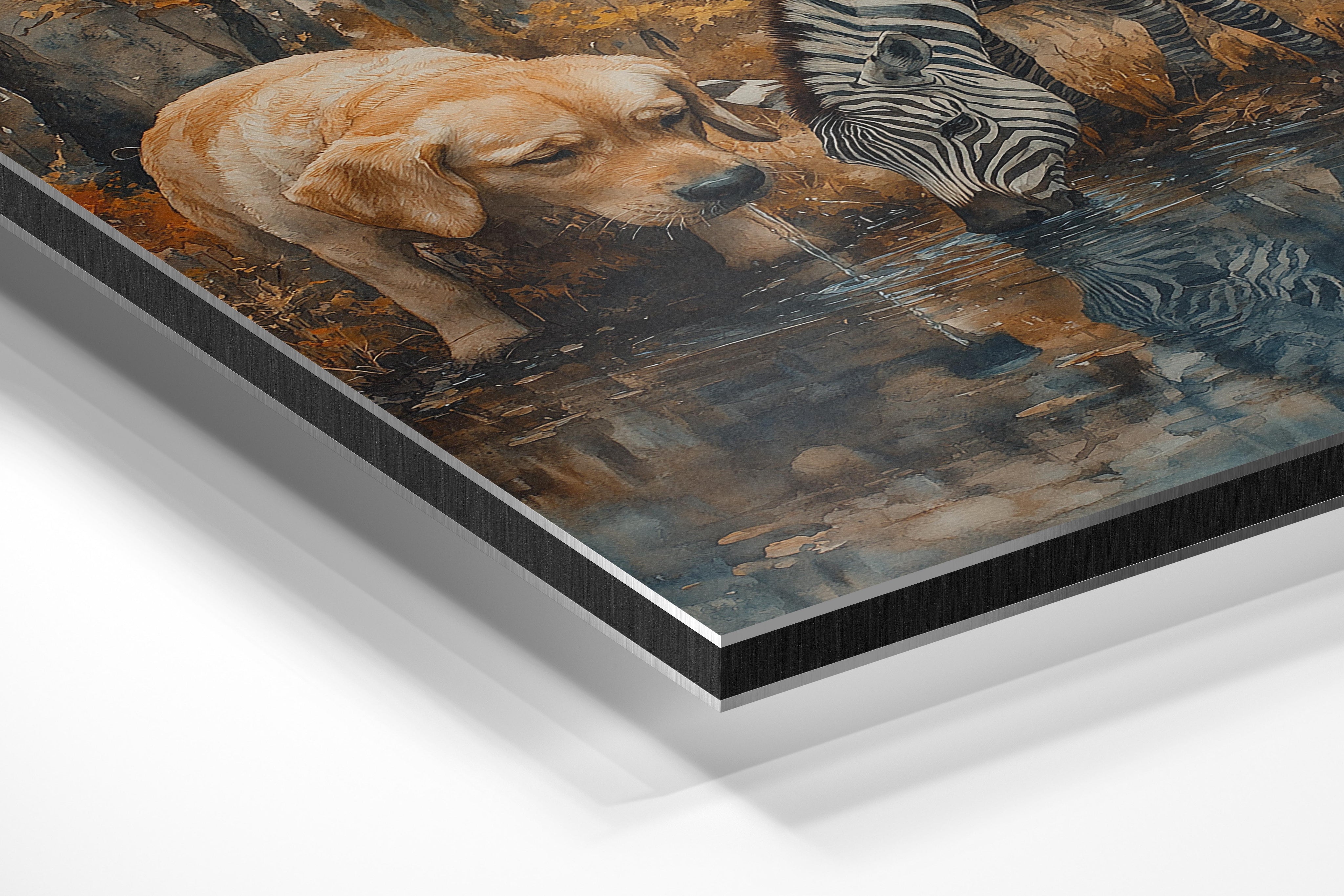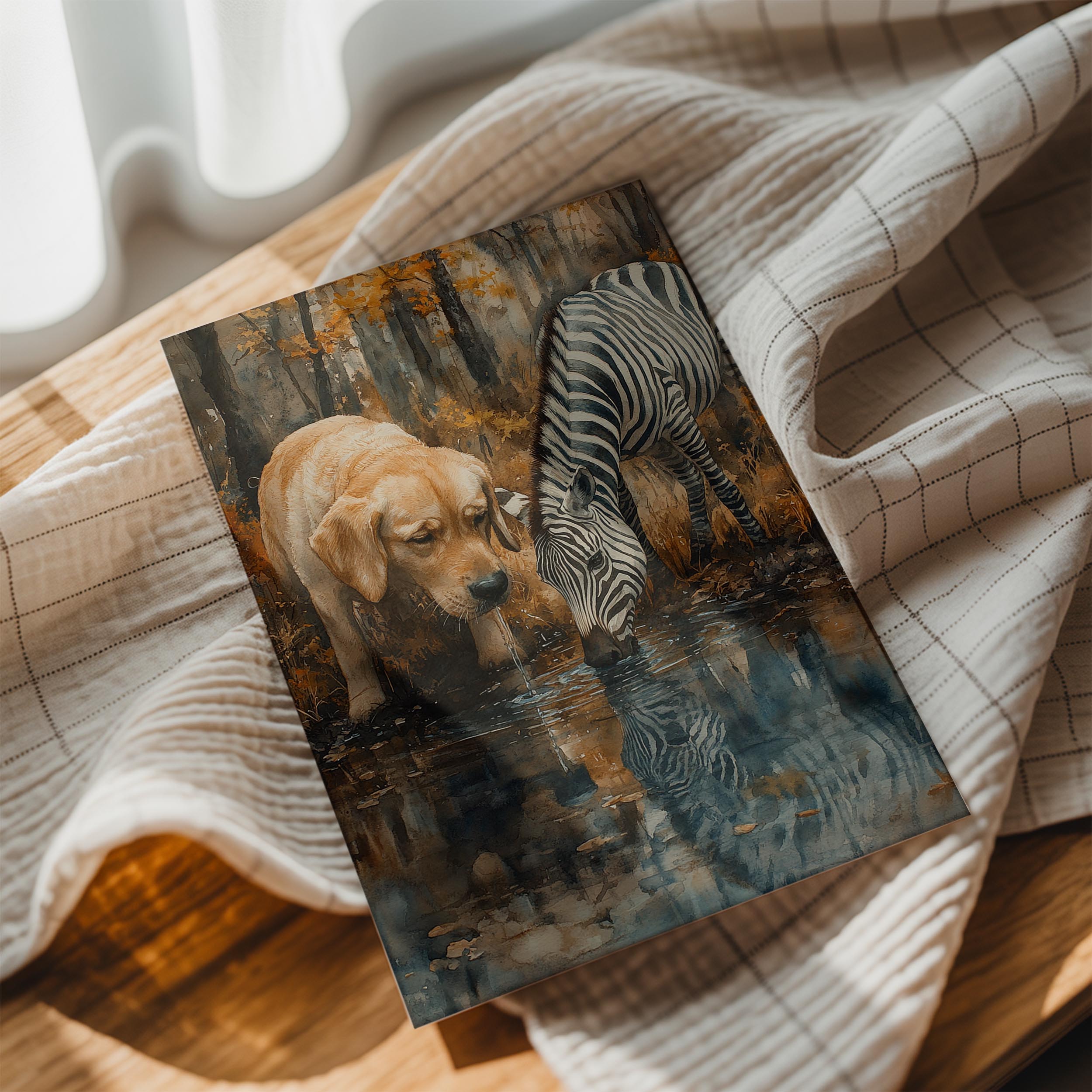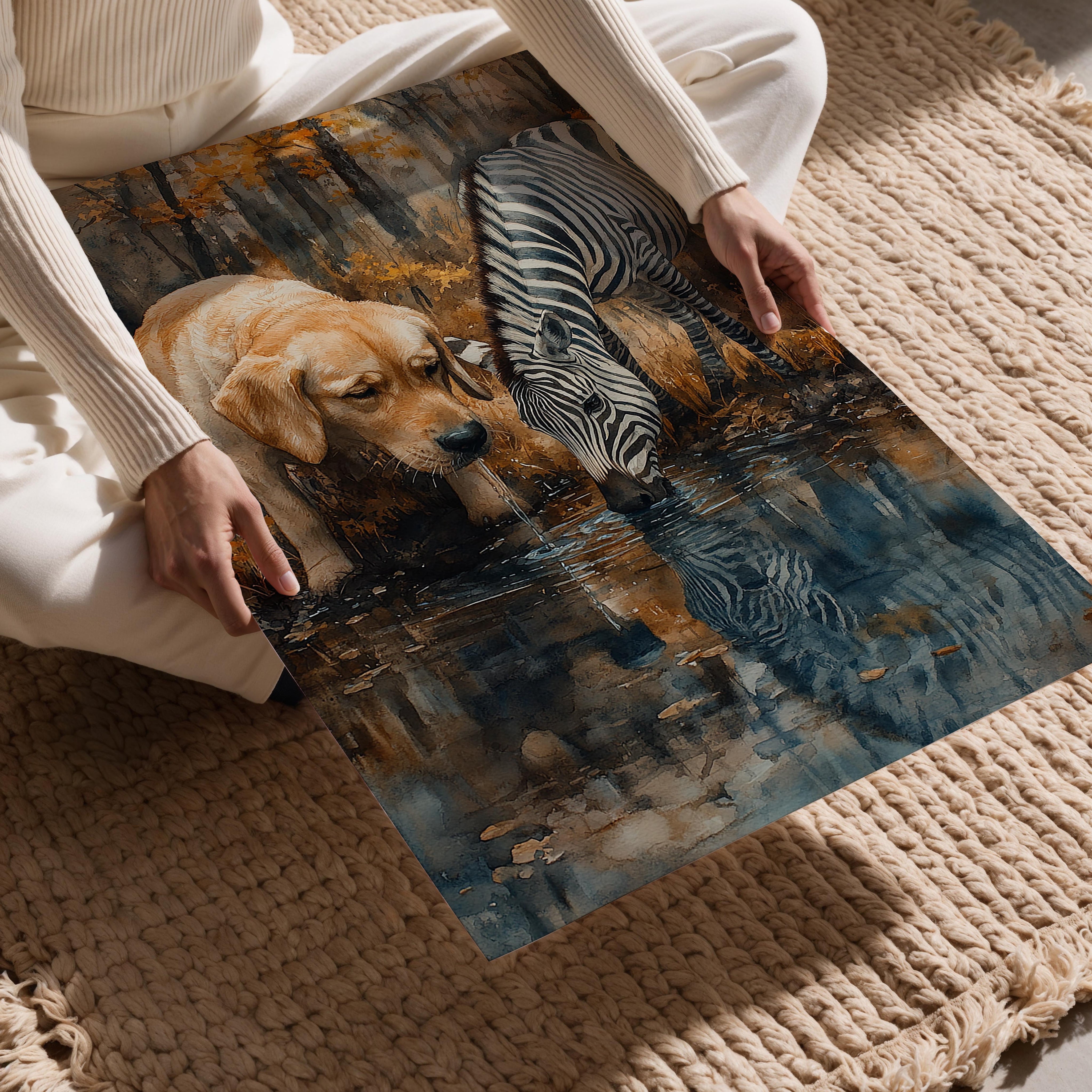 This heartwarming painting showcases an unlikely friendship between a Labrador retriever and a zebra as they drink side by side at a forest pond. The autumnal hues and detailed reflections create a soothing, harmonious atmosphere. Perfect for animal lovers, this piece symbolizes companionship, unity, and the beauty of coexistence.
