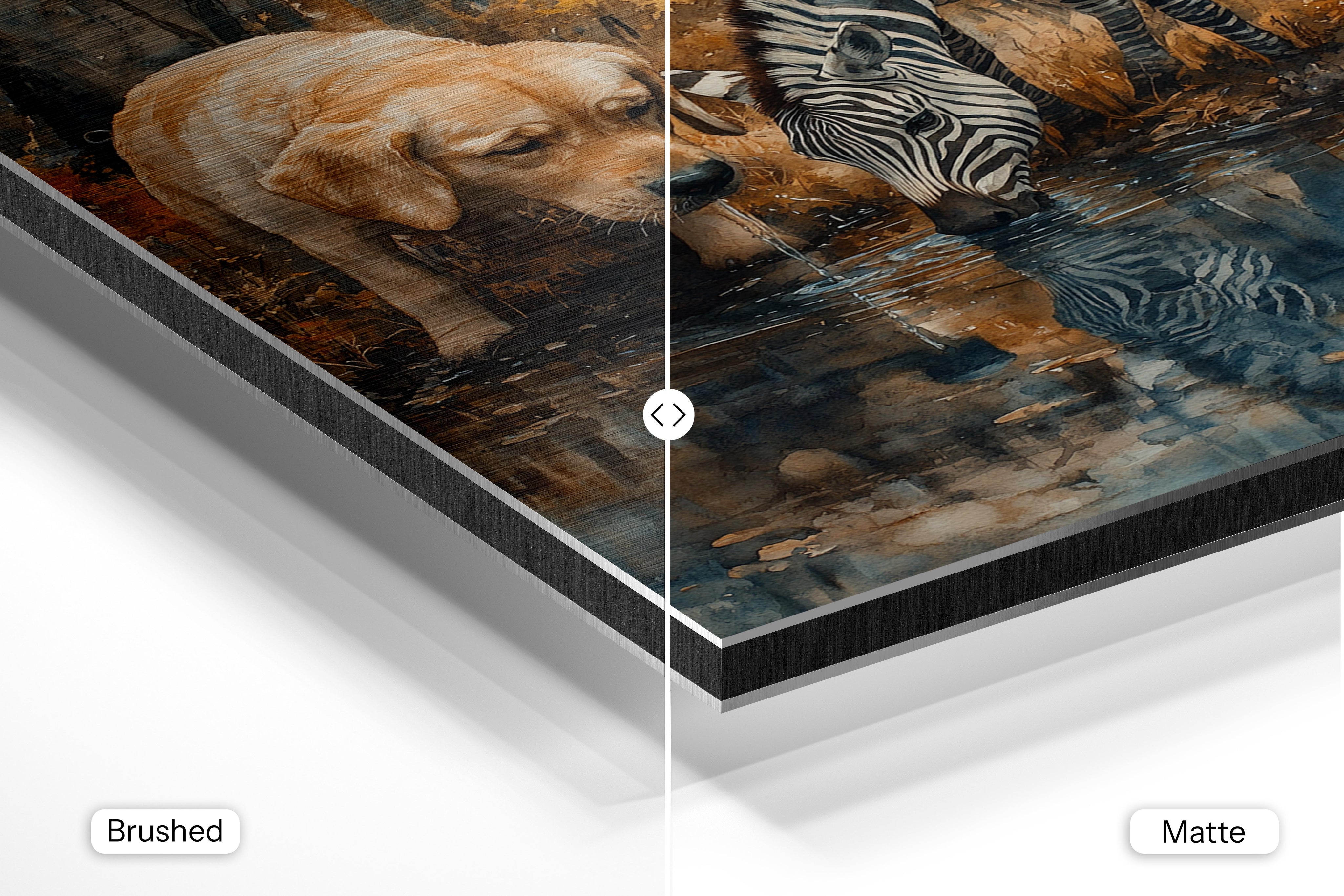 - Brushed Aluminum, on the other hand, features a raw metallic texture with visible brush strokes. Whites and highlights in your image let the silver surface show through, adding a dramatic, shimmering effect. Ideal for black-and-white images, minimalist designs, or abstract art, it creates a bold, industrial vibe with a modern edge.