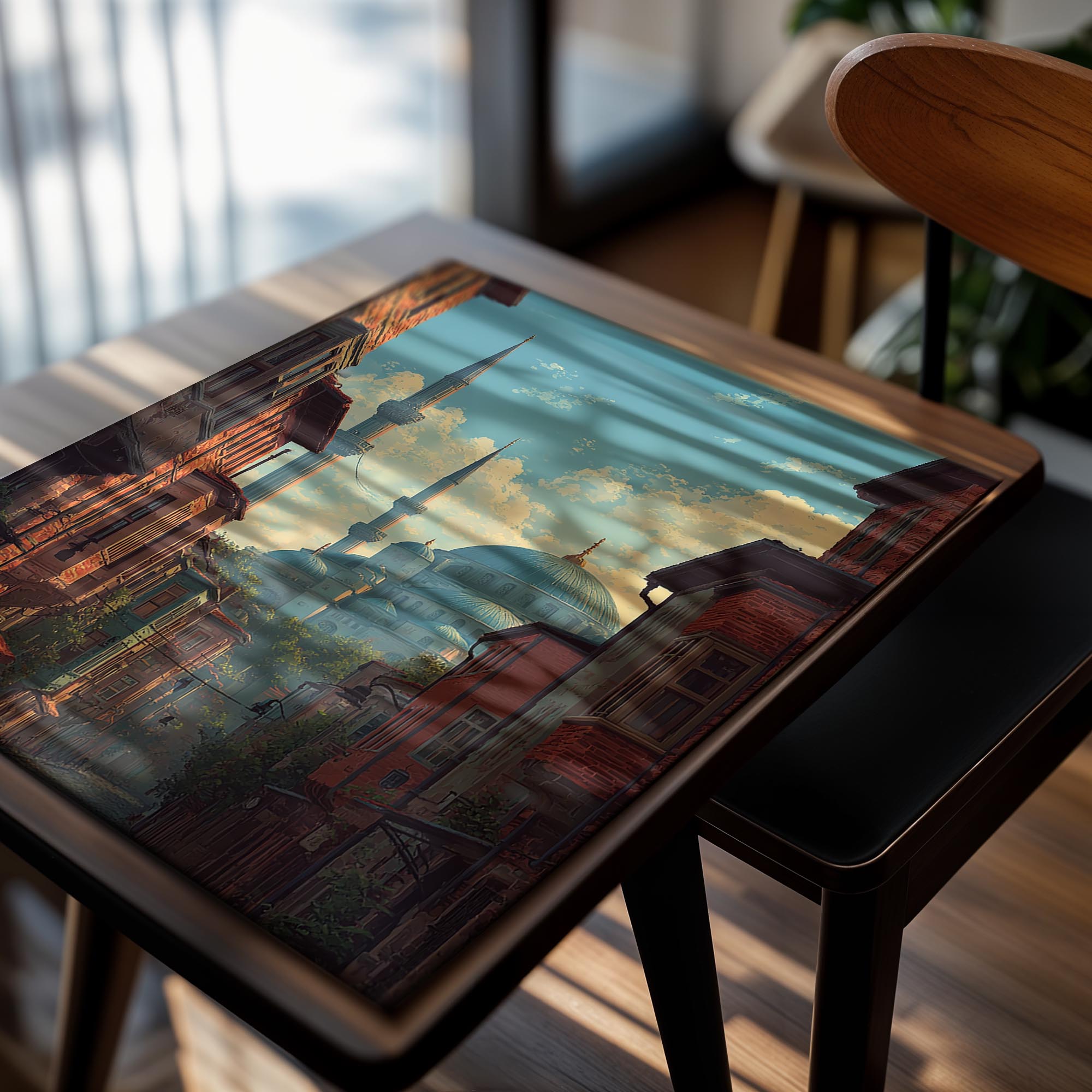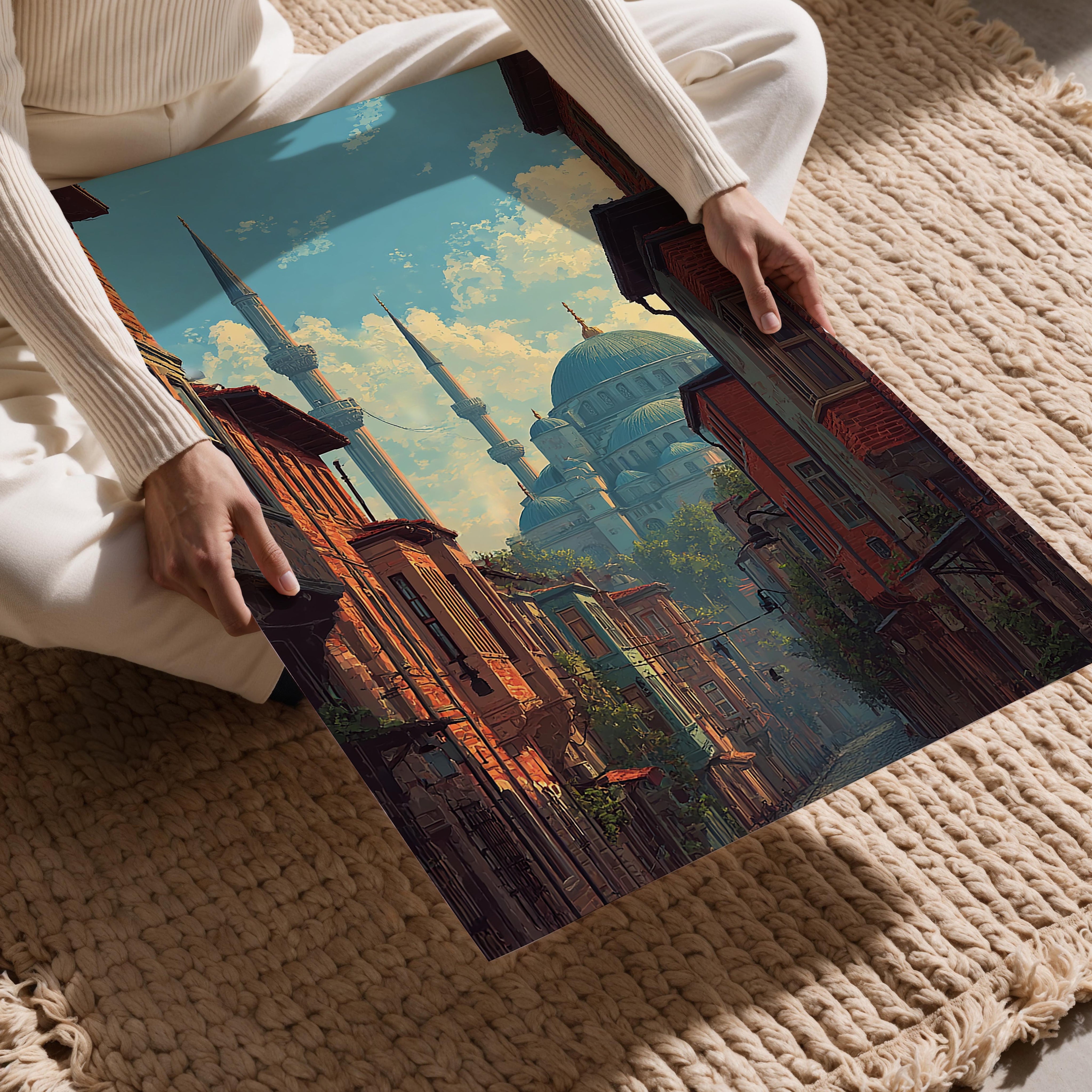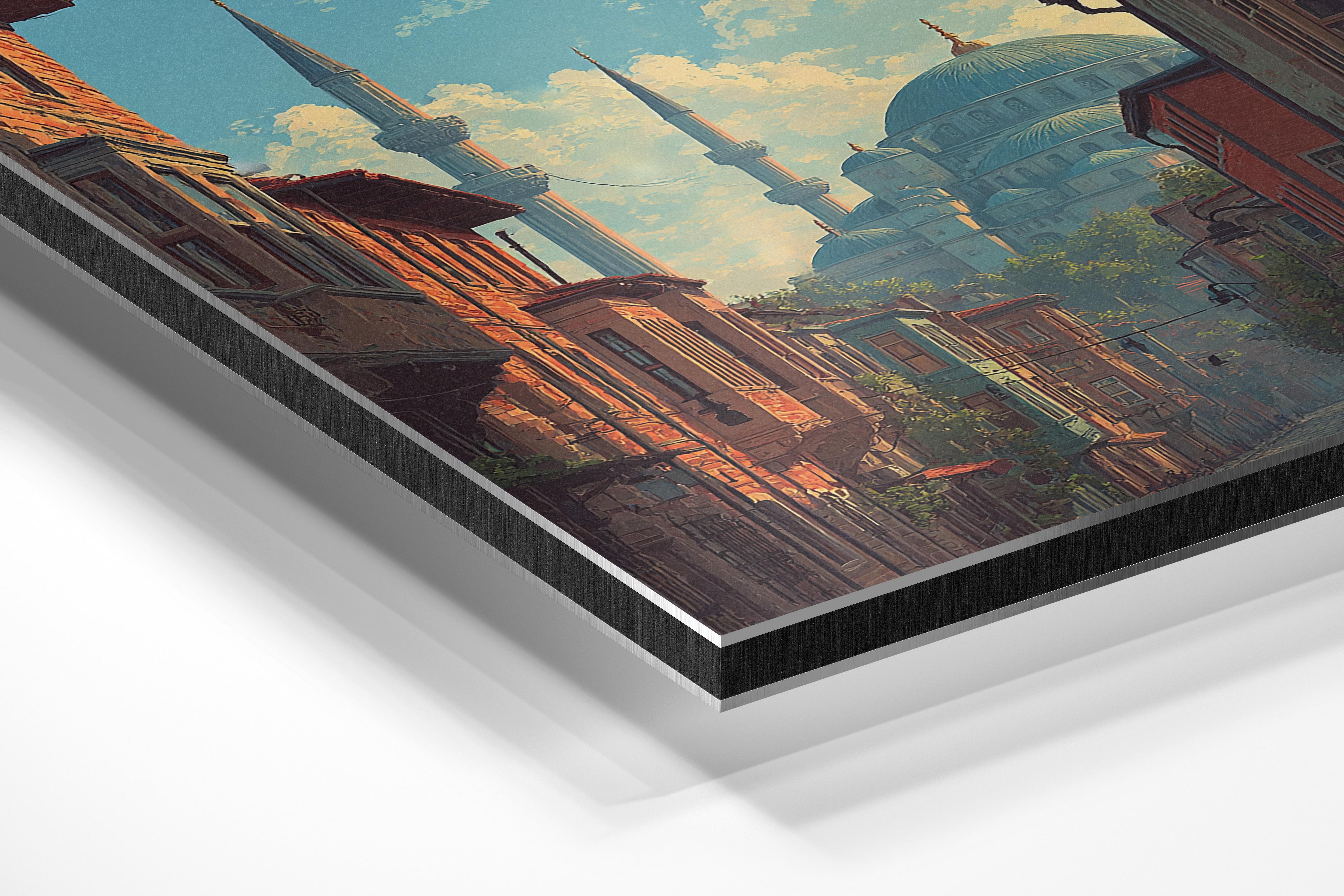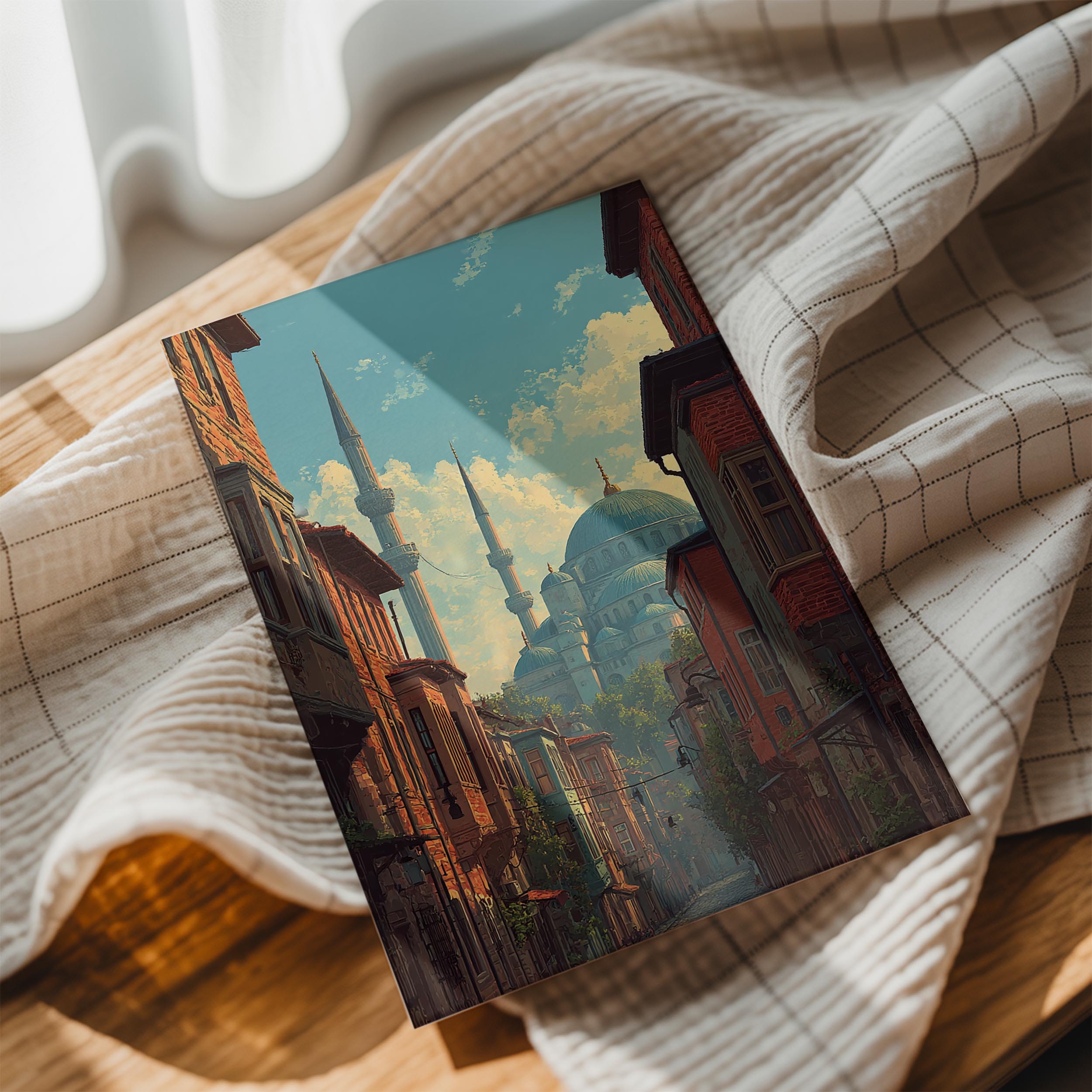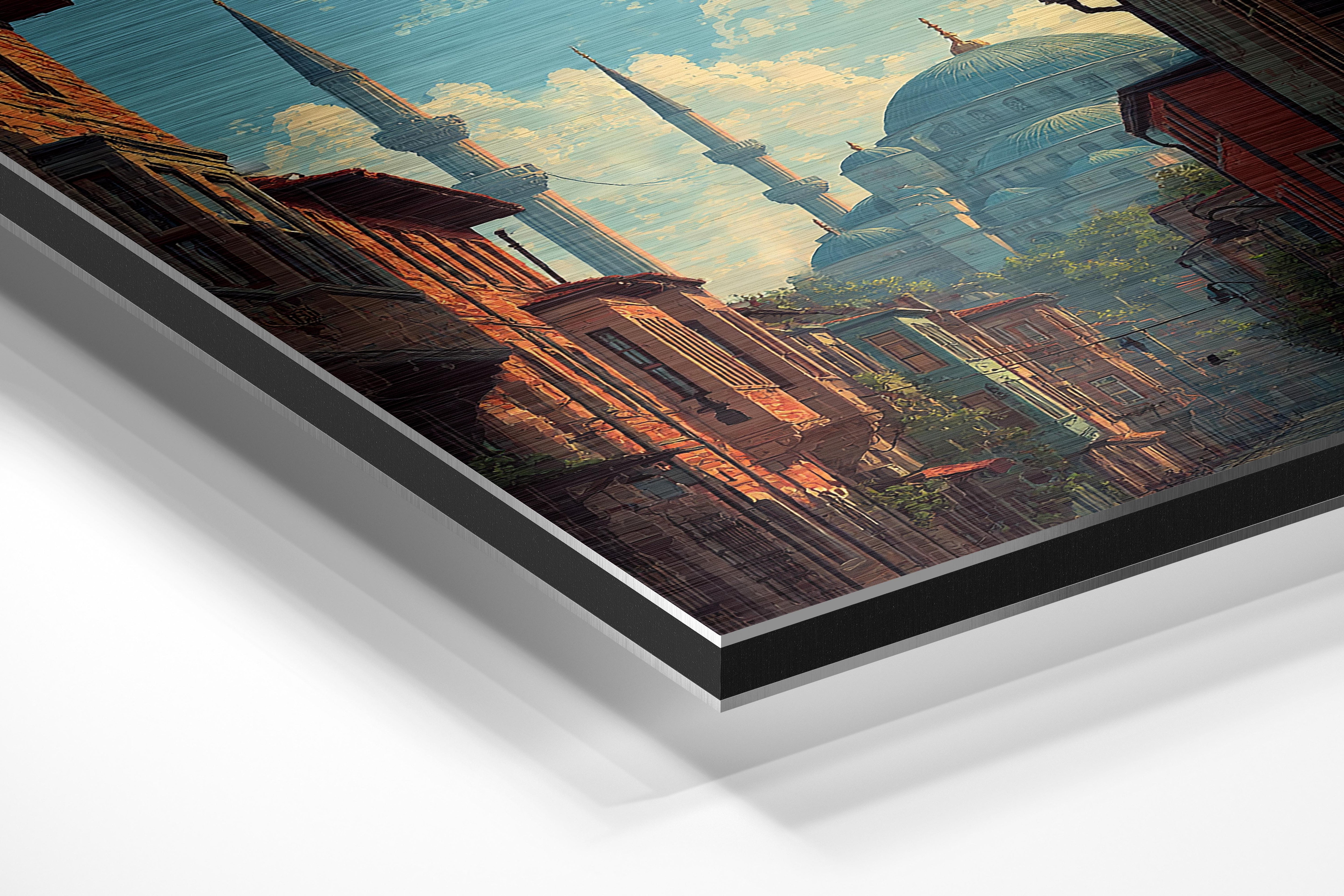 Framed between two redbrick buildings, a stunning mosque with cascading domes and slender minarets rises into the sky. The architecture glows in golden morning light, while birds fly overhead. This evocative image captures cultural heritage and architectural splendor. Ideal for travel-inspired rooms, spiritual spaces, or living rooms that celebrate worldly sophistication and wonder.