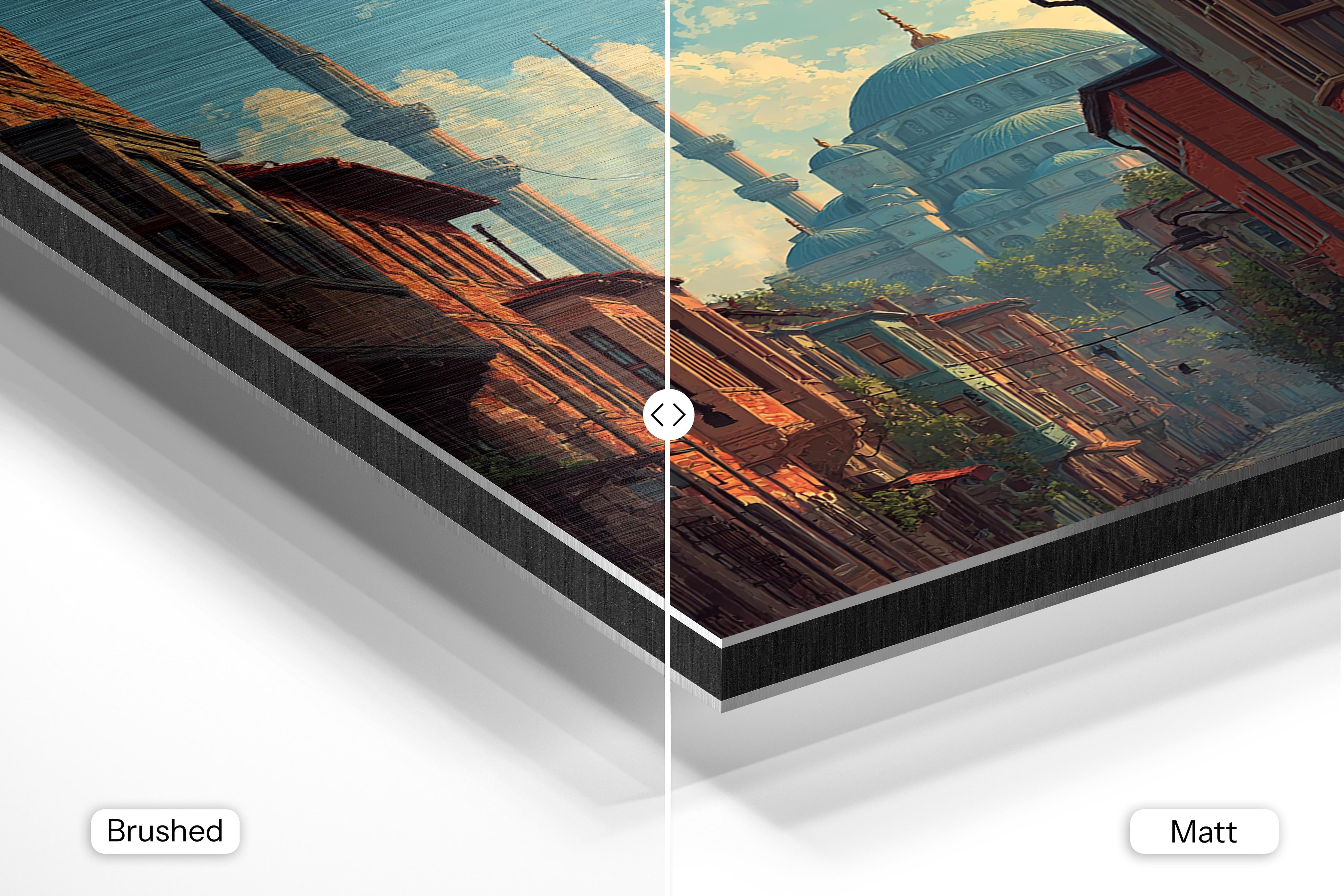 - Matte Aluminum offers a smooth, bright white surface that delivers crisp details and vibrant, true-to-life colors. With its non-reflective finish and subtle silky sheen, it’s perfect for photography, portraits, and colorful artwork—bringing a clean, polished look to any interior.