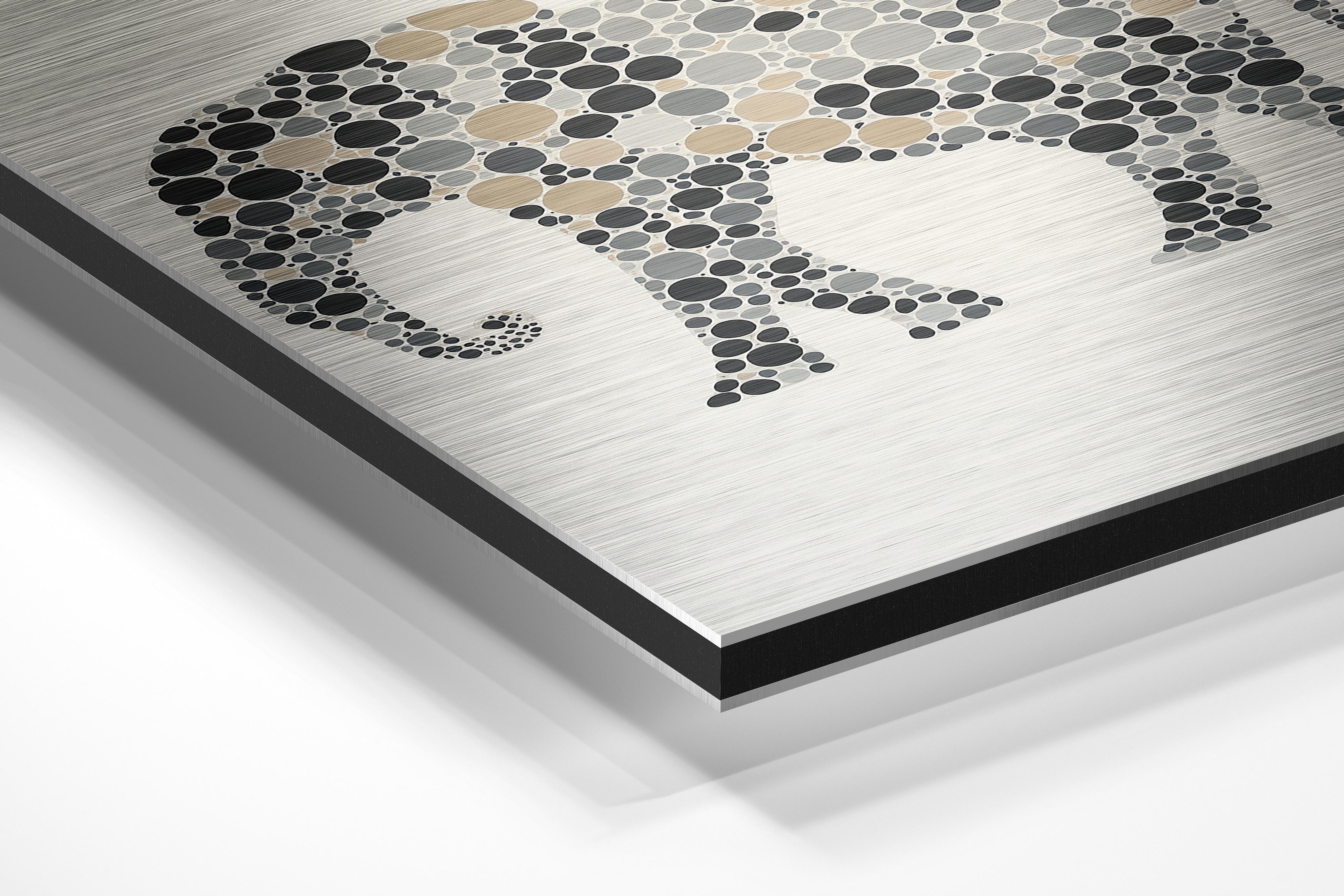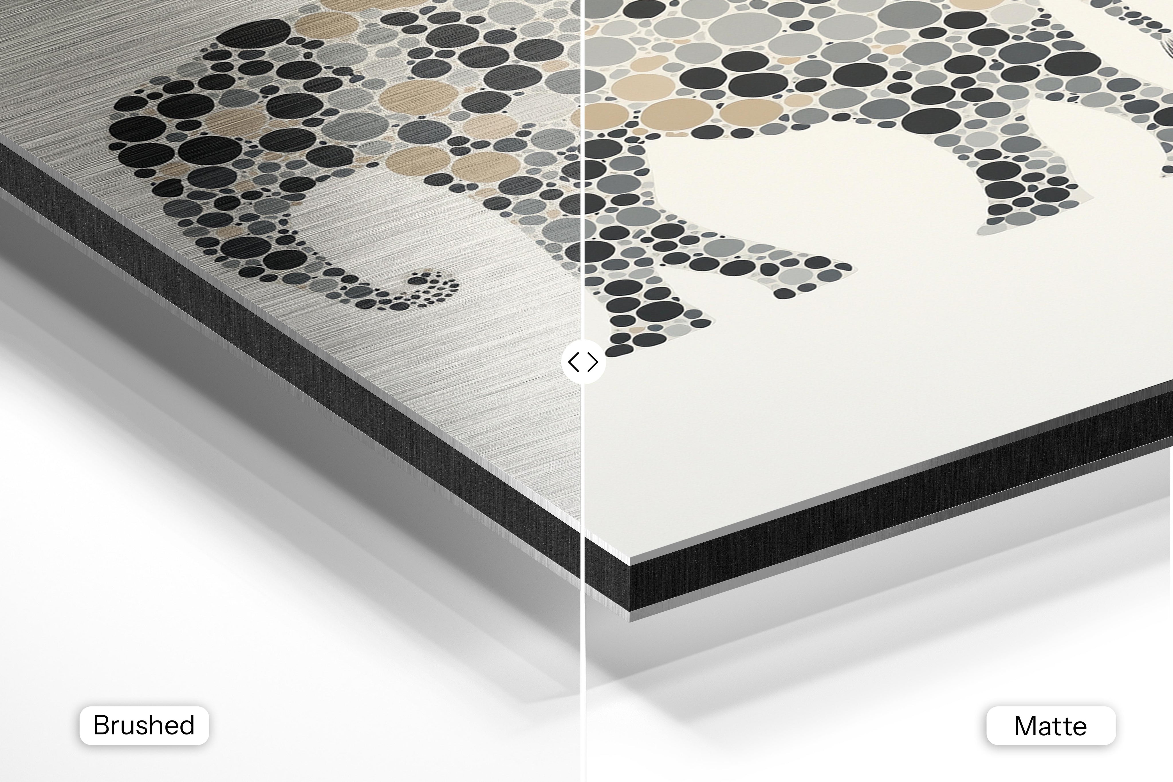 - Brushed Aluminum, on the other hand, features a raw metallic texture with visible brush strokes. Whites and highlights in your image let the silver surface show through, adding a dramatic, shimmering effect. Ideal for black-and-white images, minimalist designs, or abstract art, it creates a bold, industrial vibe with a modern edge.
