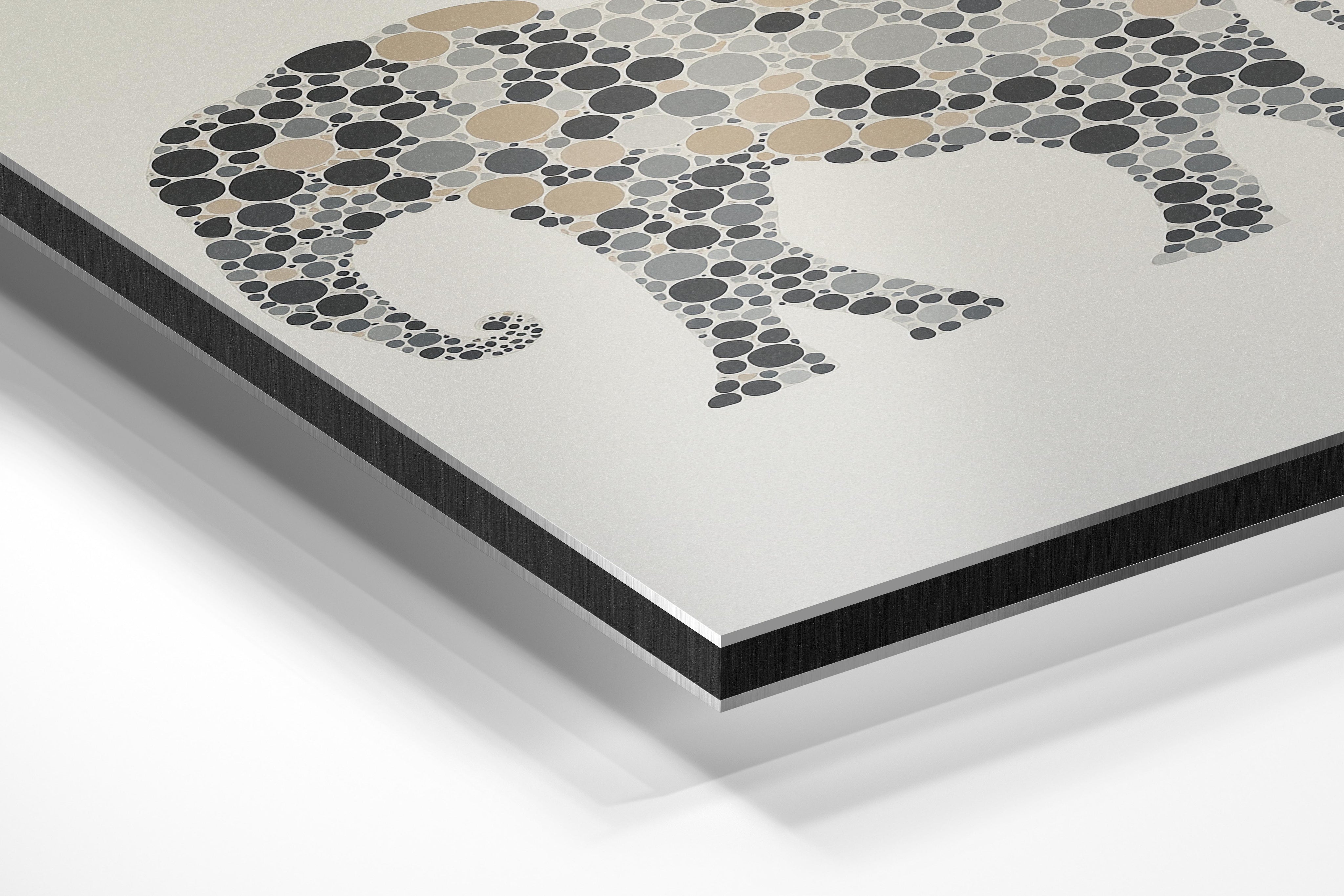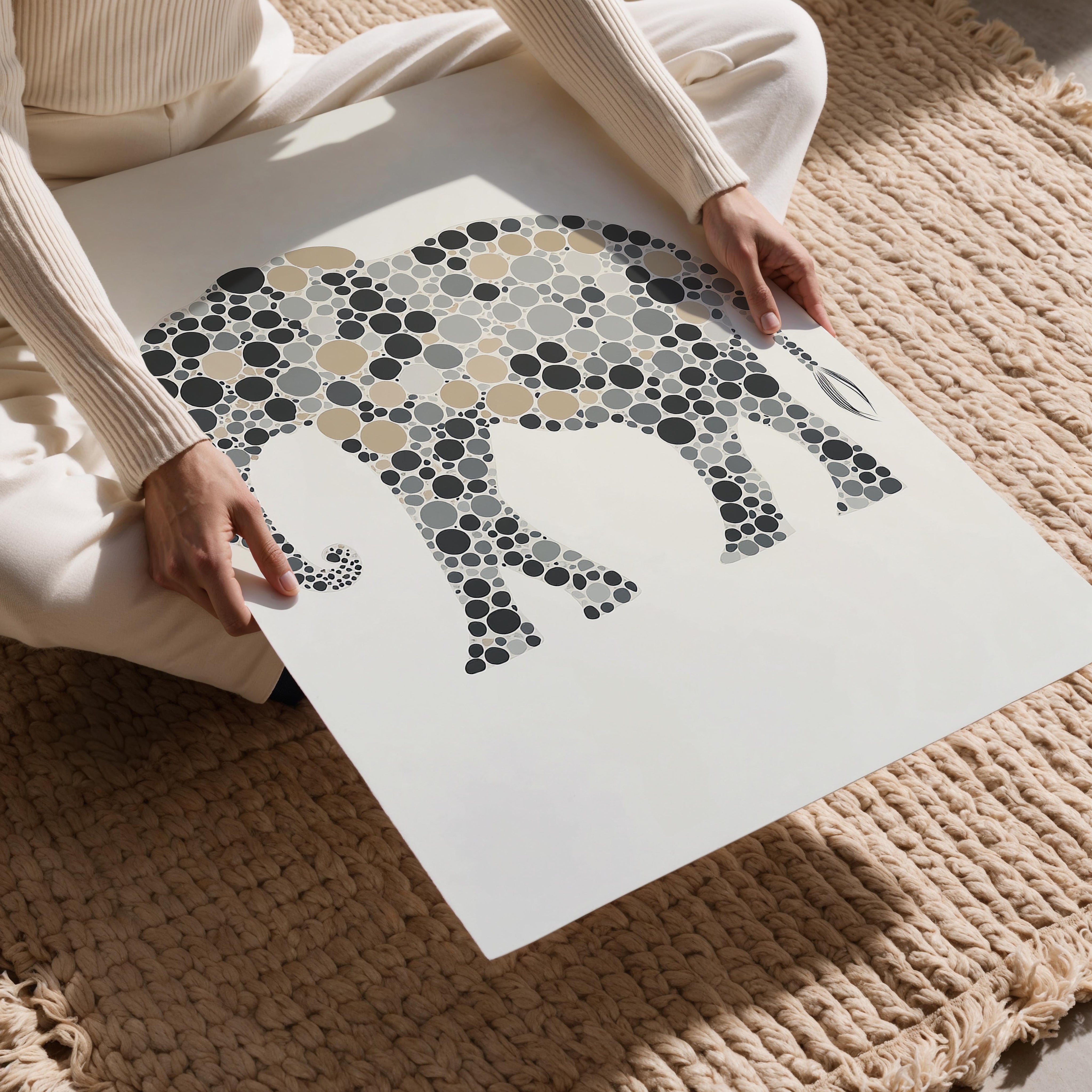 A unique and visually striking illustration of an elephant, composed entirely of varying-sized circles in neutral tones. The minimalistic and modern design makes it a great choice for contemporary spaces, while the creative dot arrangement adds an element of intrigue. This artwork would work well in offices, creative studios, or minimalist home interiors, serving as a conversation starter while maintaining an elegant aesthetic.