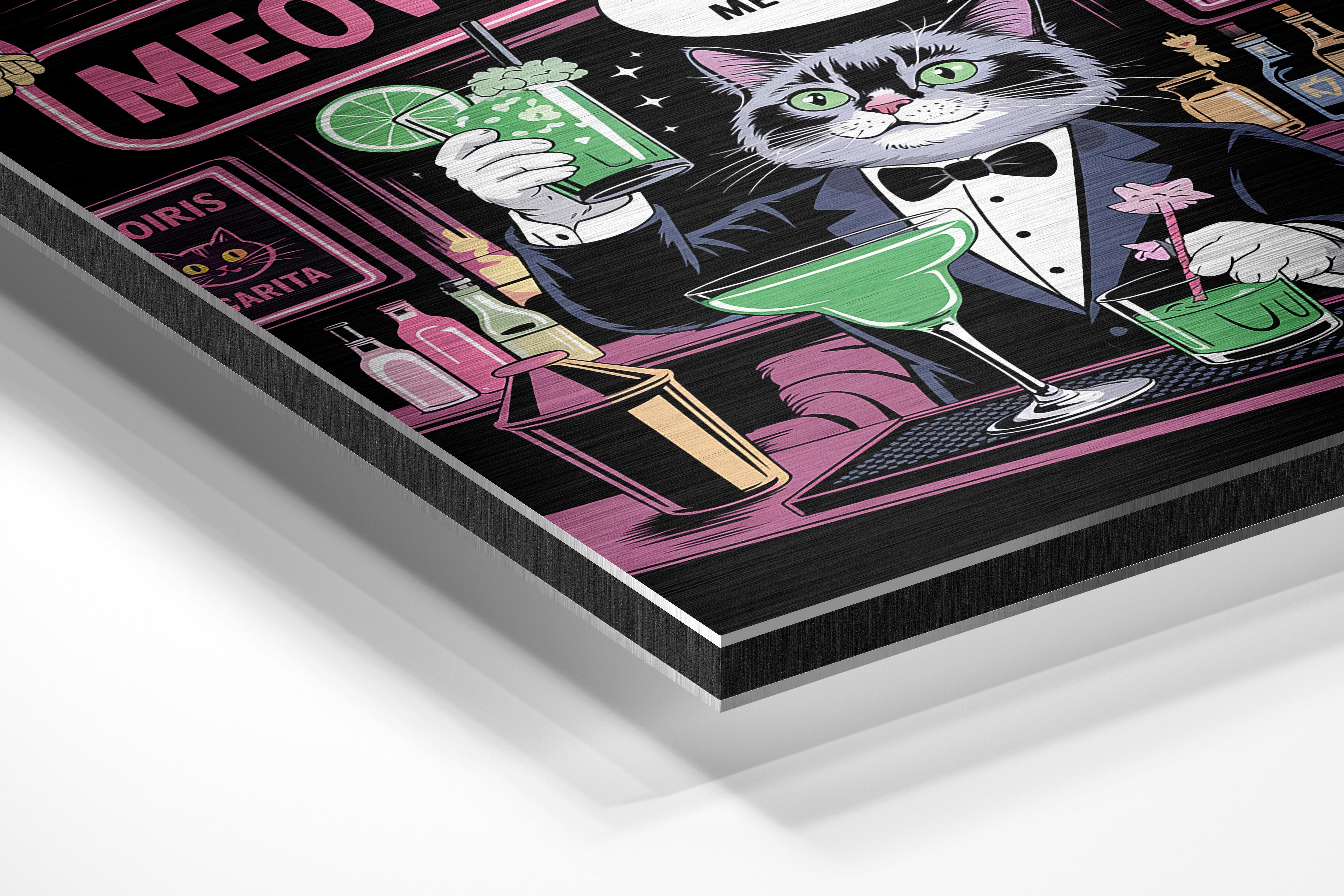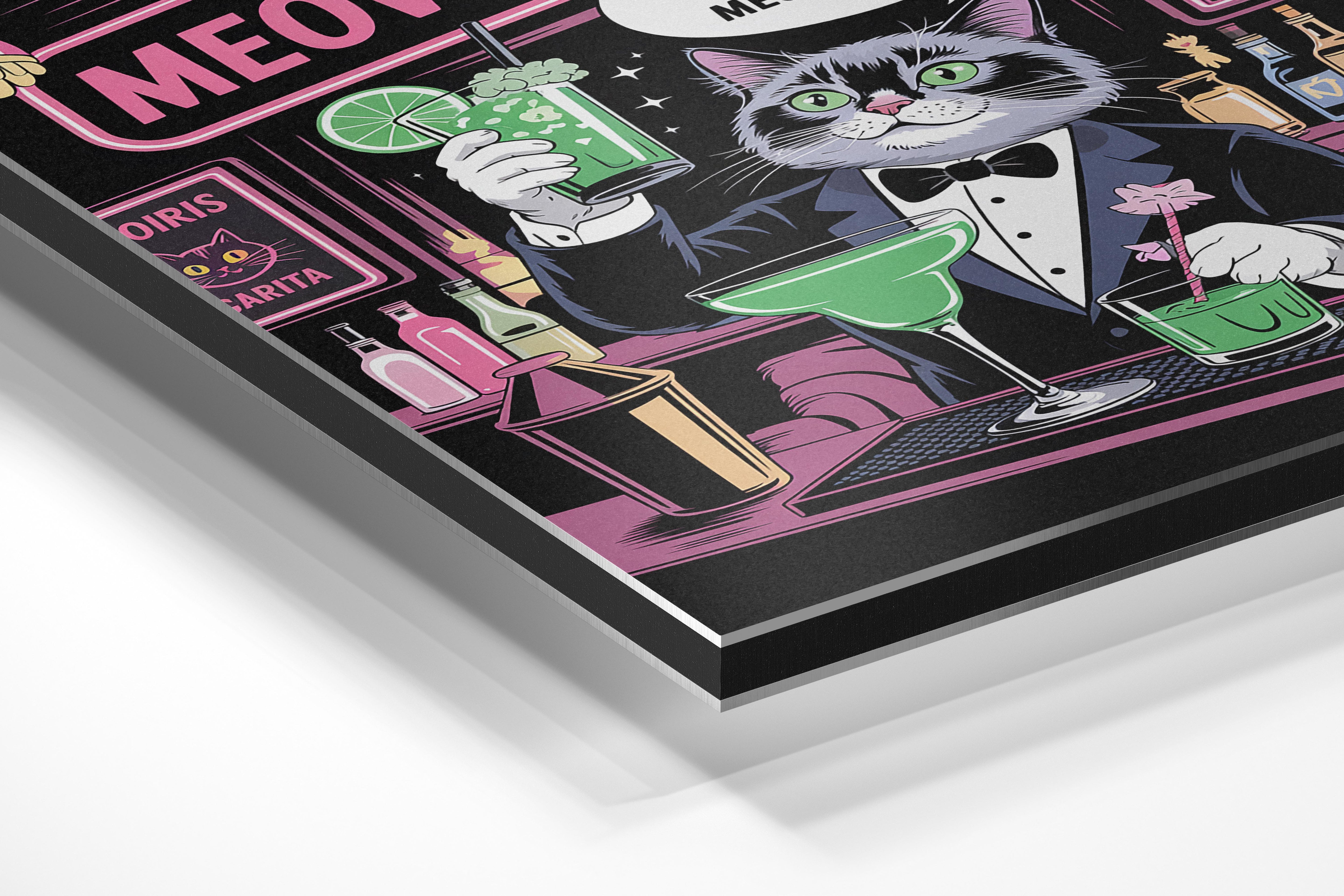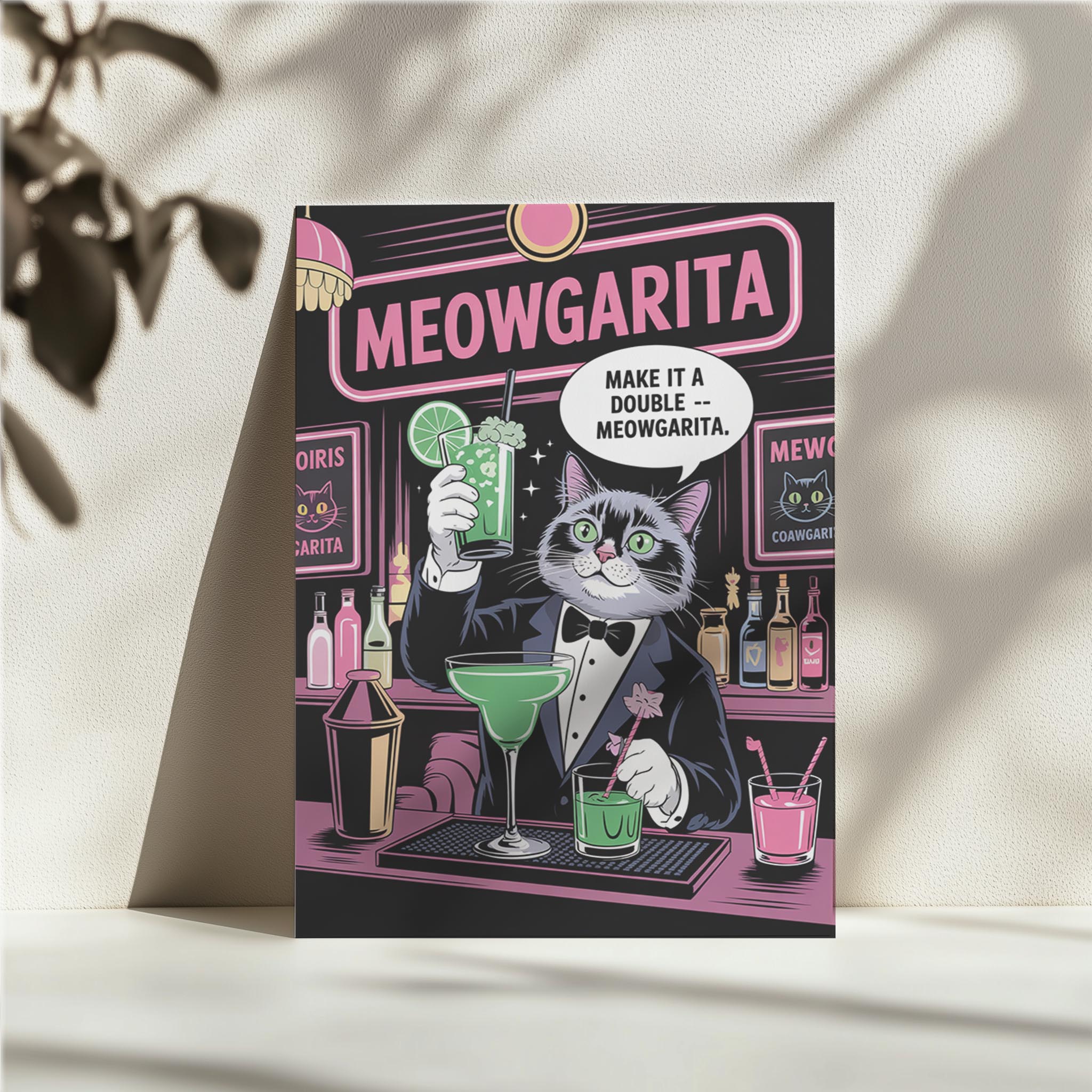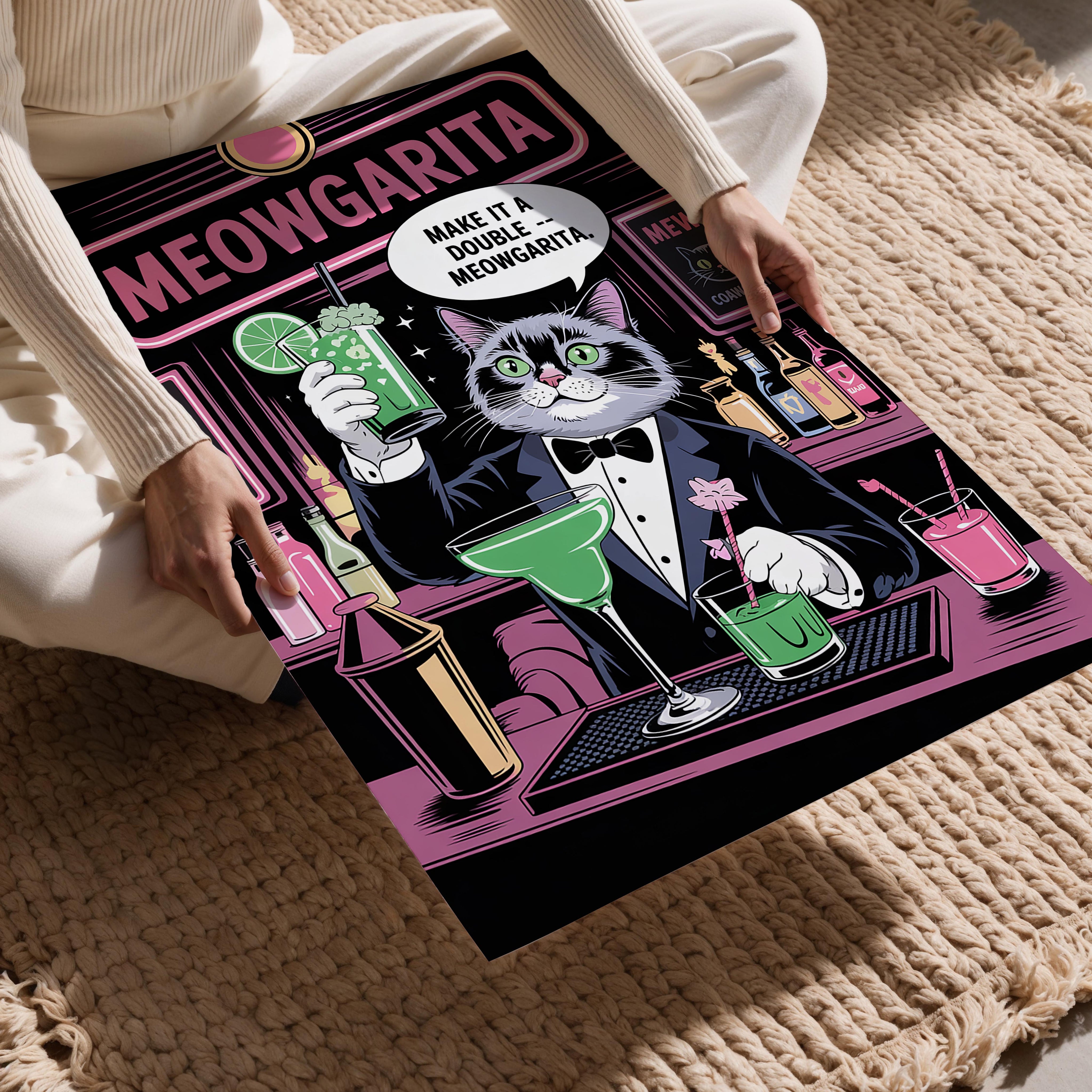 This whimsical bar scene stars a tuxedoed cat bartender confidently mixing drinks beneath a bold “MEOWGARITA” sign. Holding a green cocktail and surrounded by colorful bottles, the cat exclaims, “Make it a double — Meowgarita.” The scene is rich with nightlife fun and feline flair. With a perfect mix of humor, sophistication, and pop art flair, this piece is great for bars, kitchens, or cat-themed décor. It’s a fantastic conversation starter and mood lifter that blends puns with visual charm.