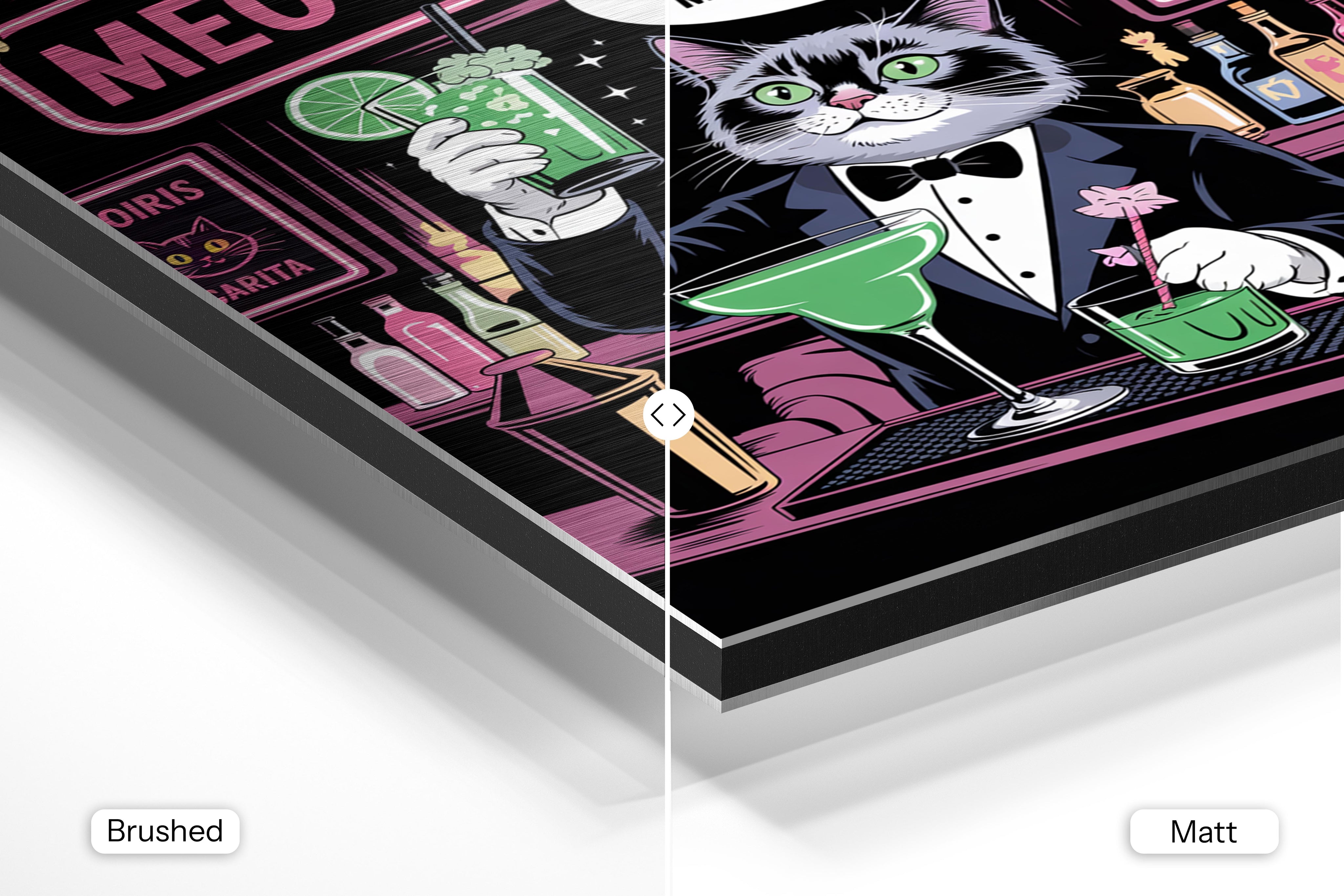 - Brushed Aluminum, on the other hand, features a raw metallic texture with visible brush strokes. Whites and highlights in your image let the silver surface show through, adding a dramatic, shimmering effect. Ideal for black-and-white images, minimalist designs, or abstract art, it creates a bold, industrial vibe with a modern edge.