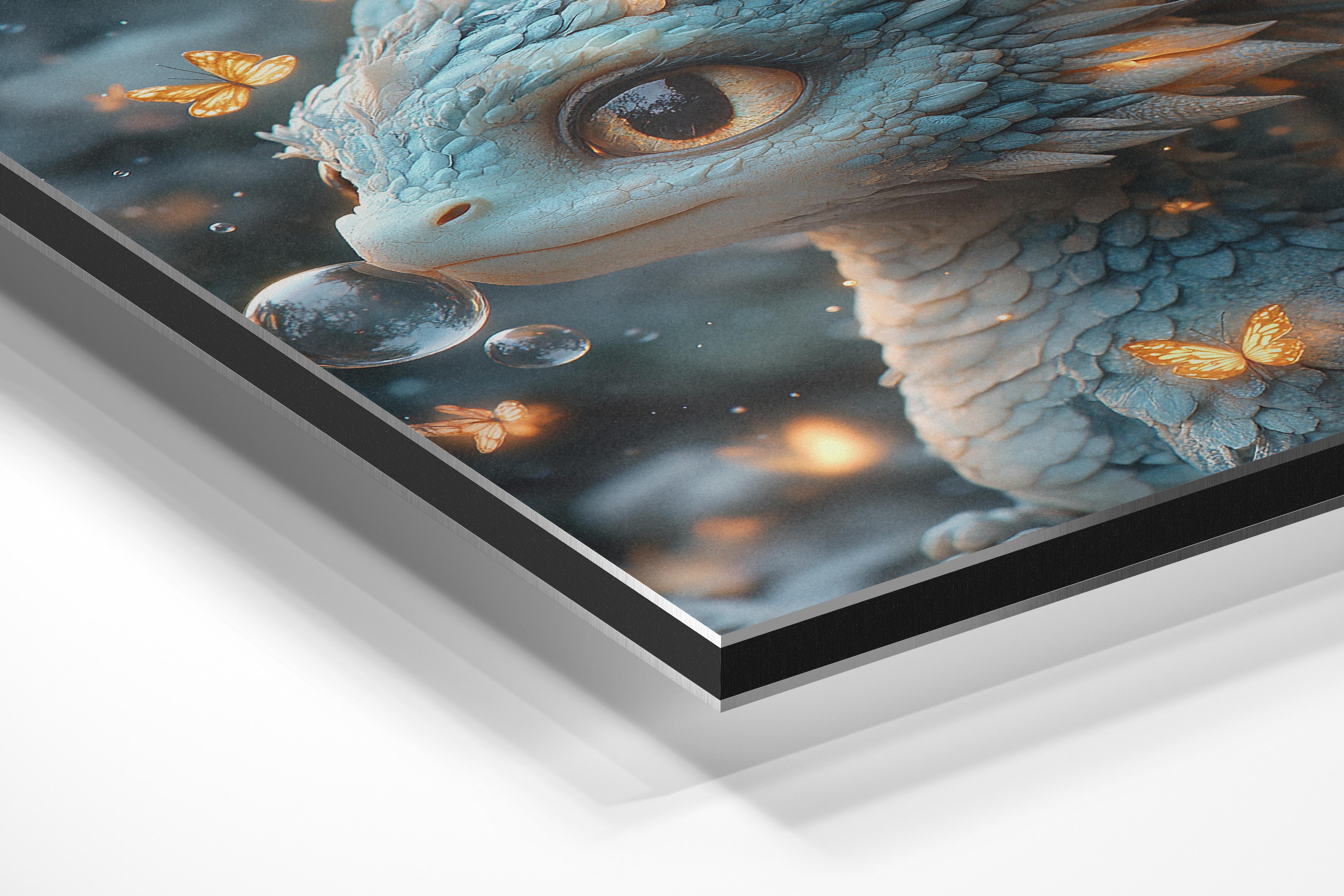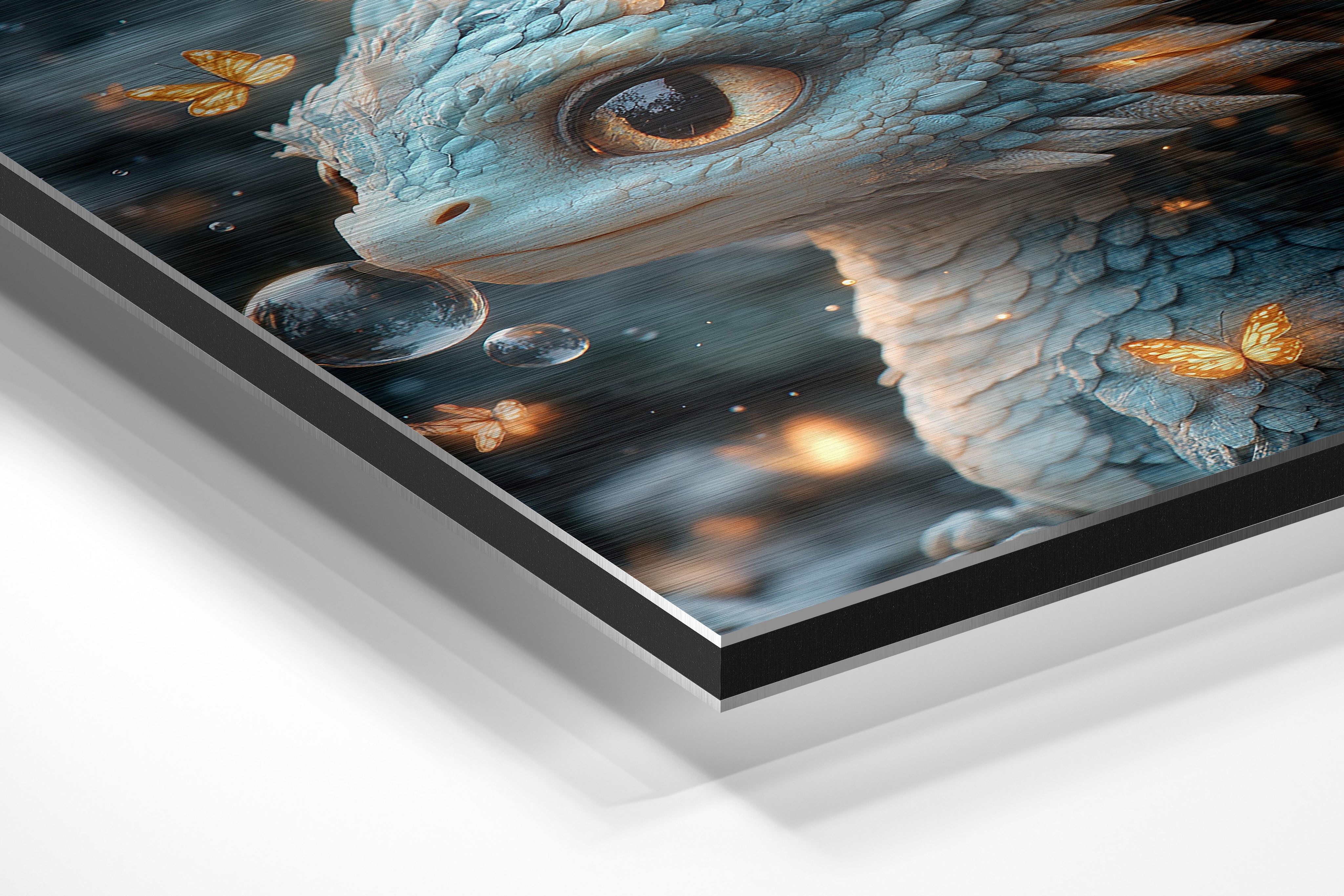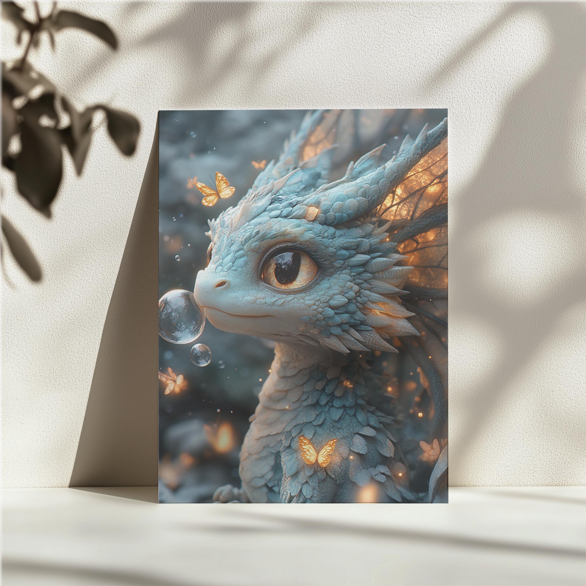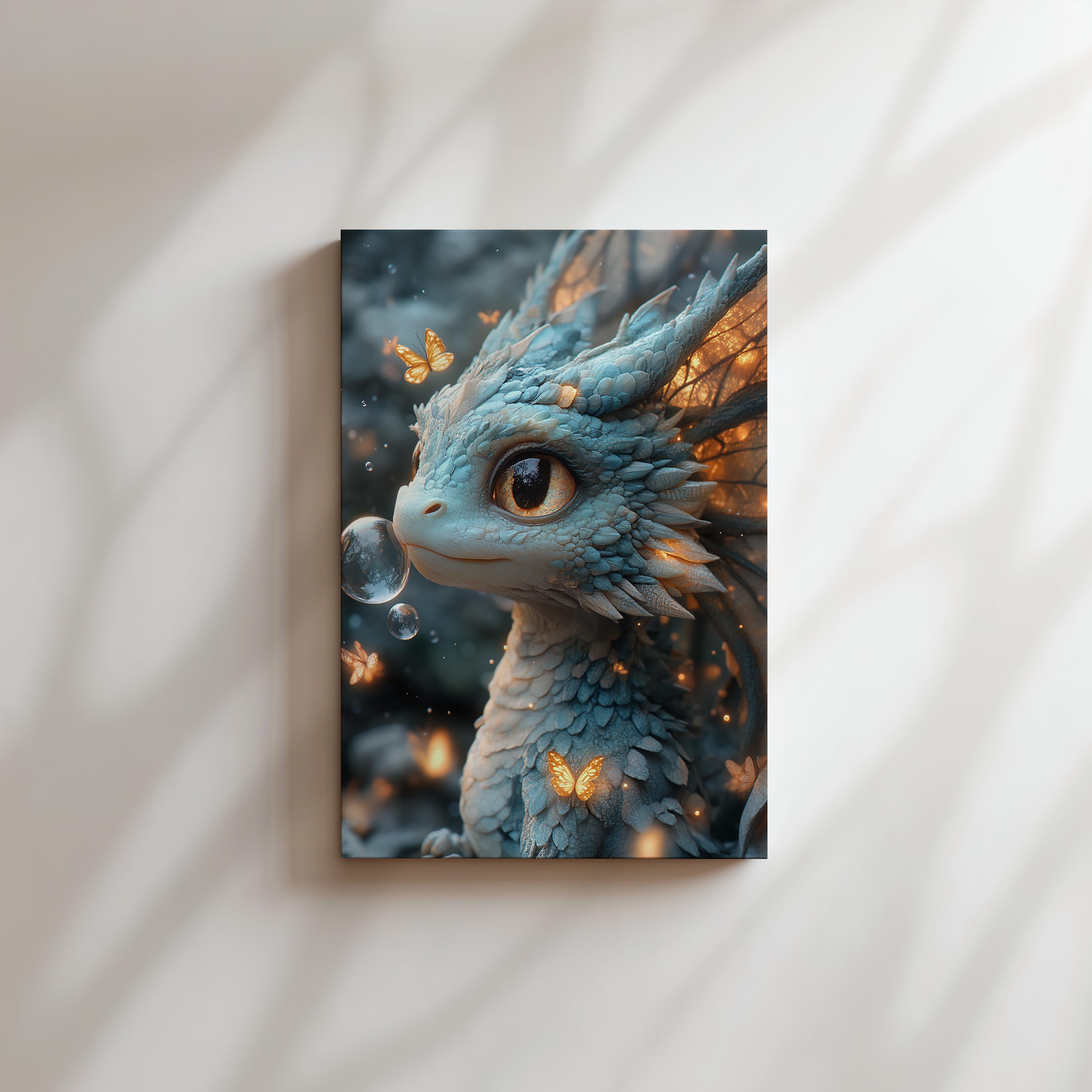 This magical piece features a baby dragon surrounded by glowing butterflies, each illuminated like tiny lanterns. The dragon’s scales shimmer in the light, creating an ethereal and majestic effect. The soft blues and golds of the palette harmonize beautifully, making this artwork feel otherworldly and enchanting. Ideal for fantasy enthusiasts or those looking to add a touch of whimsy and wonder to their decor, this piece is perfect for bedrooms, creative spaces, or anyone who loves magical creatures.