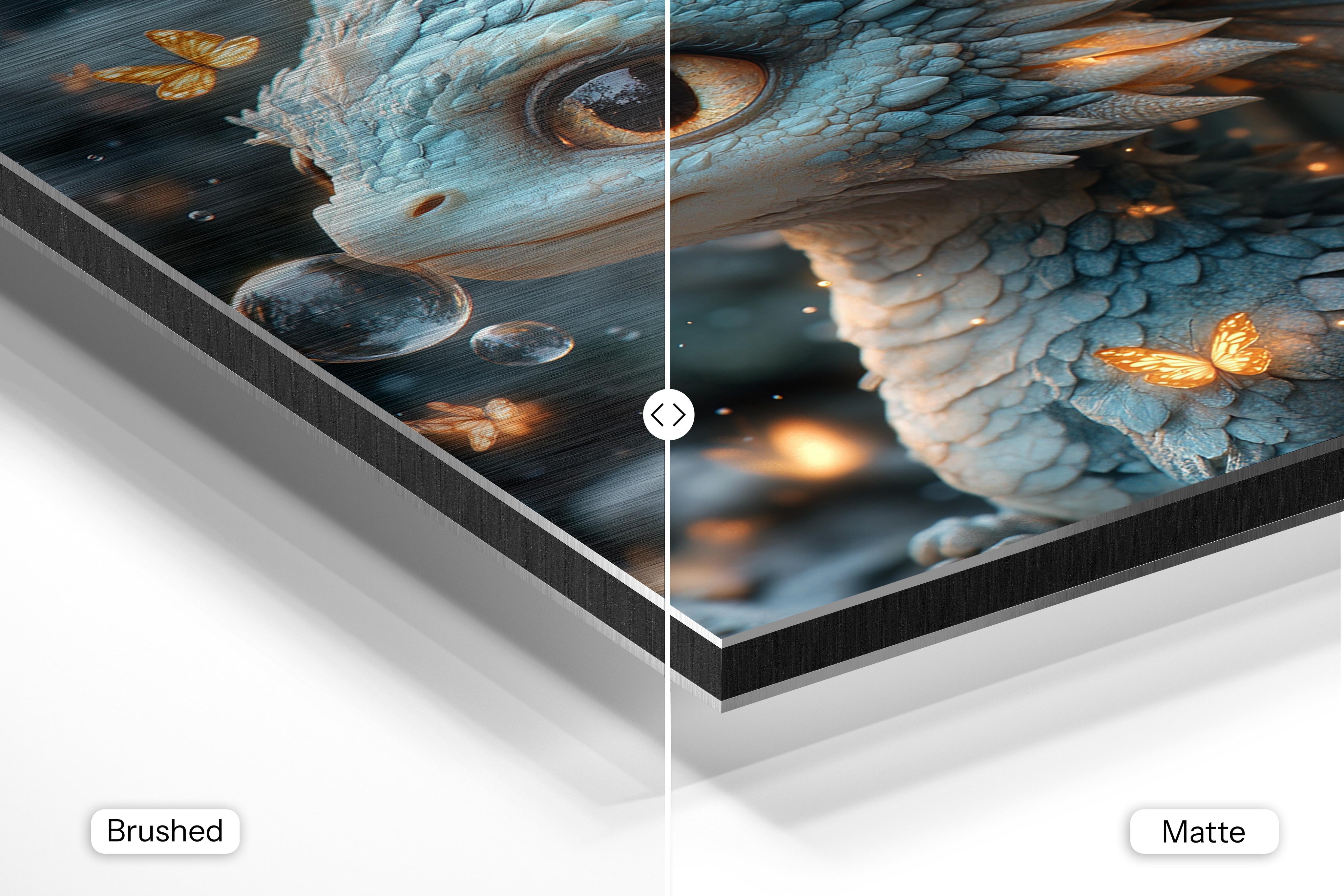 - Brushed Aluminum, on the other hand, features a raw metallic texture with visible brush strokes. Whites and highlights in your image let the silver surface show through, adding a dramatic, shimmering effect. Ideal for black-and-white images, minimalist designs, or abstract art, it creates a bold, industrial vibe with a modern edge.