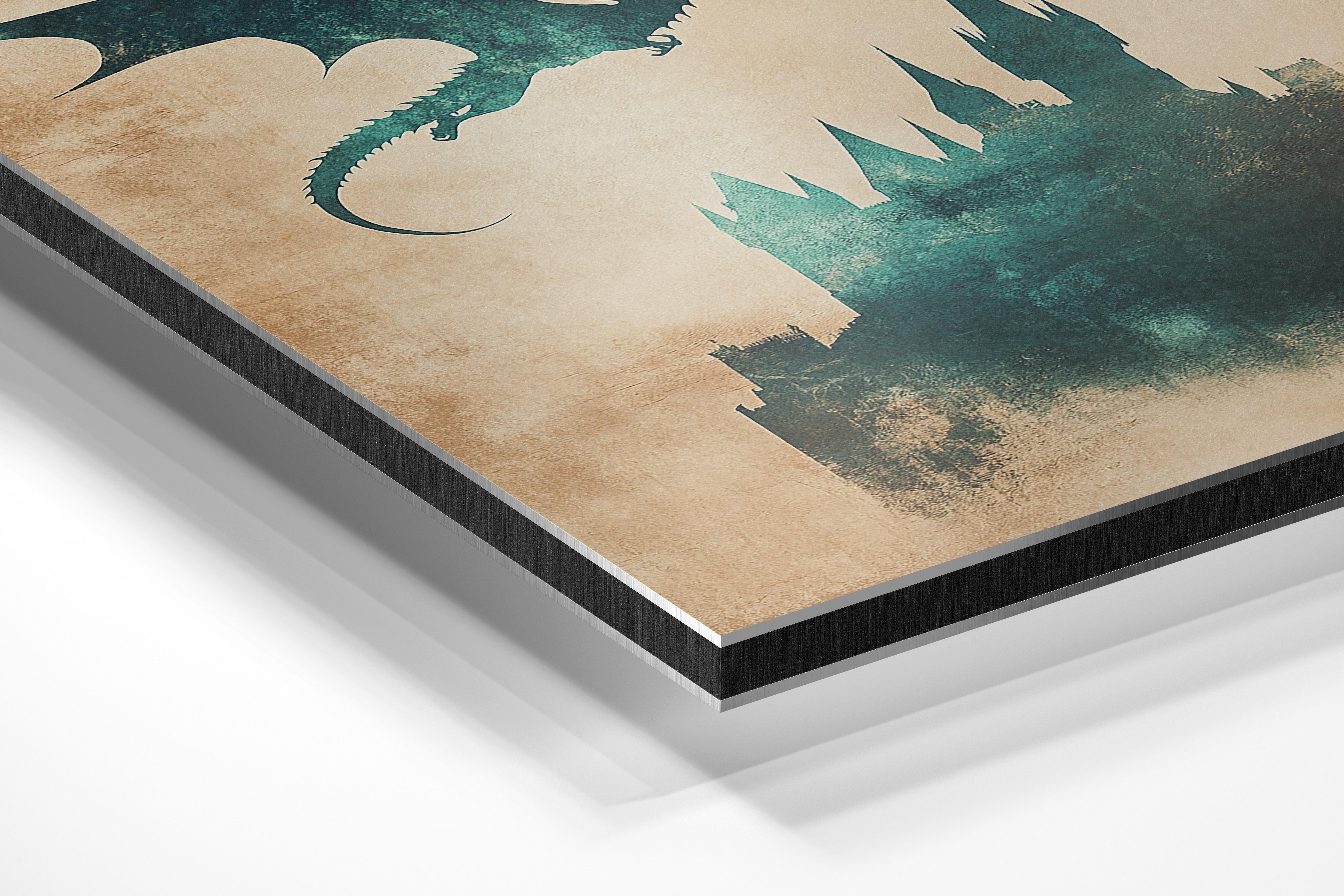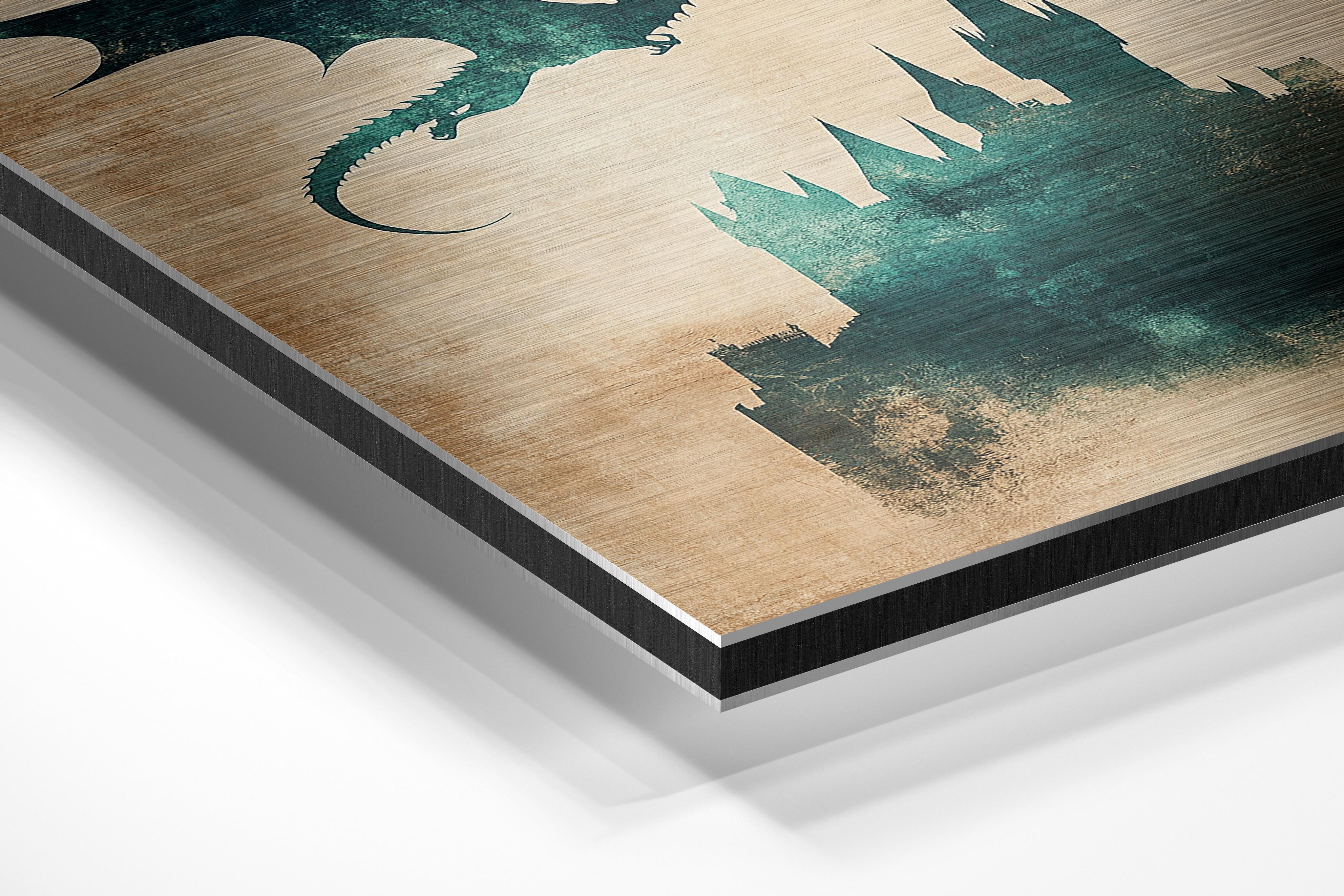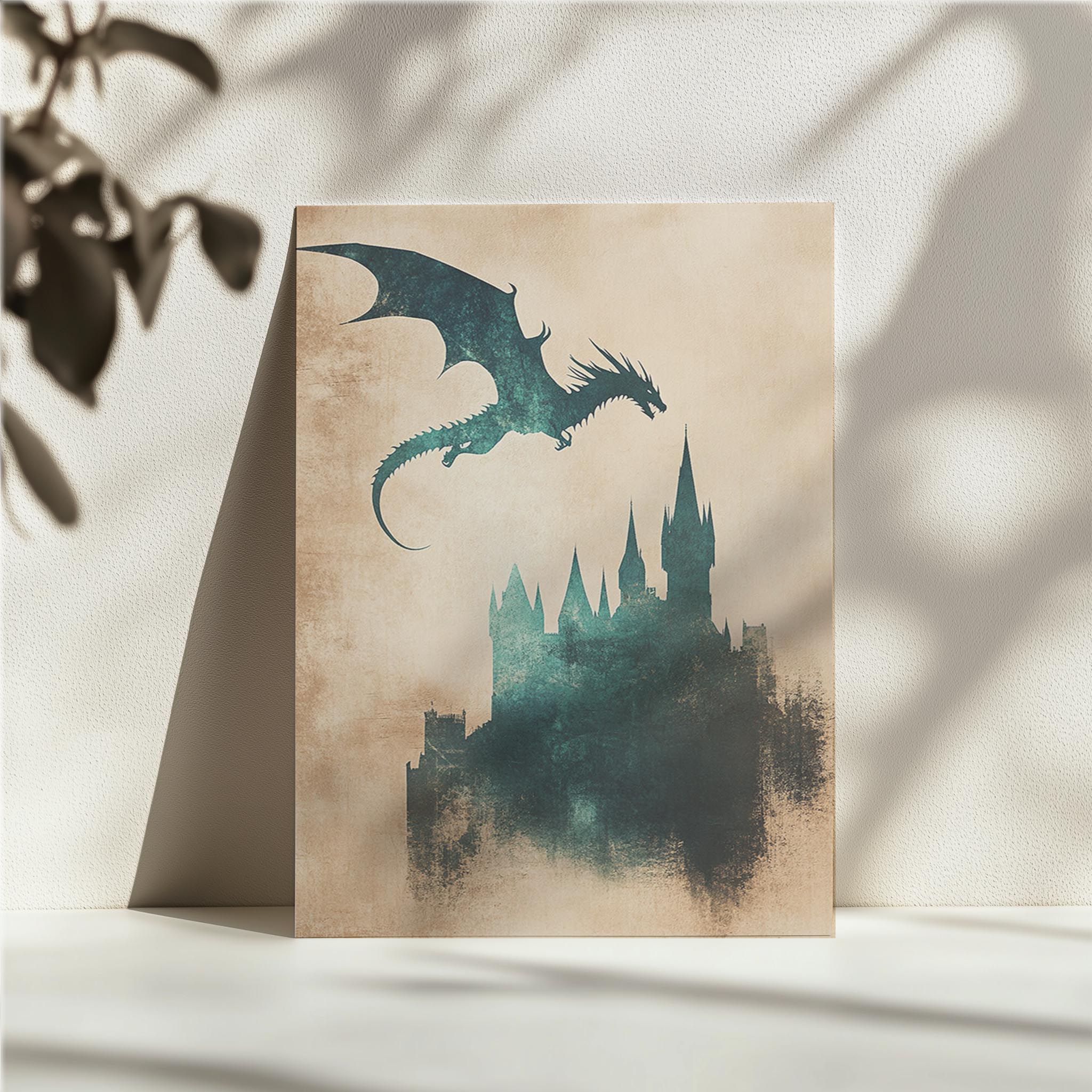 A minimalist depiction of a dragon silhouetted against a mystical castle backdrop. The use of subtle textures and soft colors evokes a classic fairy-tale feel, making it perfect for children’s rooms, whimsical decor, or spaces where a sense of wonder is desired.