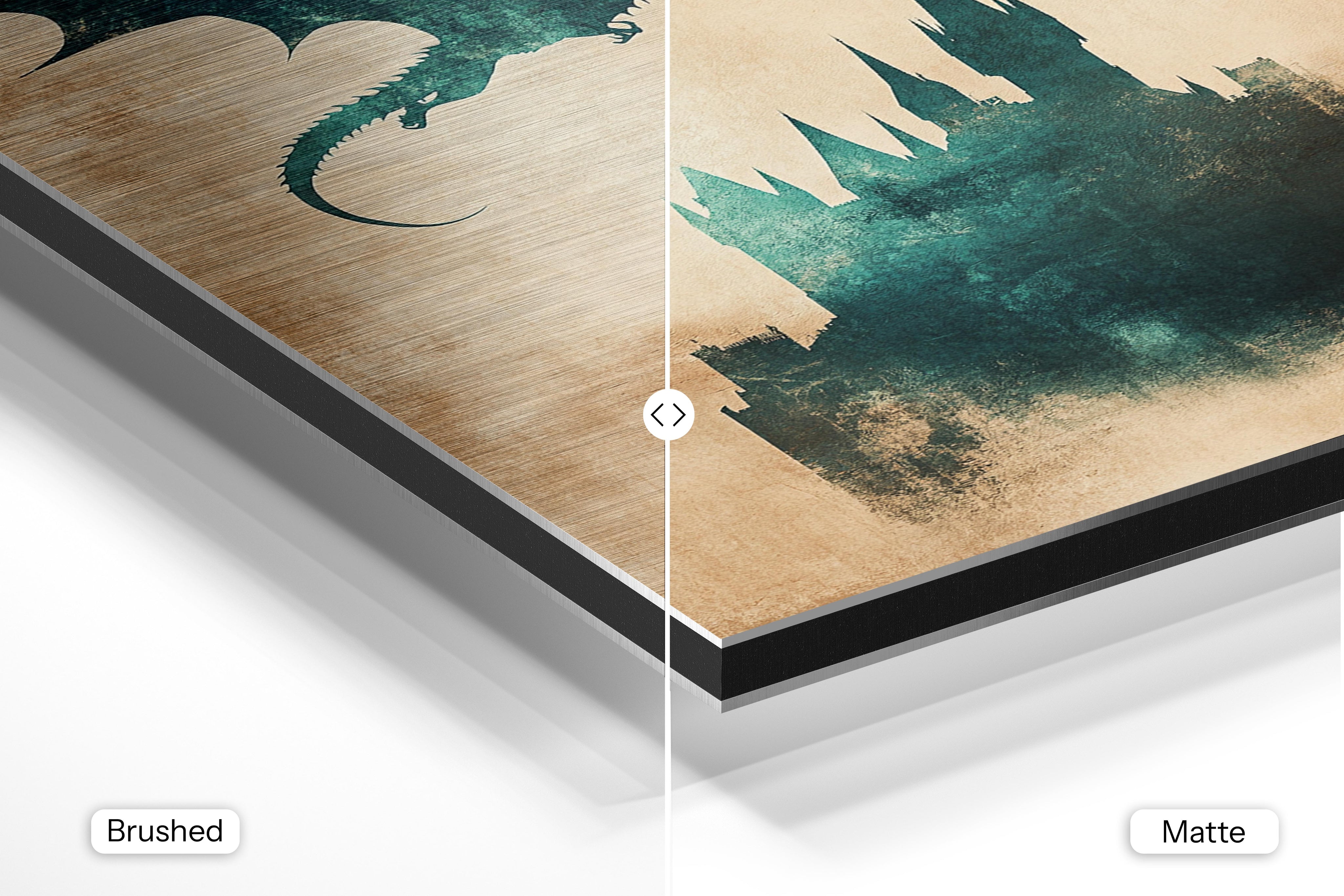 - Brushed Aluminum, on the other hand, features a raw metallic texture with visible brush strokes. Whites and highlights in your image let the silver surface show through, adding a dramatic, shimmering effect. Ideal for black-and-white images, minimalist designs, or abstract art, it creates a bold, industrial vibe with a modern edge.