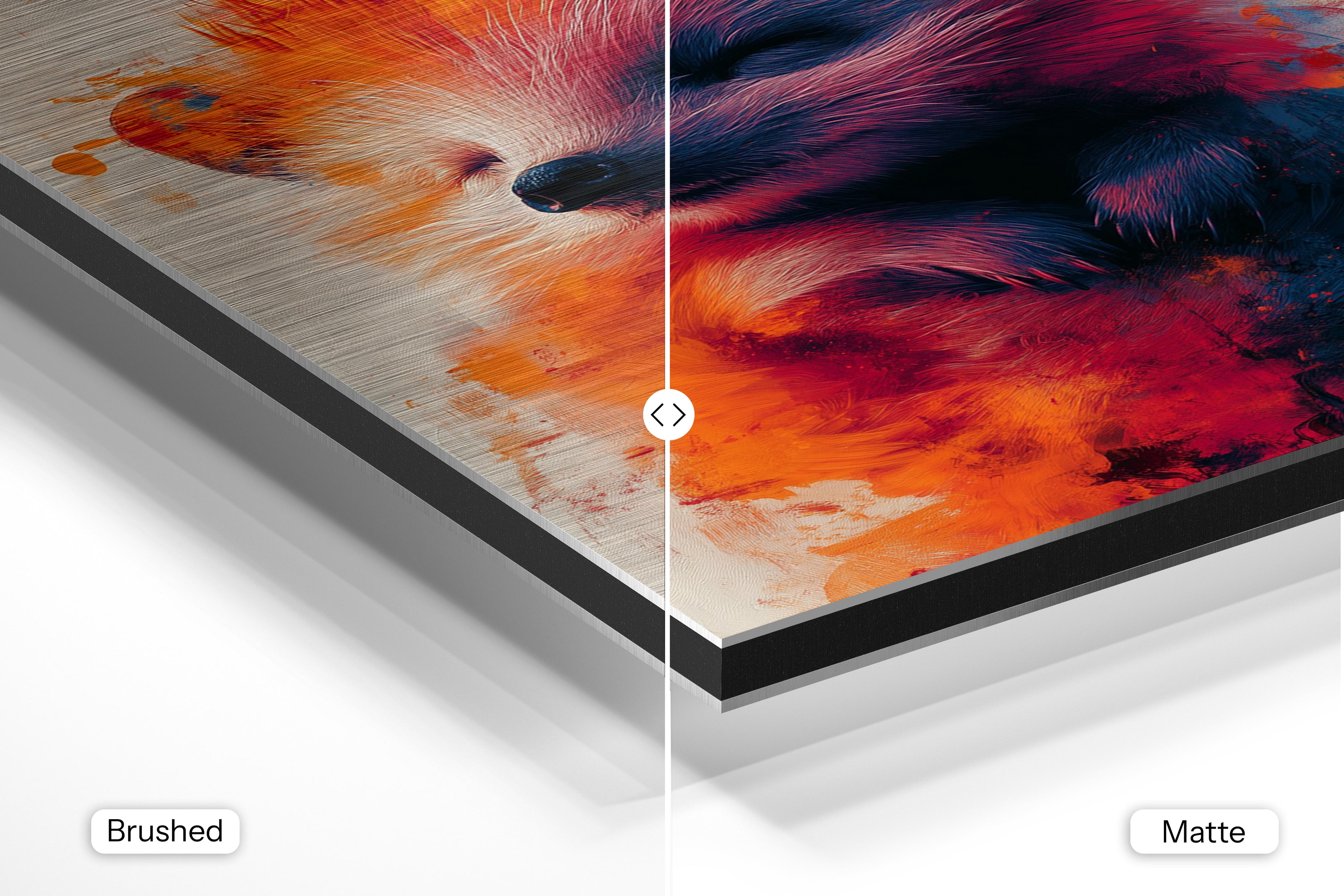 - Brushed Aluminum, on the other hand, features a raw metallic texture with visible brush strokes. Whites and highlights in your image let the silver surface show through, adding a dramatic, shimmering effect. Ideal for black-and-white images, minimalist designs, or abstract art, it creates a bold, industrial vibe with a modern edge.