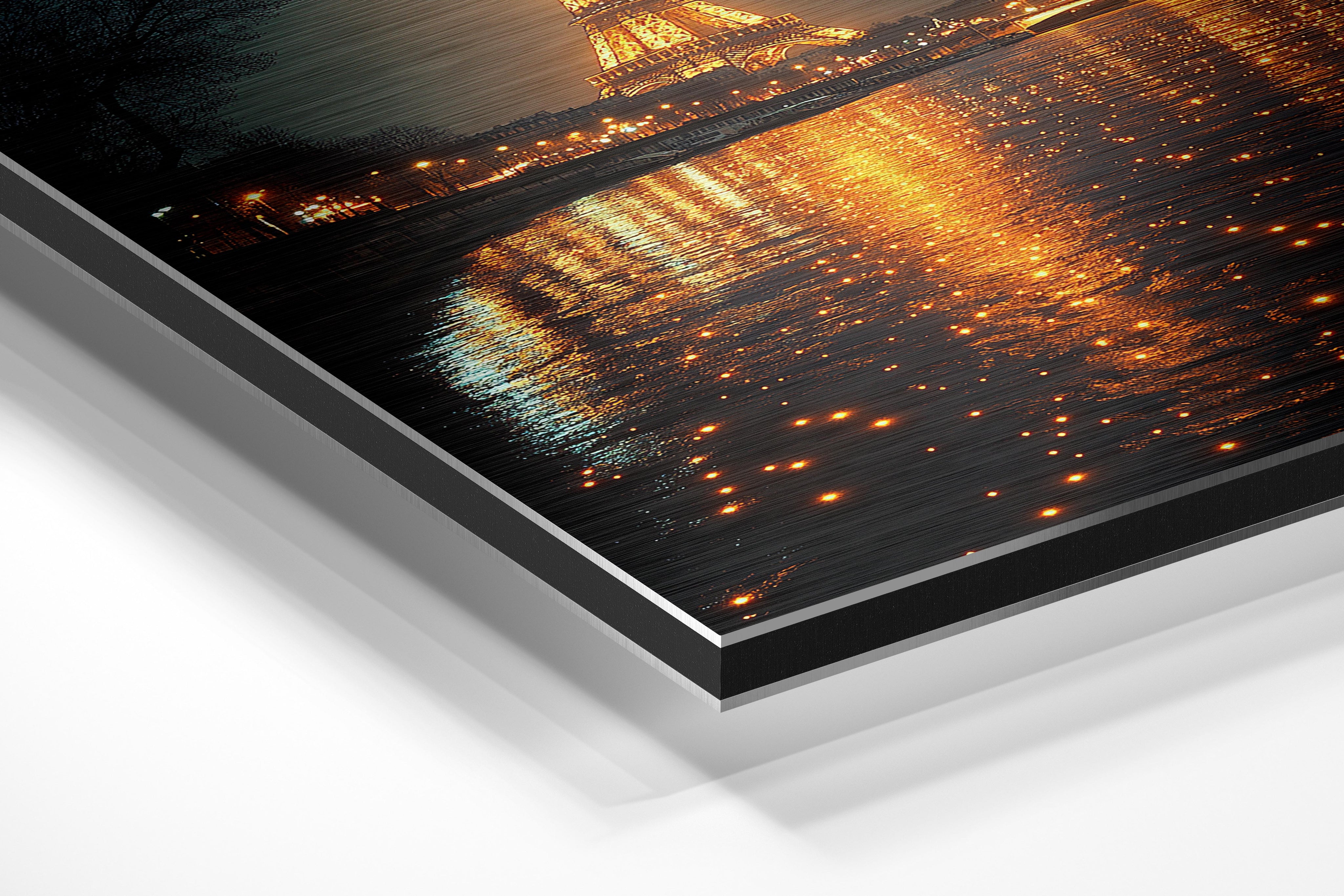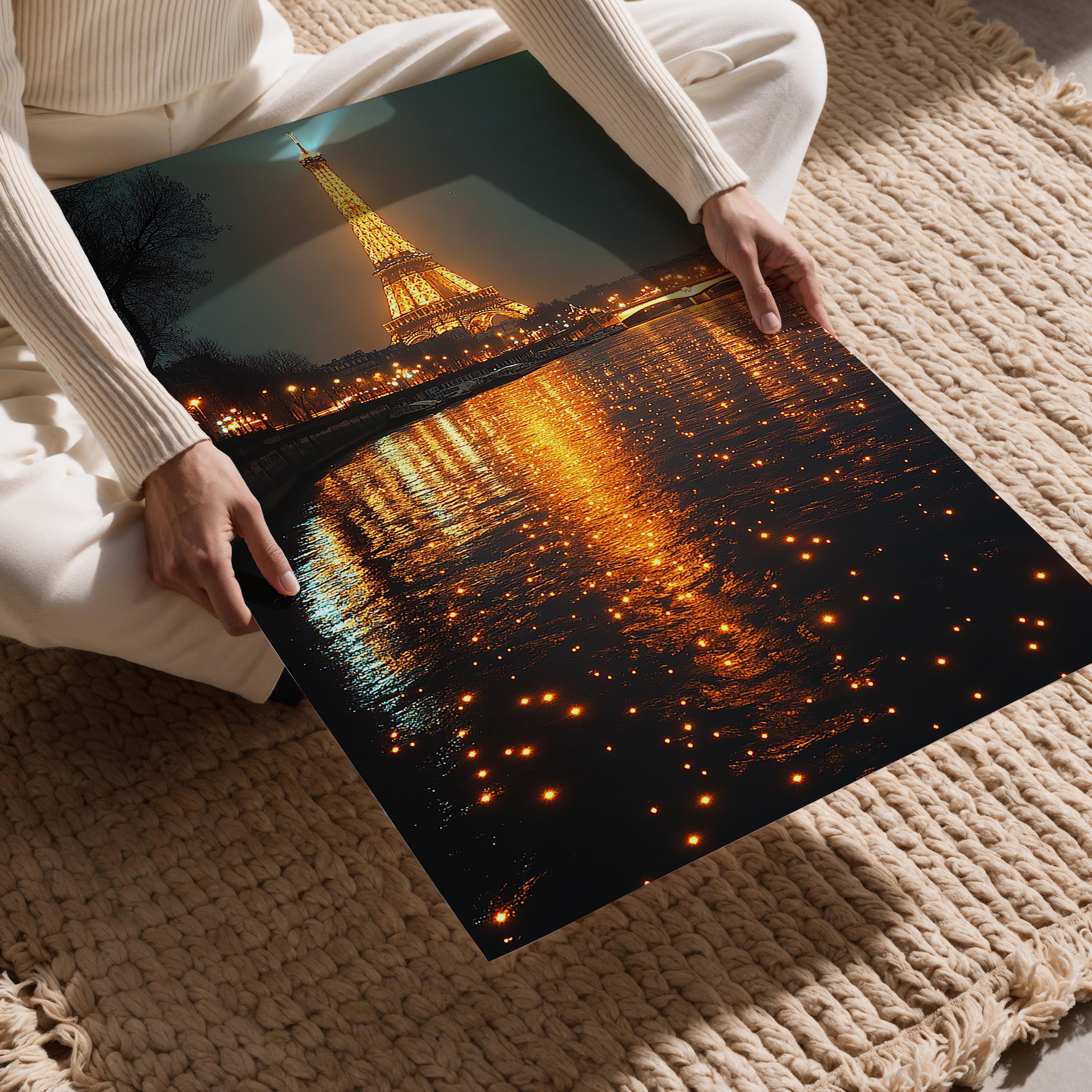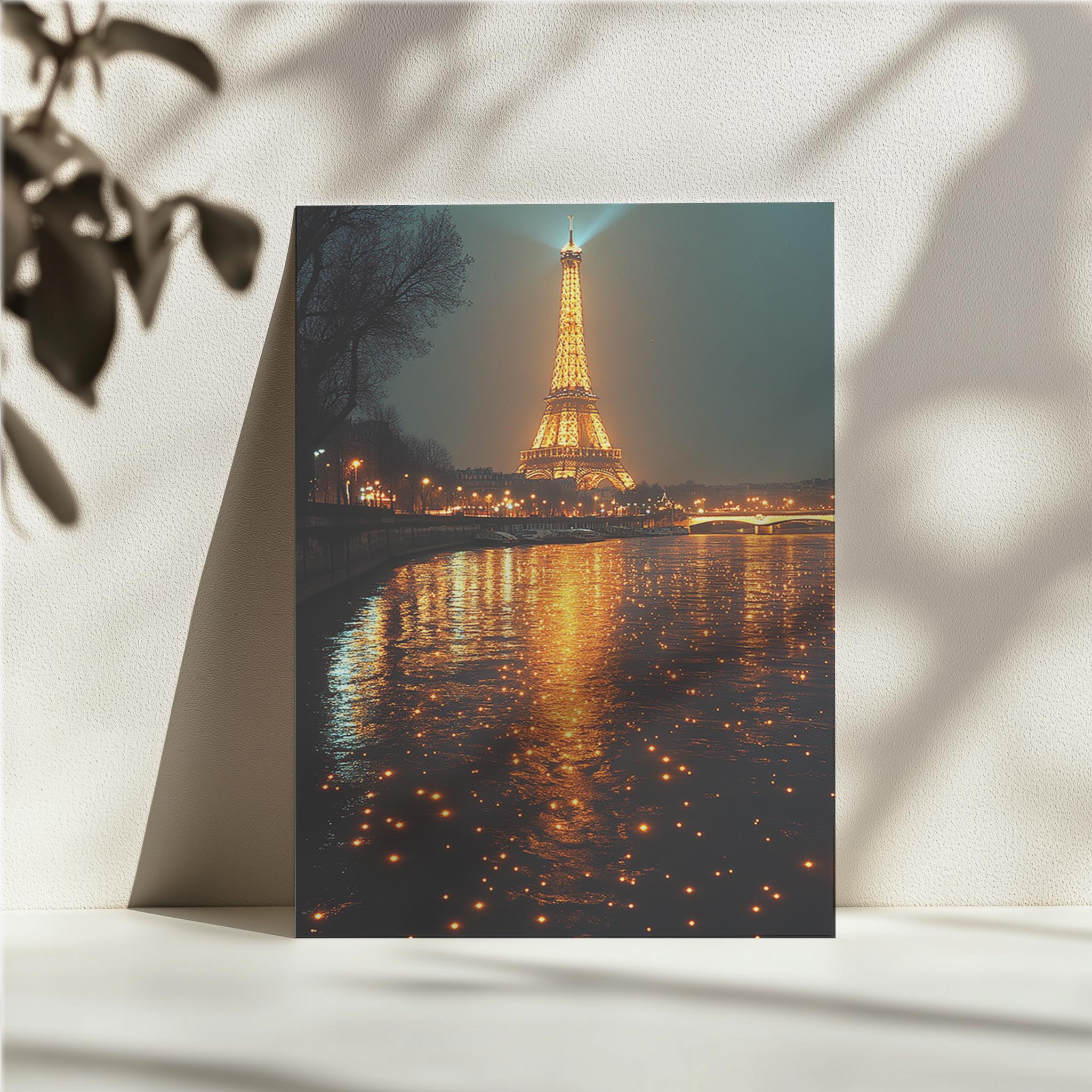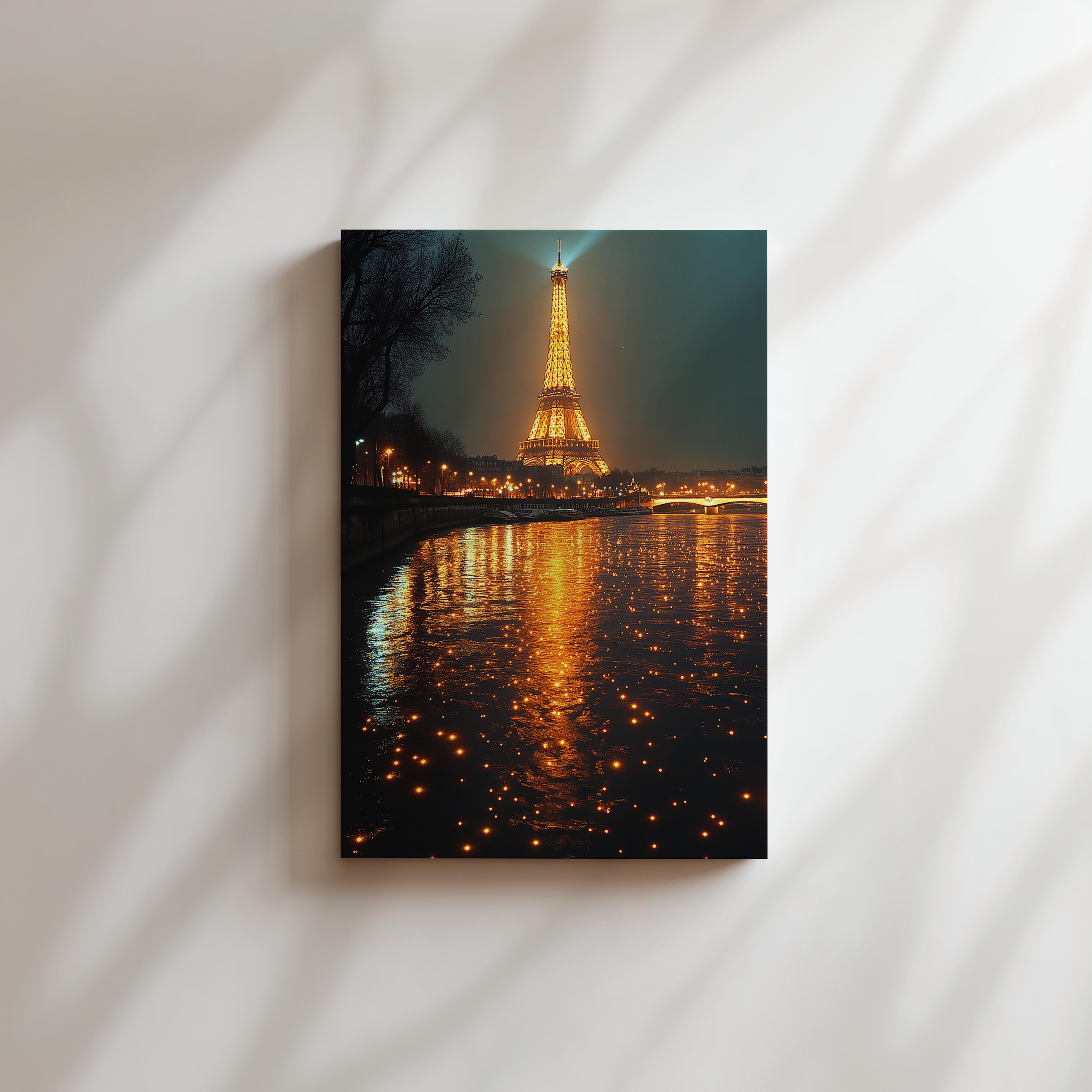 This image features the Eiffel Tower glowing magnificently at night, its golden lights shimmering on the water's surface. The ethereal ambiance makes it an excellent choice for lovers of Paris or anyone wishing to evoke a sense of timeless romance. The soft reflections and stunning contrast between light and shadow create a visually enchanting experience. This piece suits luxurious interiors or gallery spaces seeking to capture iconic elegance, offering a window into the magic of Parisian nights.