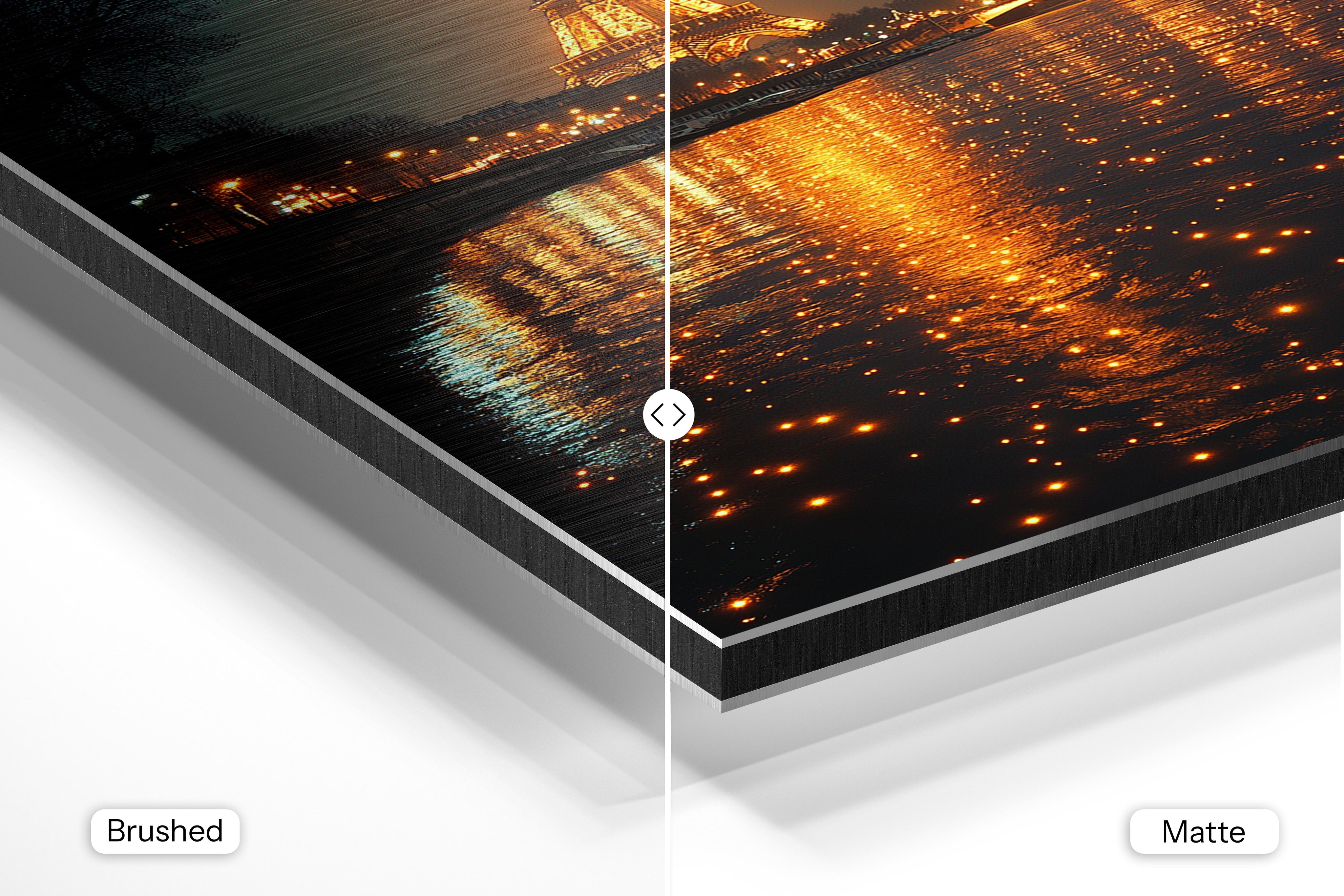 - Brushed Aluminum, on the other hand, features a raw metallic texture with visible brush strokes. Whites and highlights in your image let the silver surface show through, adding a dramatic, shimmering effect. Ideal for black-and-white images, minimalist designs, or abstract art, it creates a bold, industrial vibe with a modern edge.