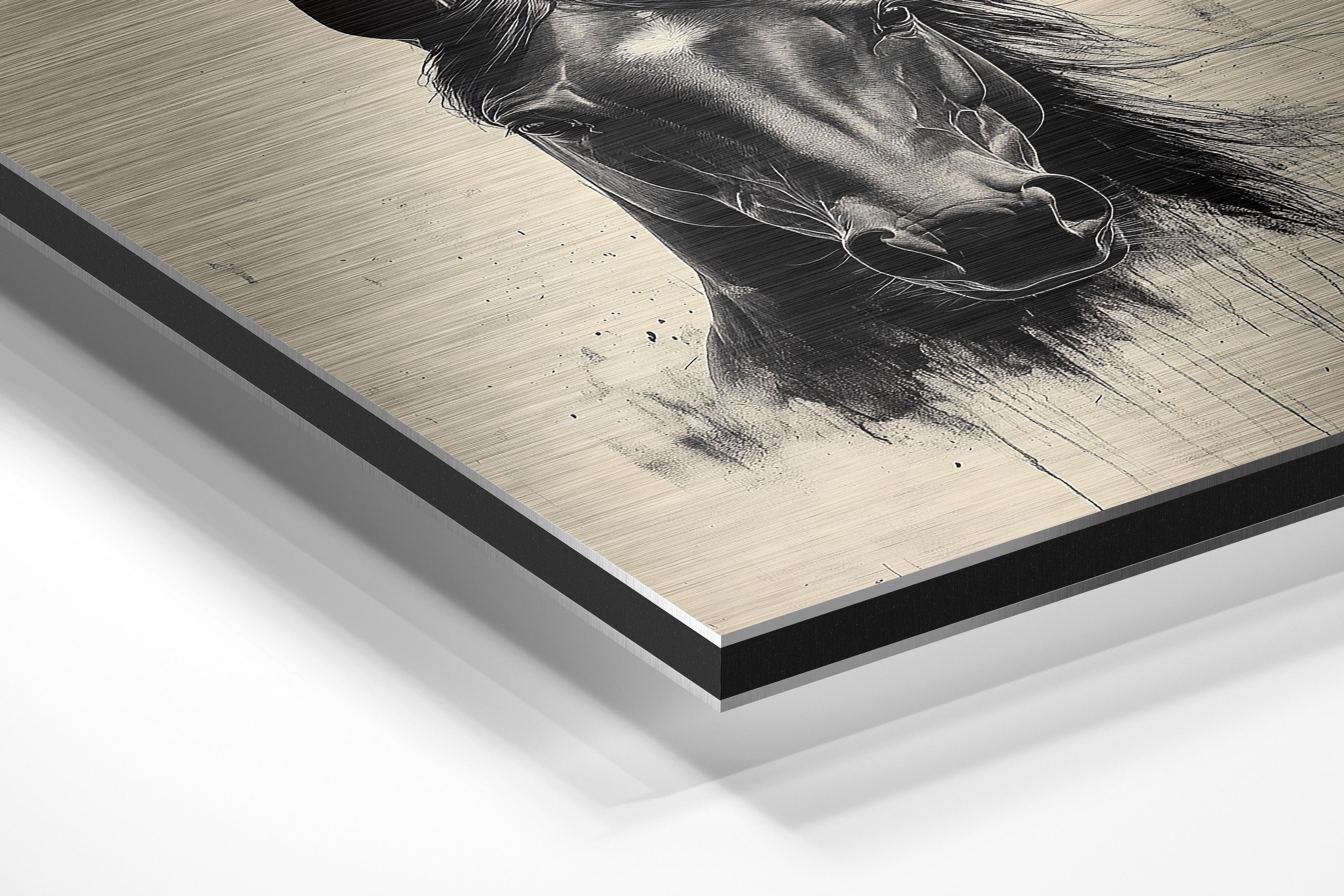 A striking monochromatic portrait of a black horse, its mane flowing elegantly as if caught in the wind. The highly detailed rendering of the horse’s face and the artistic ink-wash strokes create a dramatic, timeless effect. This piece is ideal for horse lovers, equestrian-inspired spaces, or those seeking a bold and elegant artwork for their walls.